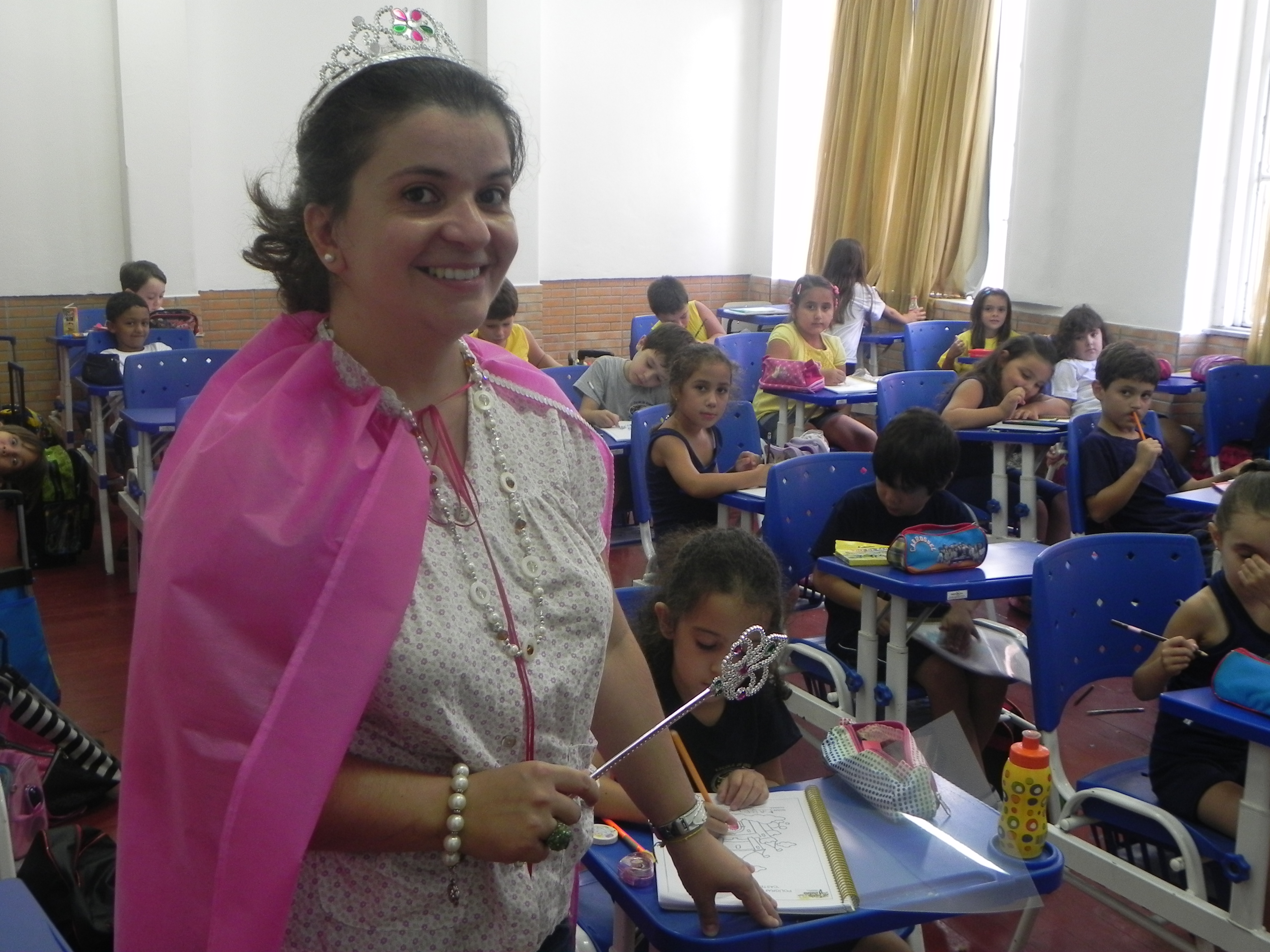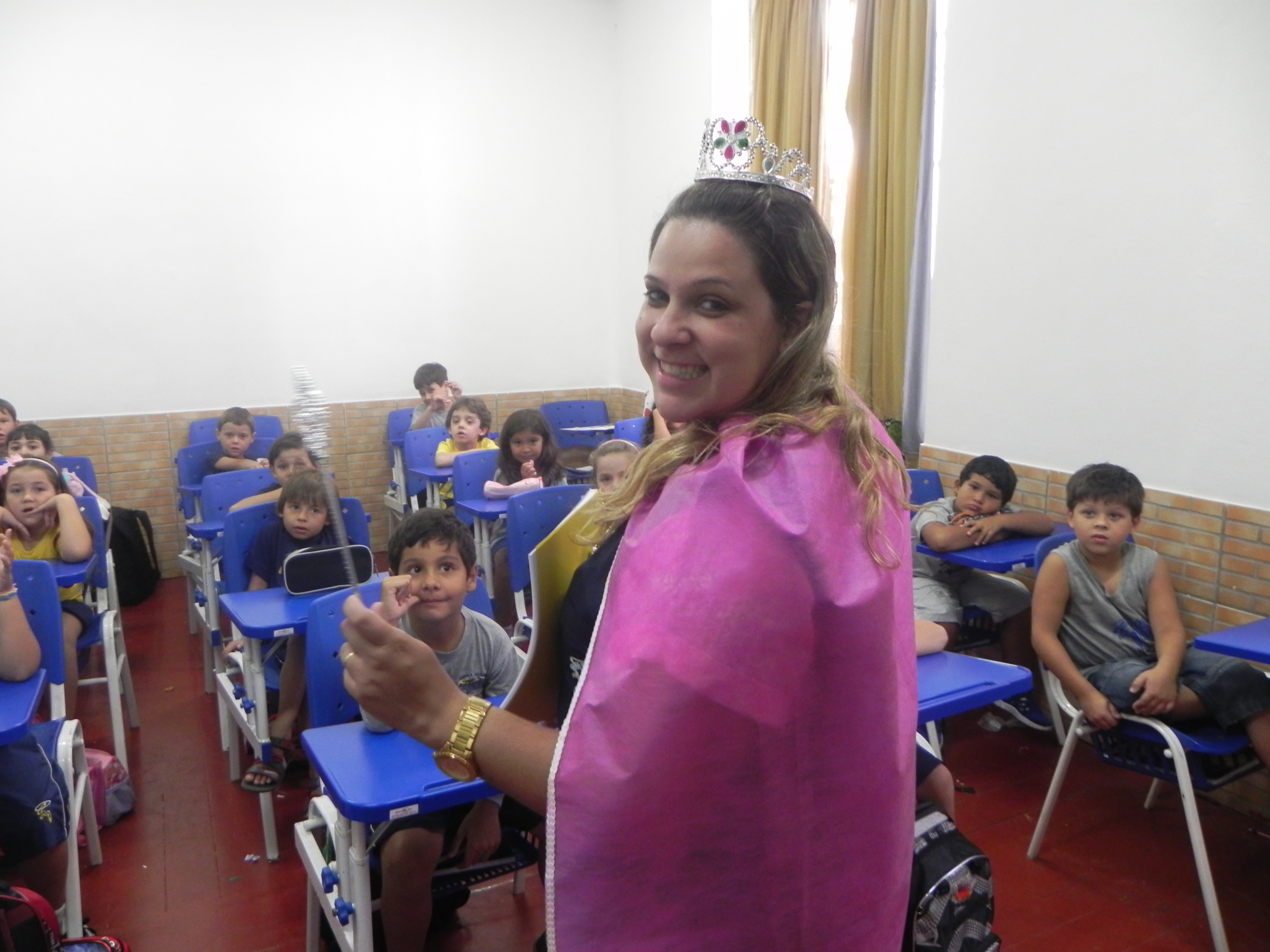 Os aluninhos do 1° ano do fundamental estão sendo inseridos no mundo das letras de uma forma bem divertida e mágica. As professoras se vestiram como rainhas, definiram os alunos como príncipes e princesas e contaram uma história bem divertida para os seus alunos. Assim fica fácil de aprender.