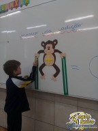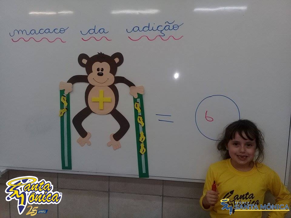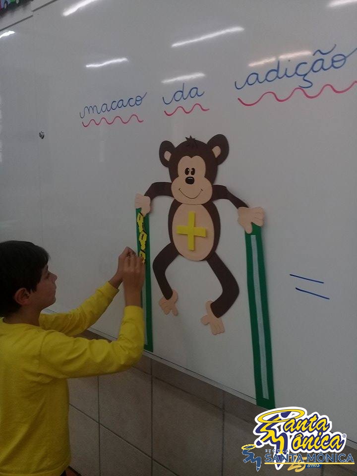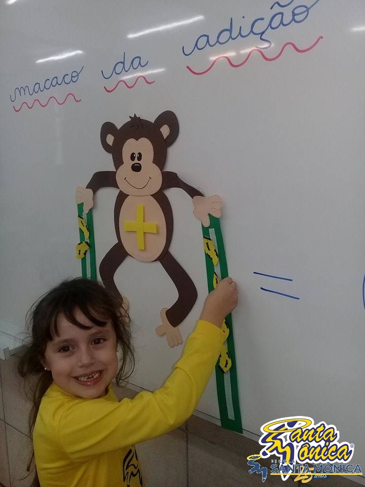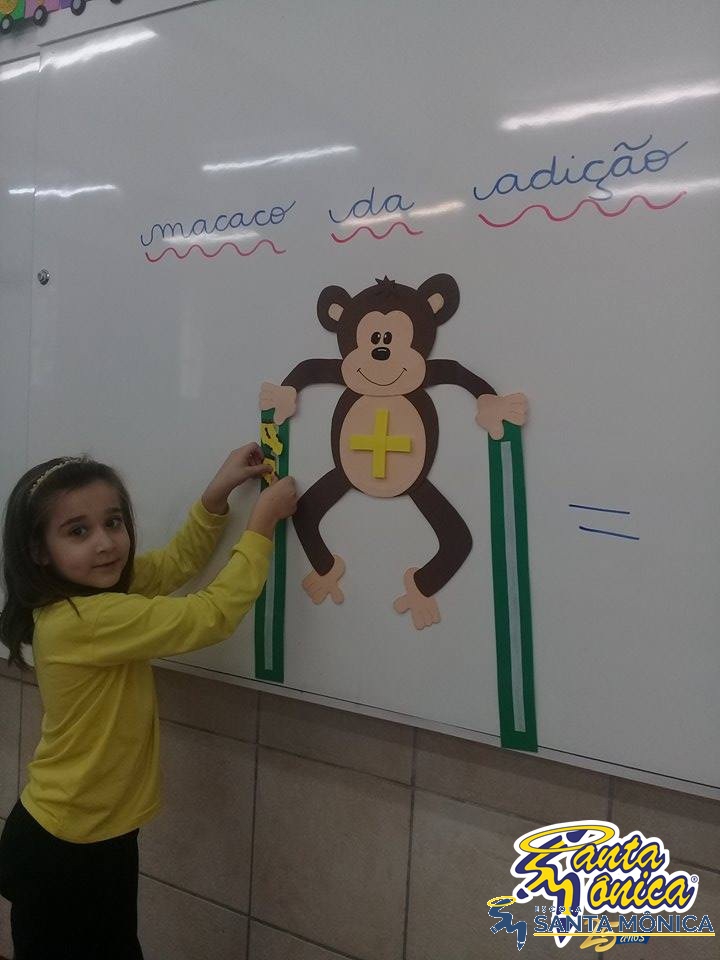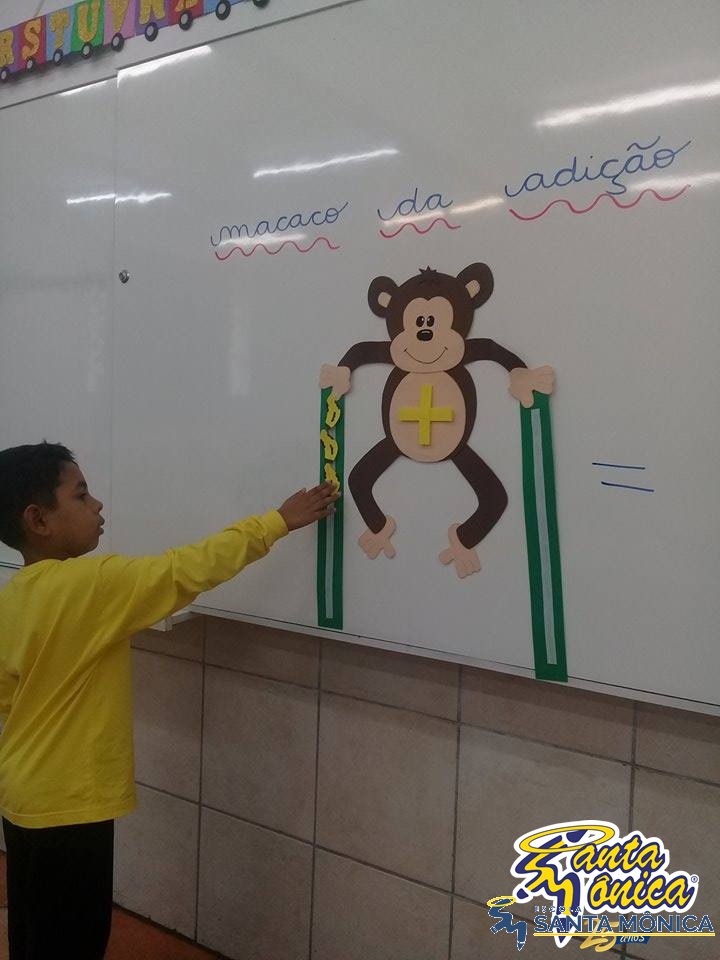 Os alunos do primeiro ano estão aprendendo contas de adição simples.Para isso tiveram a ajuda de um macaco muito fofinho. Os alunos somaram a quantidade de bananas que o macaco estava carregando, desenvolvendo seu raciocínio lógico matemático de uma maneira divertida.