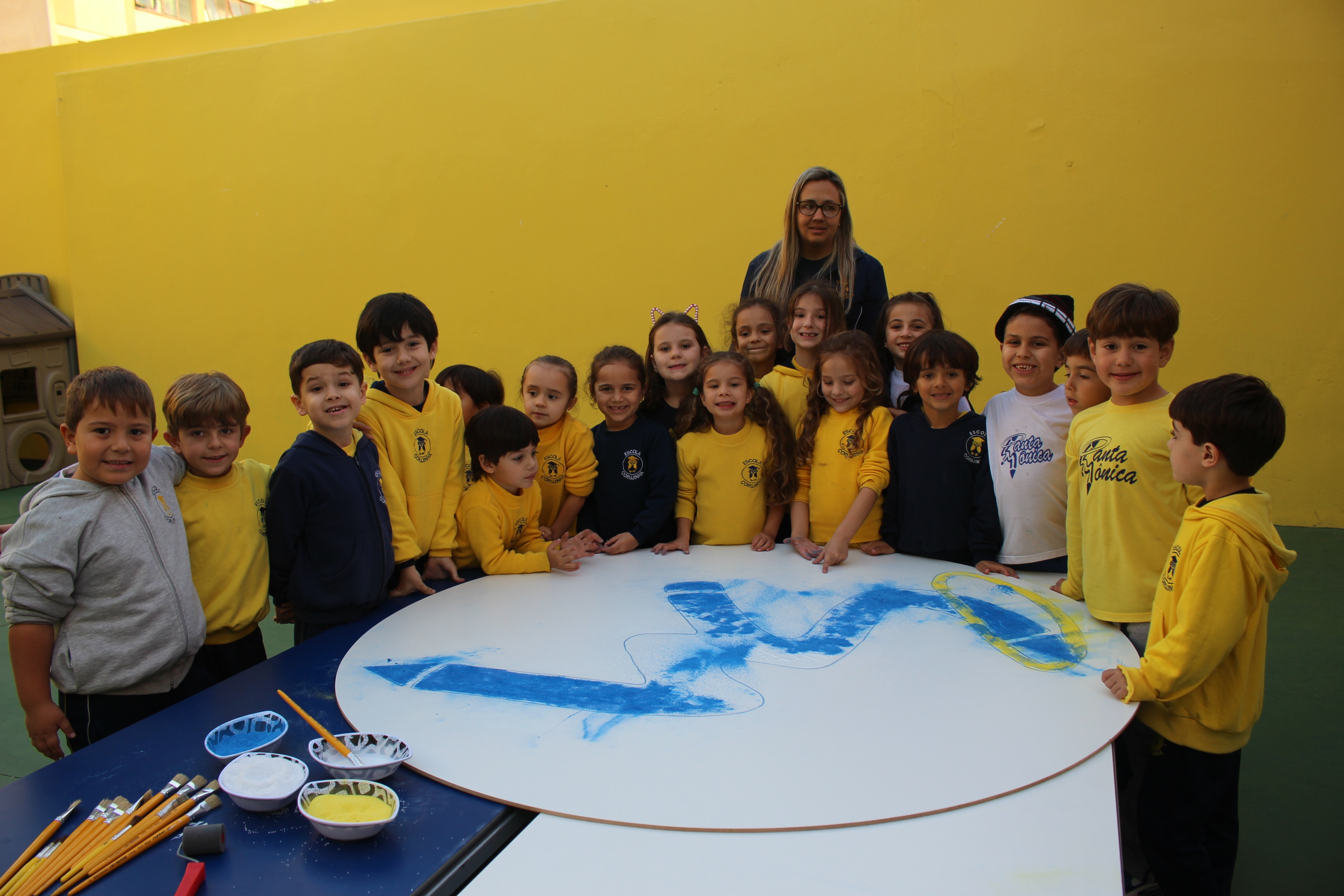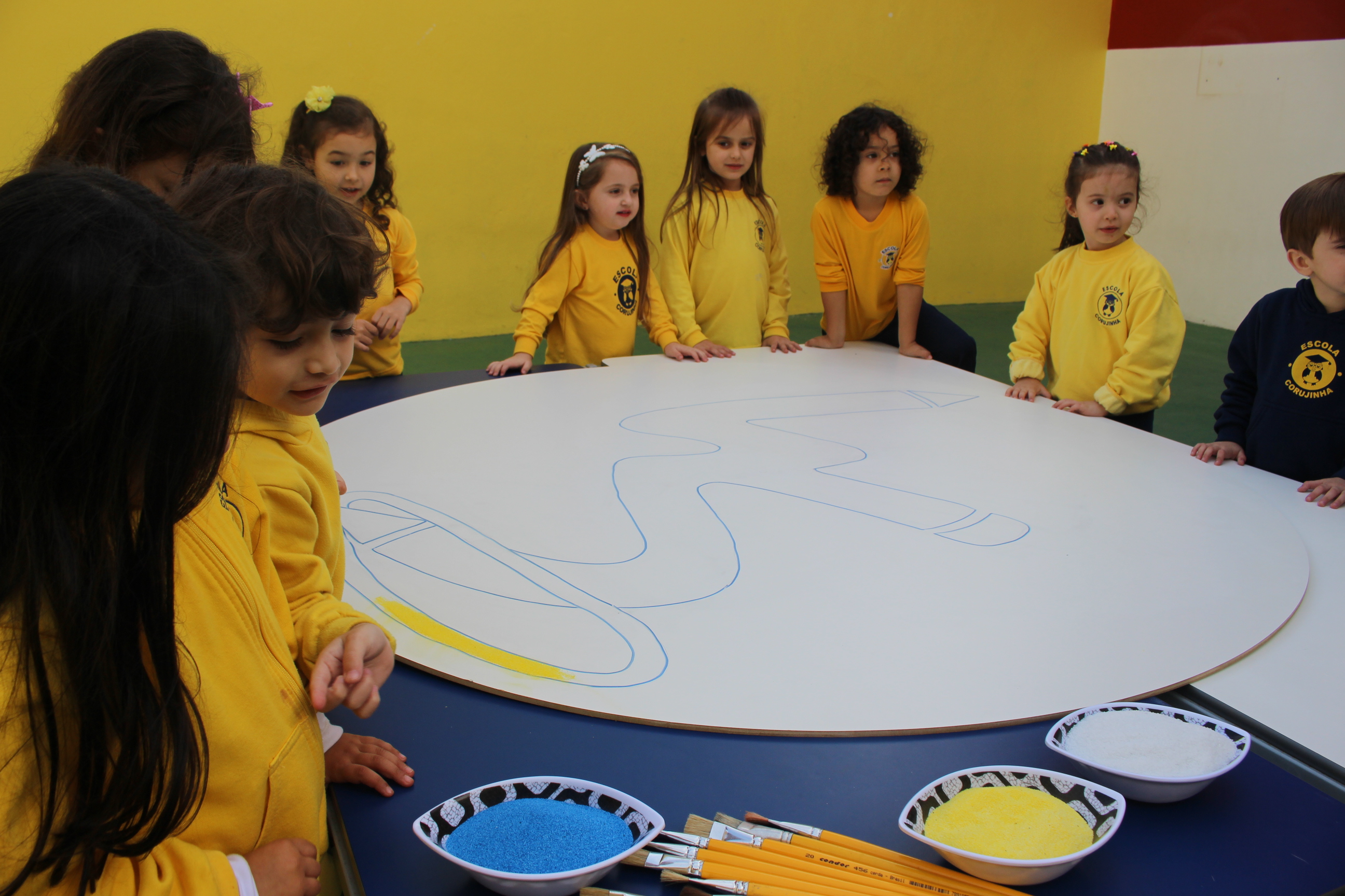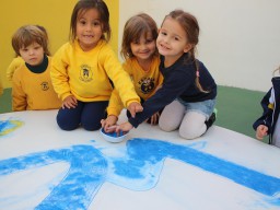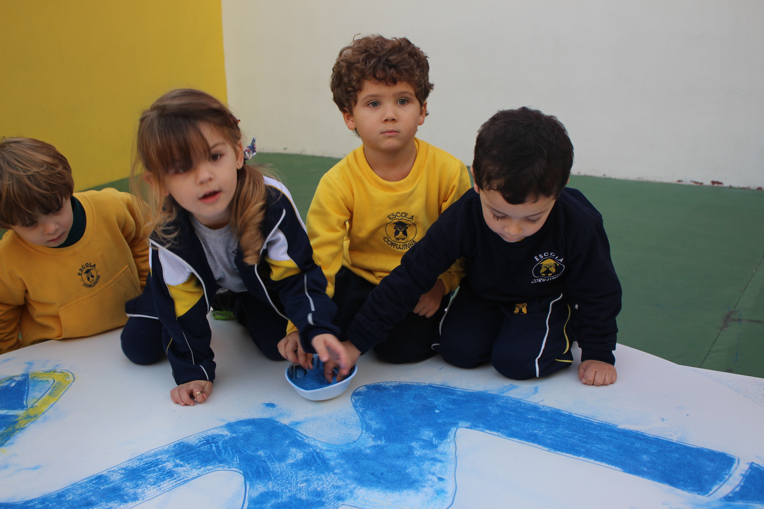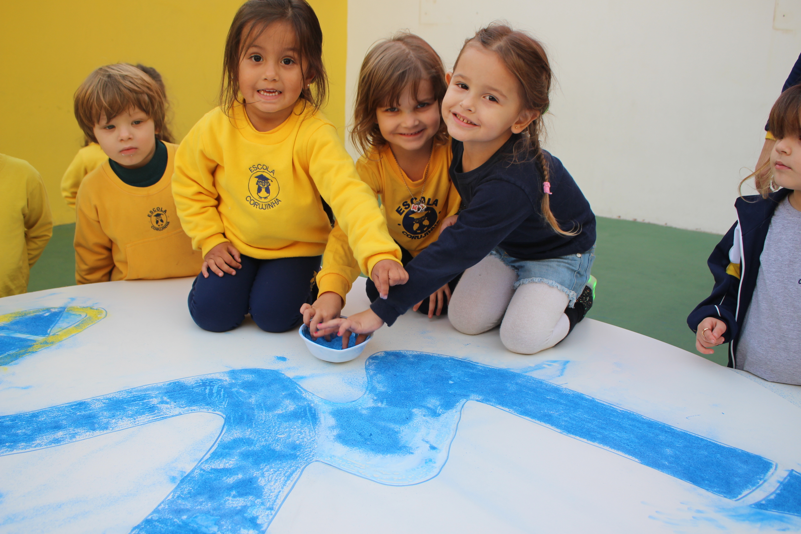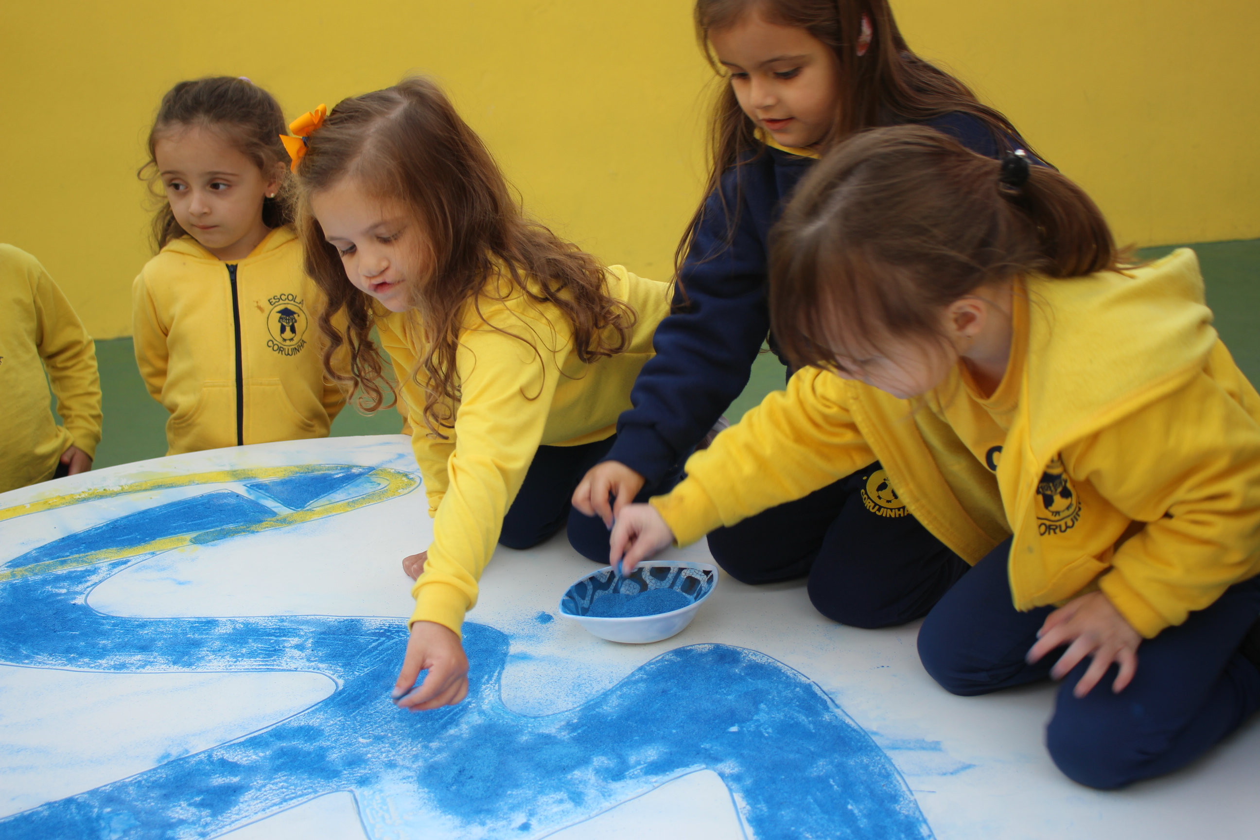 Os pequenos da Escola Corujinha se empenharam bastante para entregar um presente especial para a querida Escola Santa Mônica. Eles se divertiram muito utilizando areia colorida para decorar o mosaico gigante com a logomarca da escola. As professoras deram uma ajudinha na preparação do presente, mas os pequenos é que fizeram a festa.