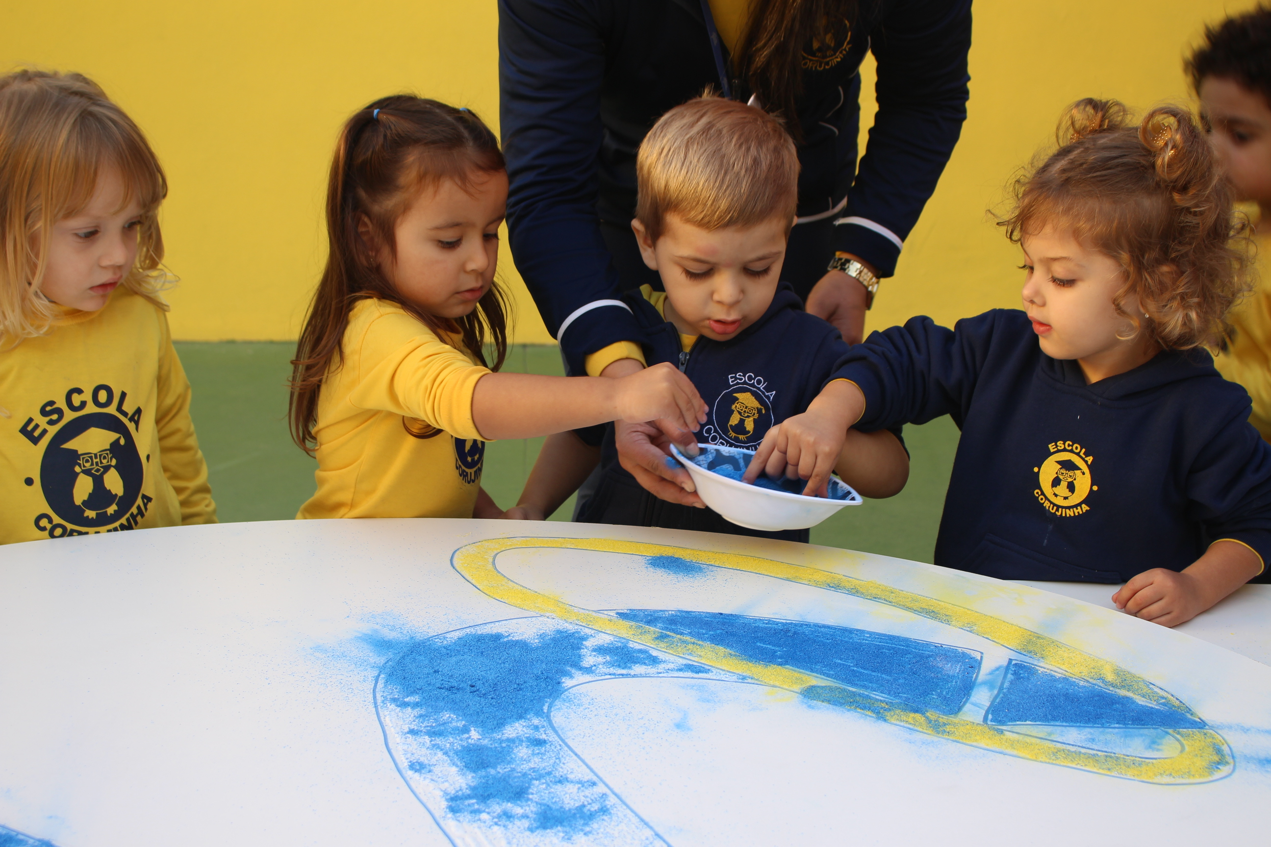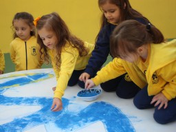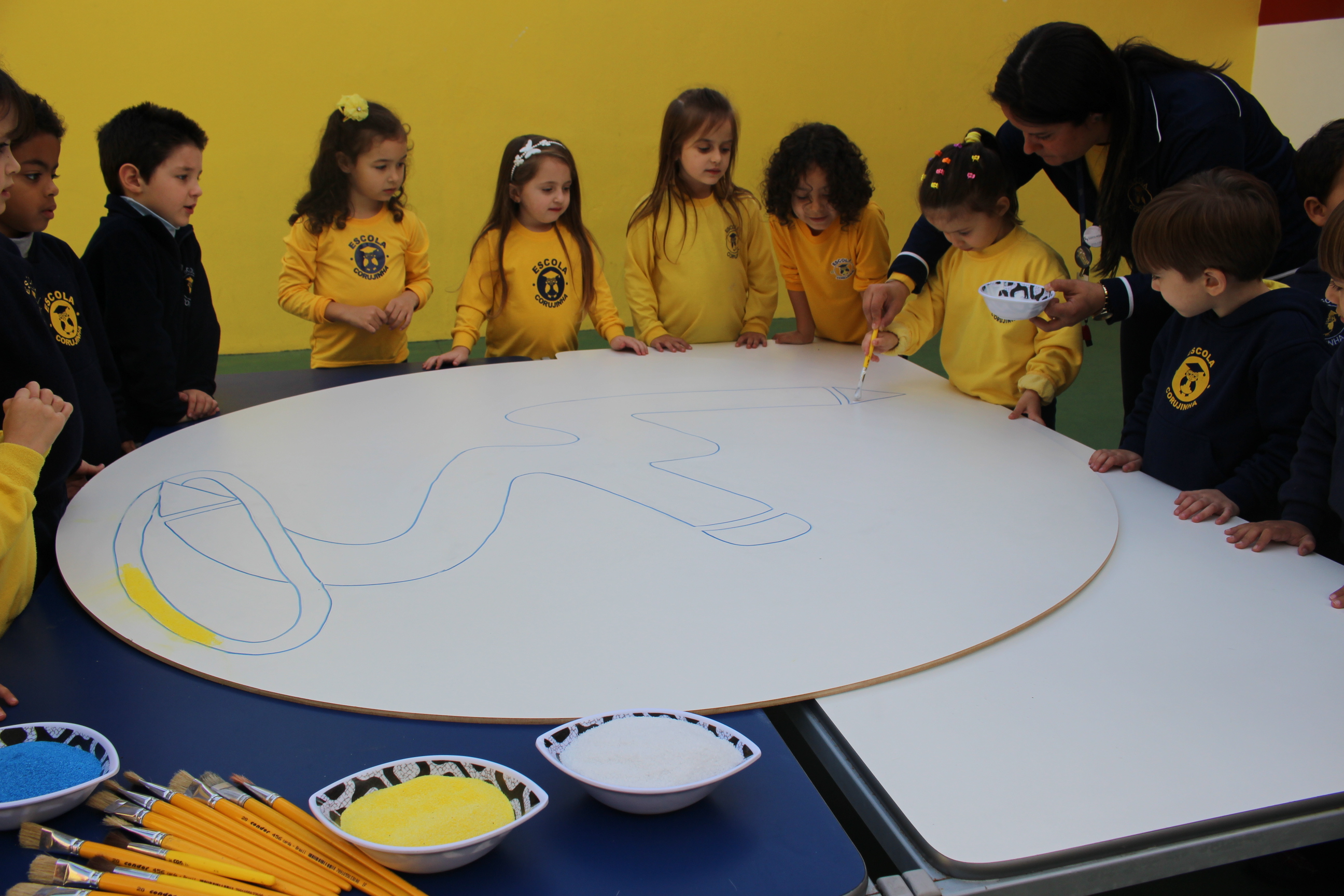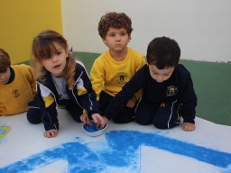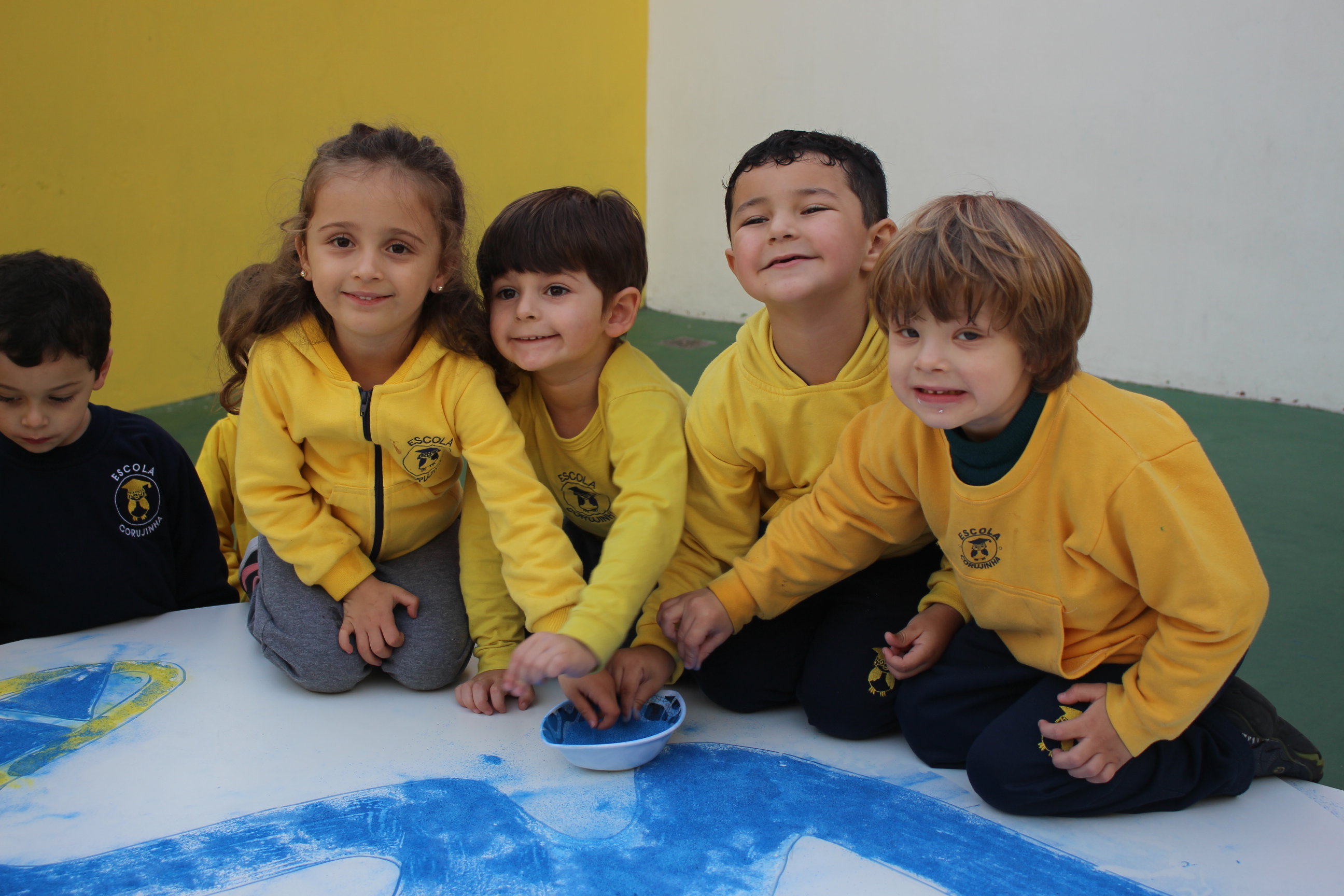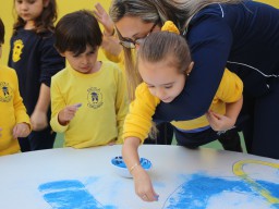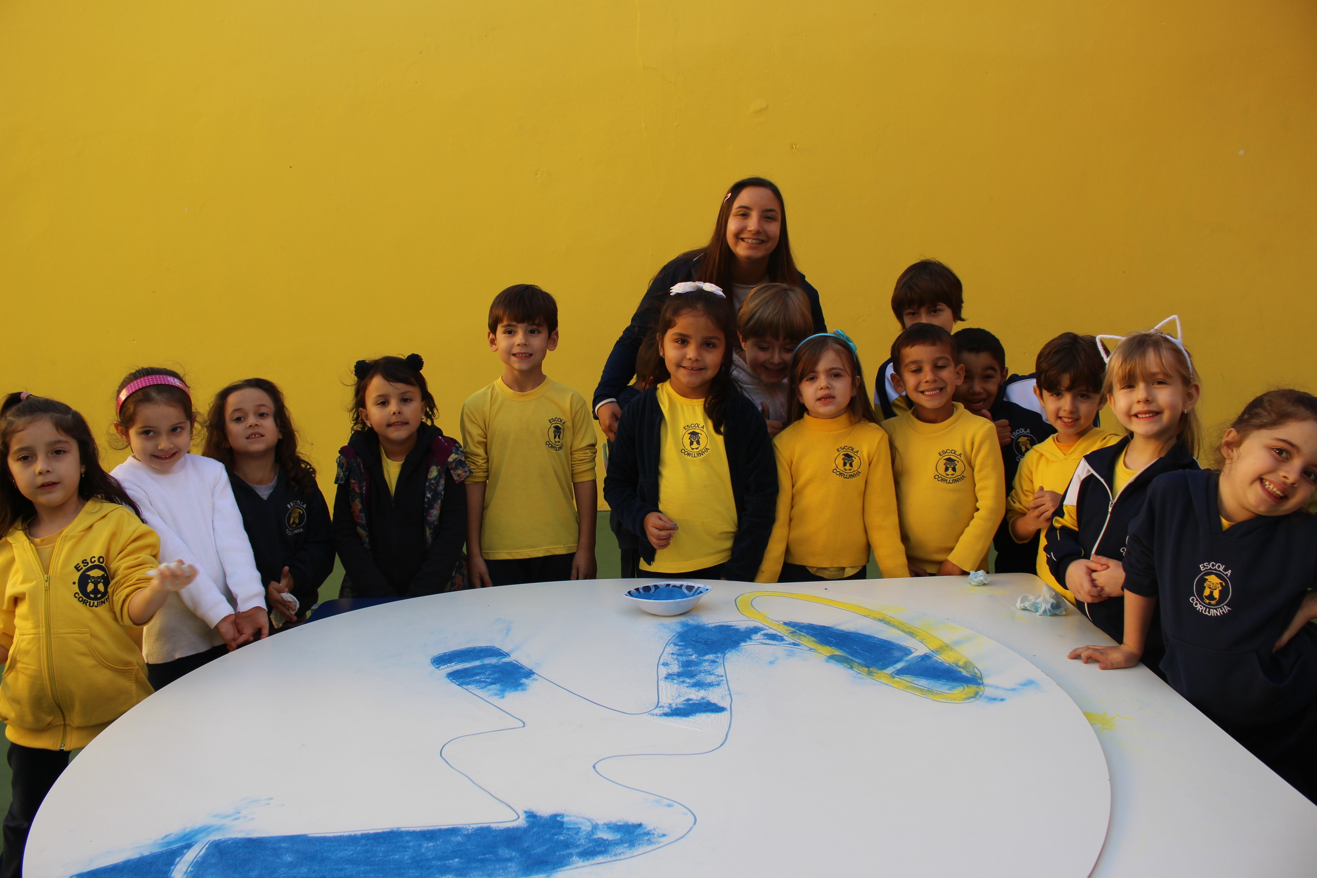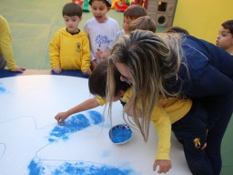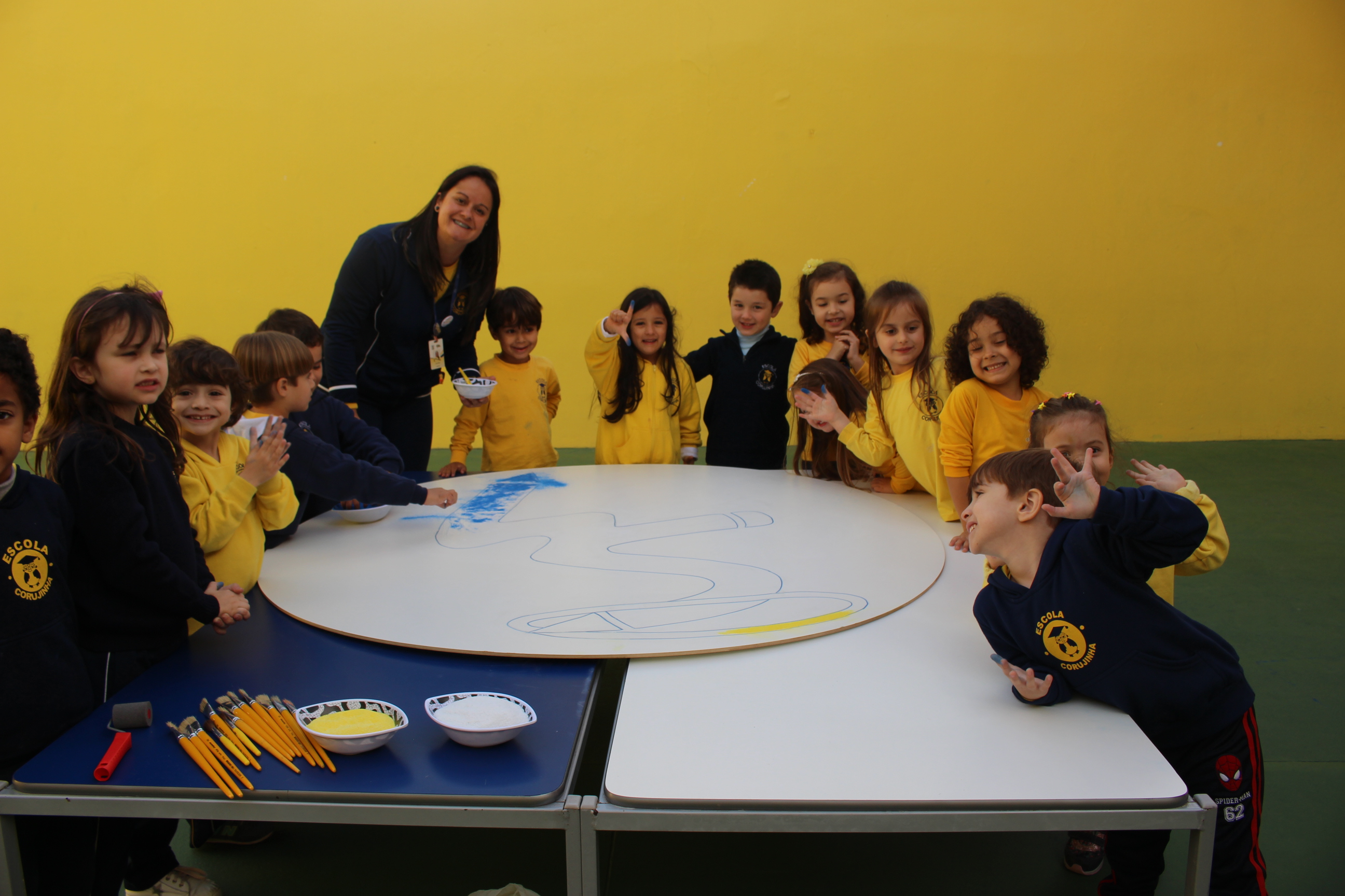Os pequenos da Escola Corujinha se empenharam bastante para entregar um presente especial para a querida Escola Santa Mônica. Eles se divertiram muito utilizando areia colorida para decorar o mosaico gigante com a logomarca da escola. As professoras deram uma ajudinha na preparação do presente, mas os pequenos é que fizeram a festa.