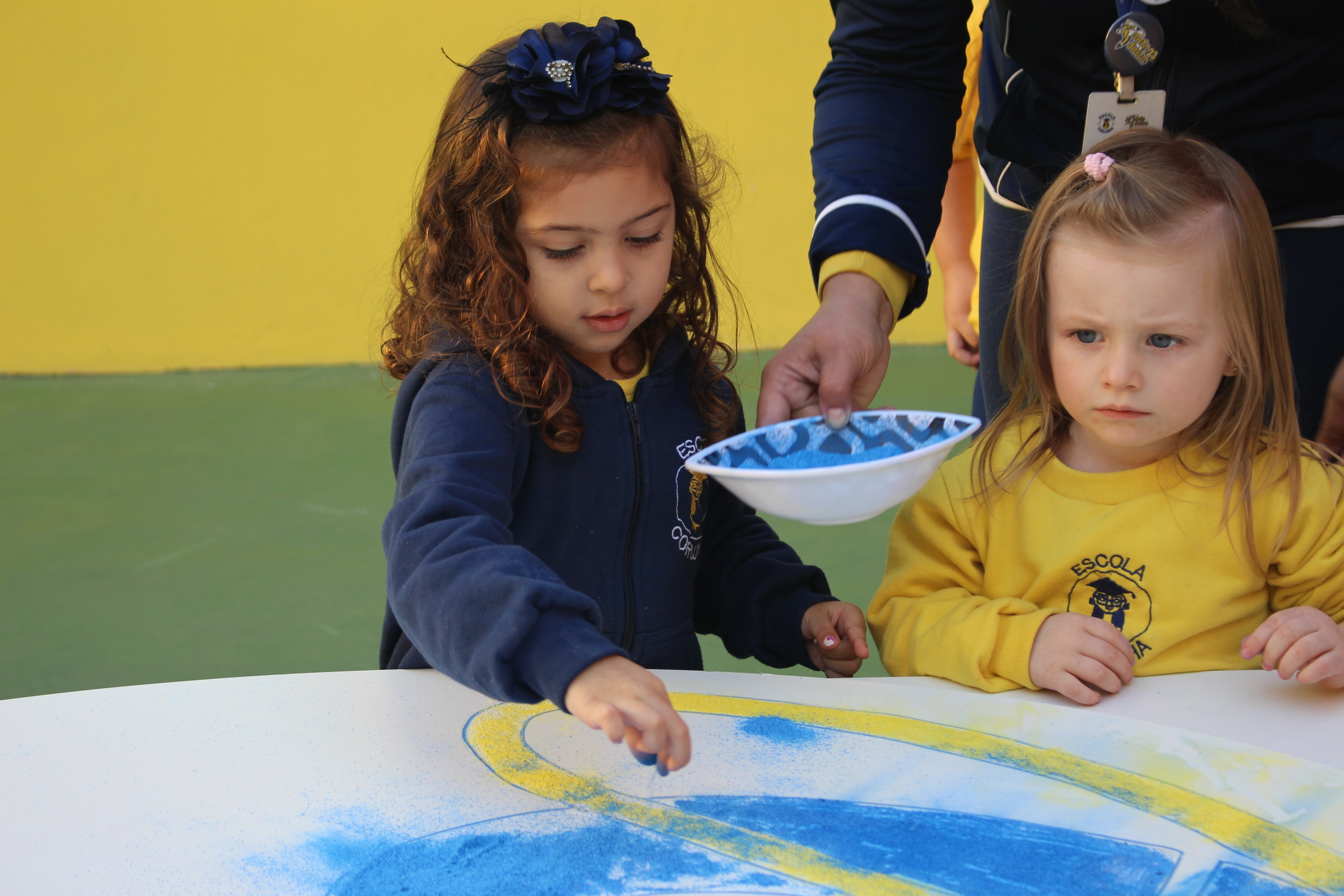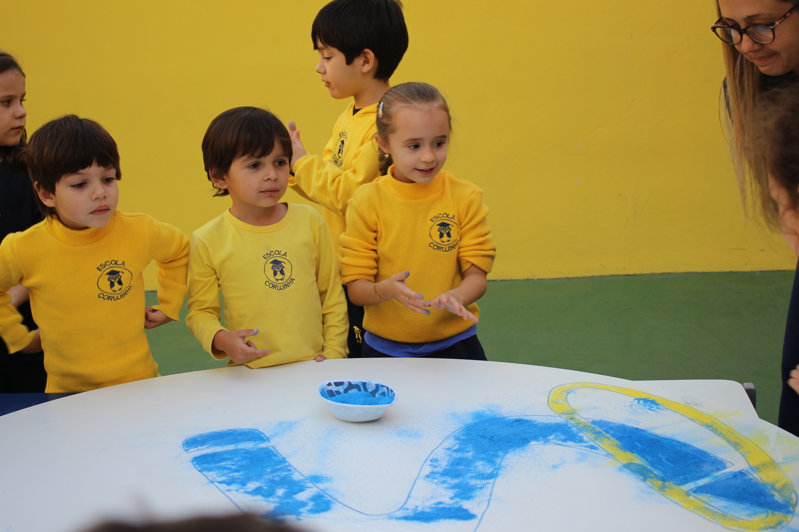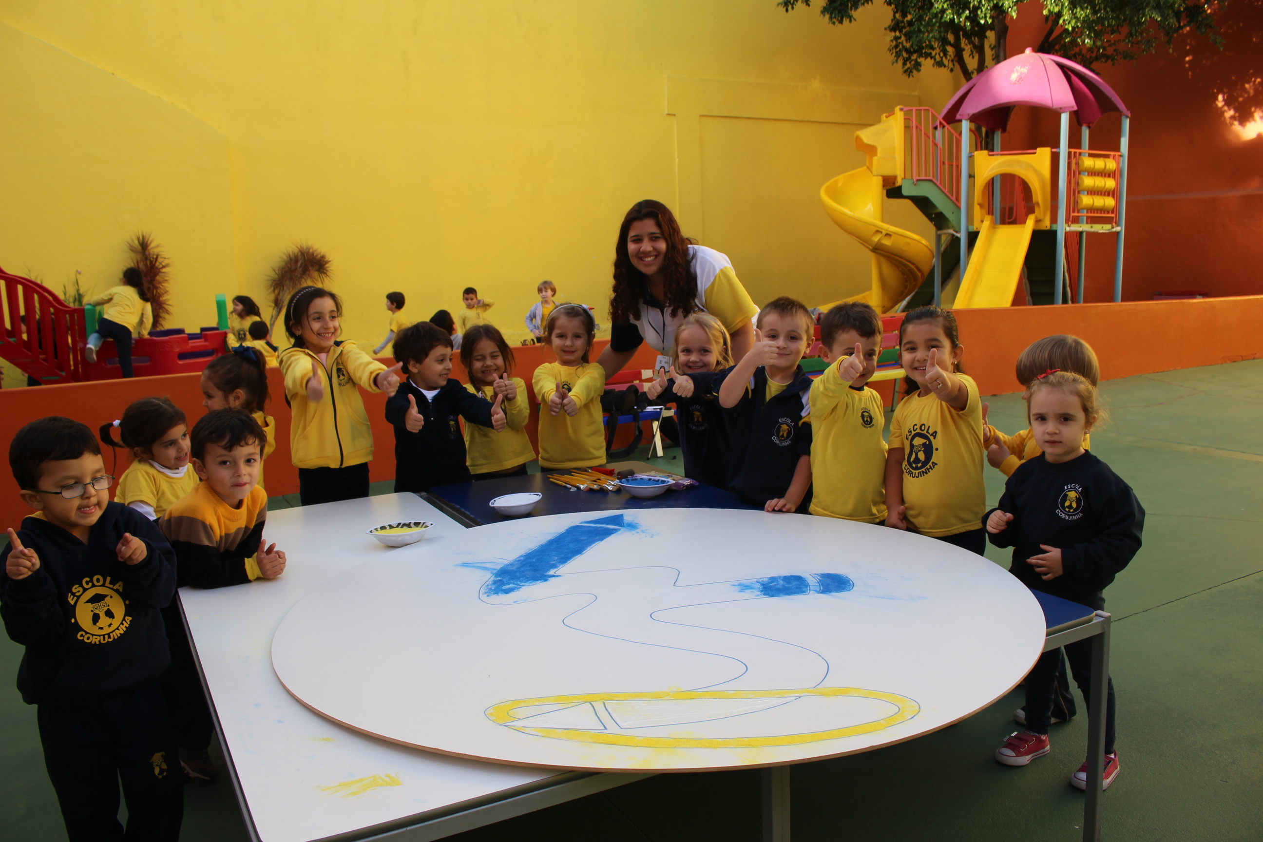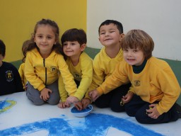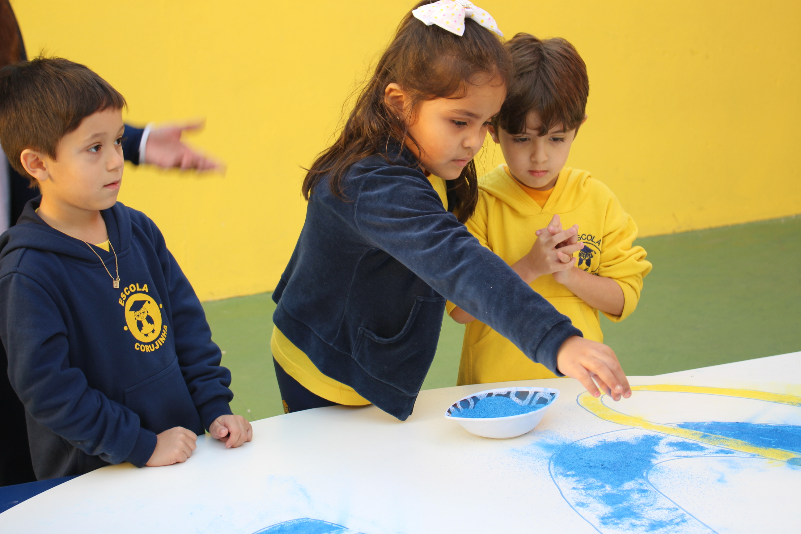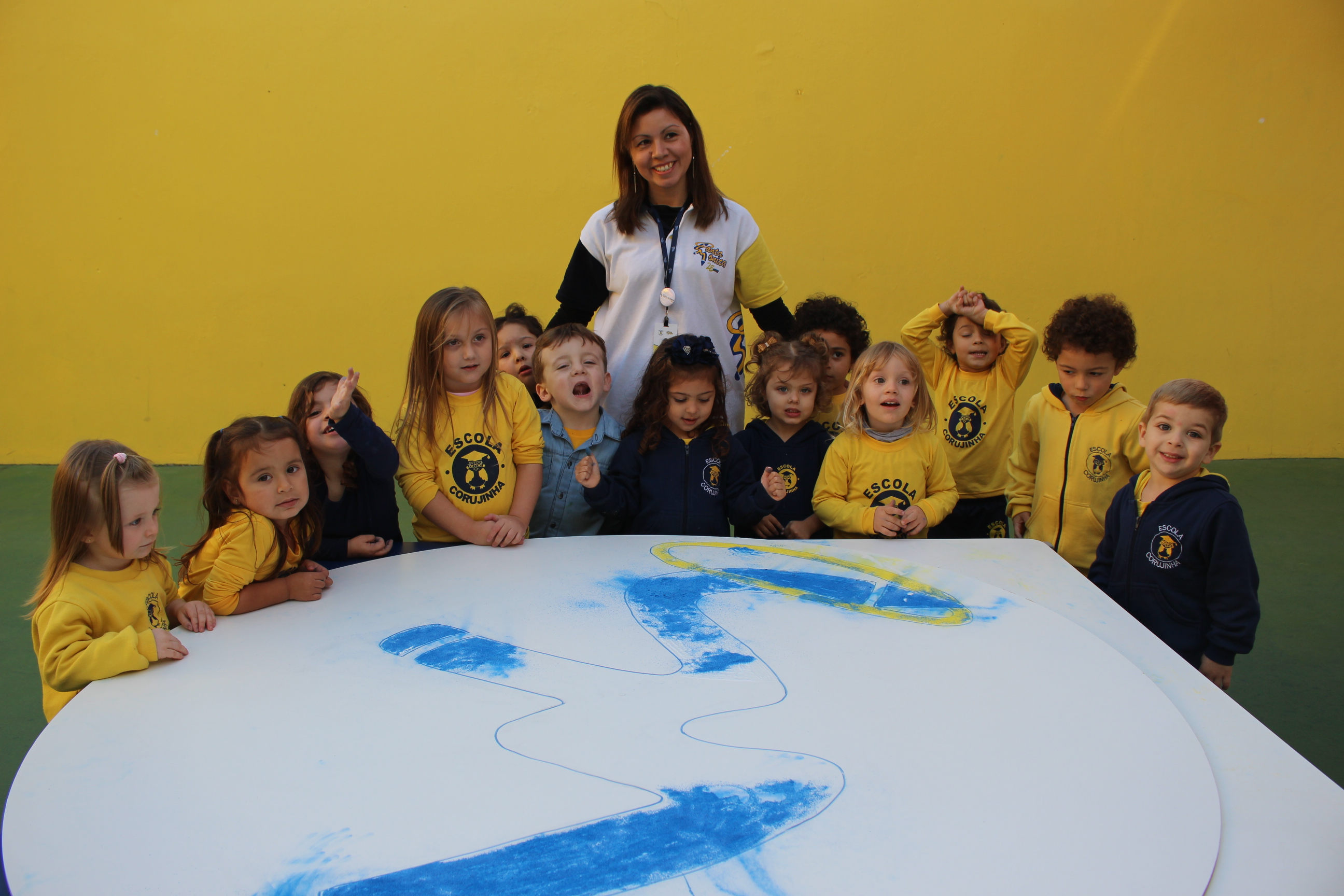 Os pequenos da Escola Corujinha se empenharam bastante para entregar um presente especial para a querida Escola Santa Mônica. Eles se divertiram muito utilizando areia colorida para decorar o mosaico gigante com a logomarca da escola. As professoras deram uma ajudinha na preparação do presente, mas os pequenos é que fizeram a festa.