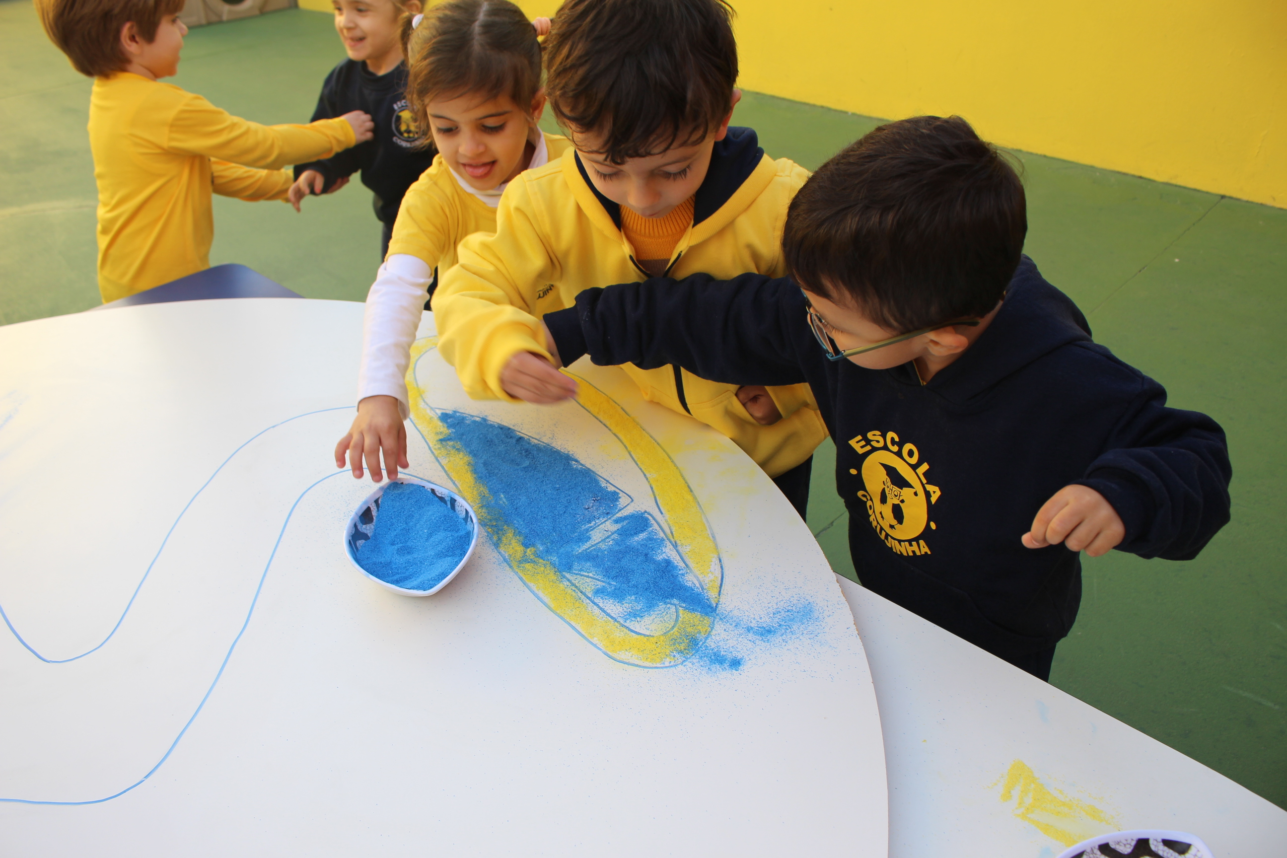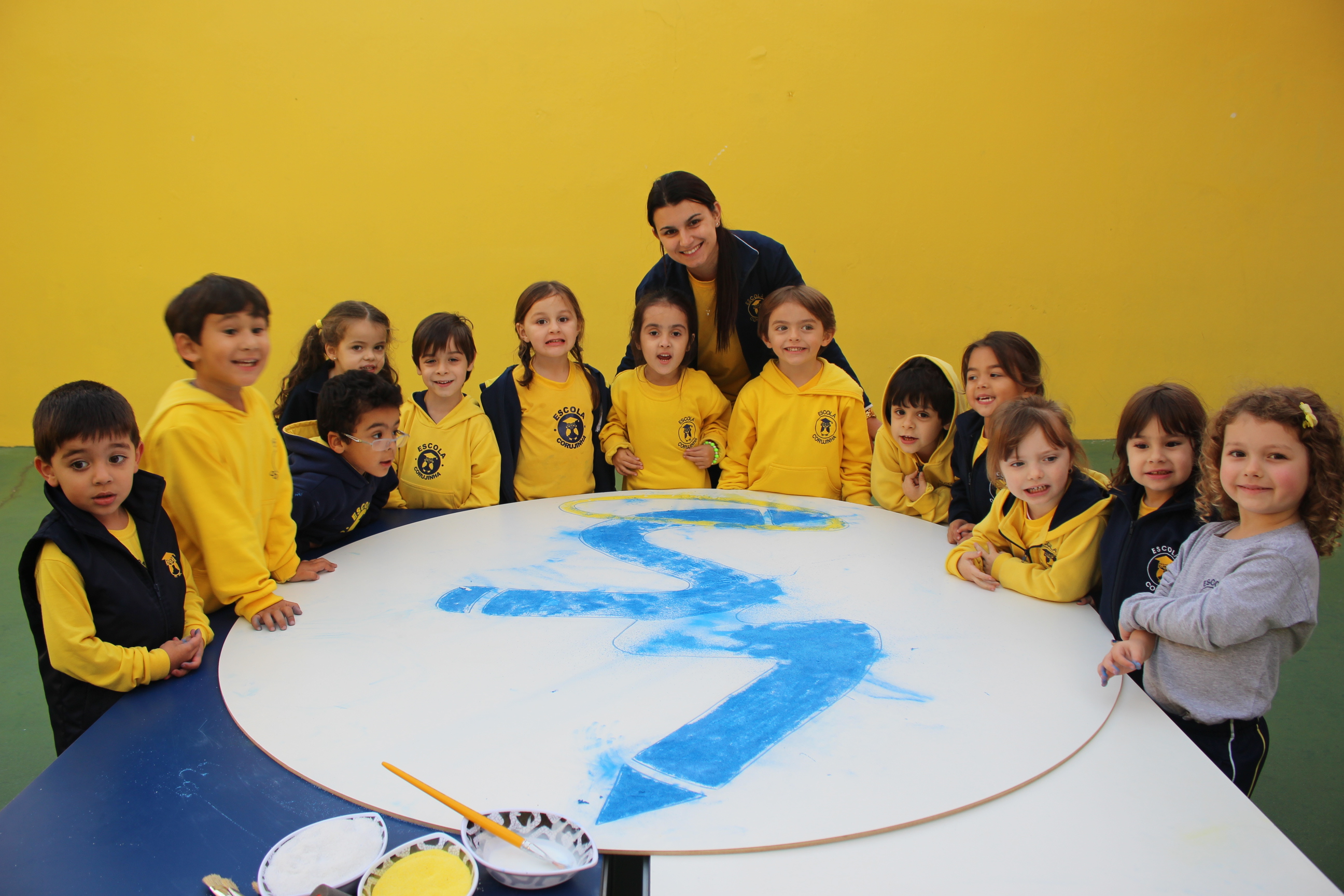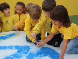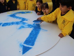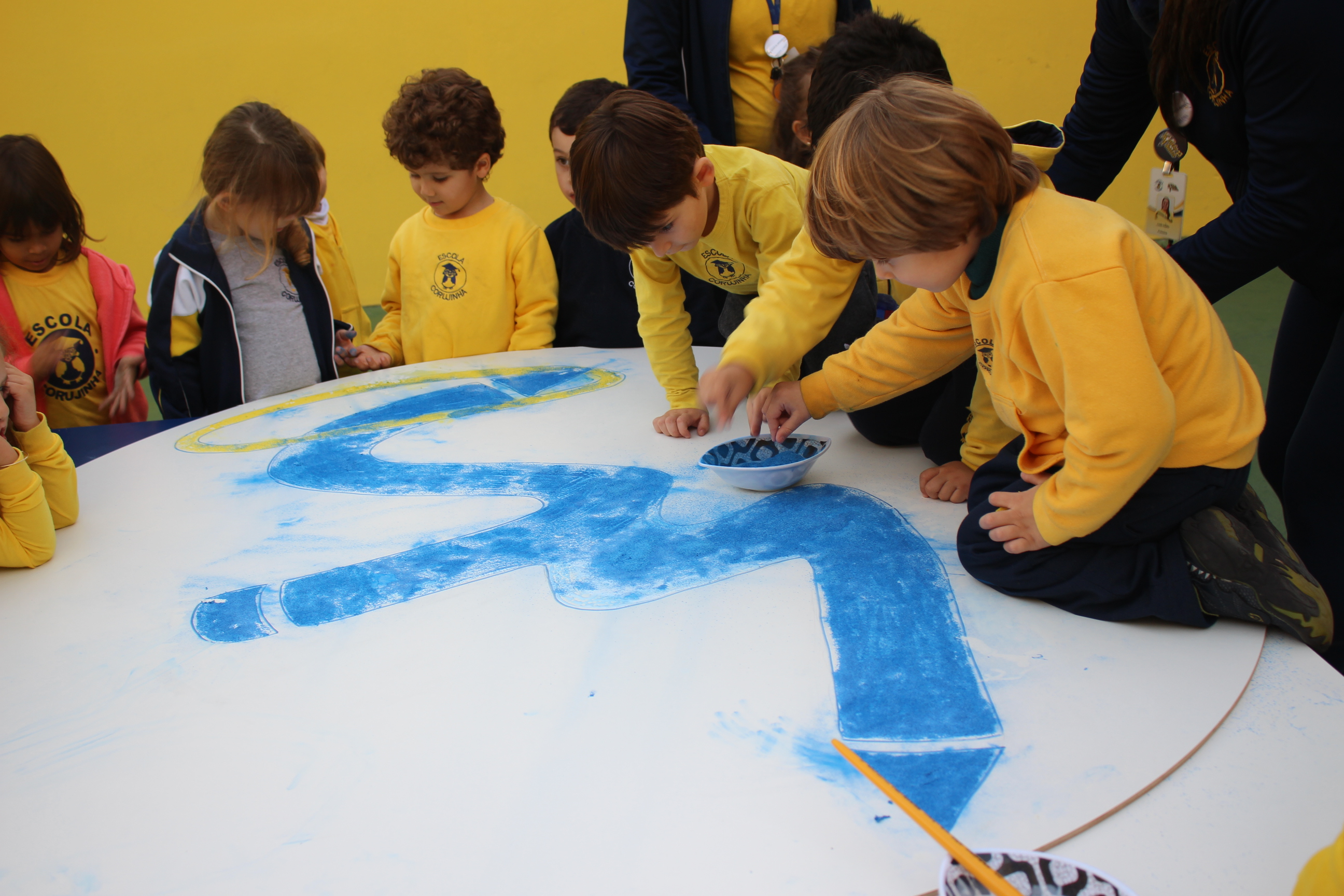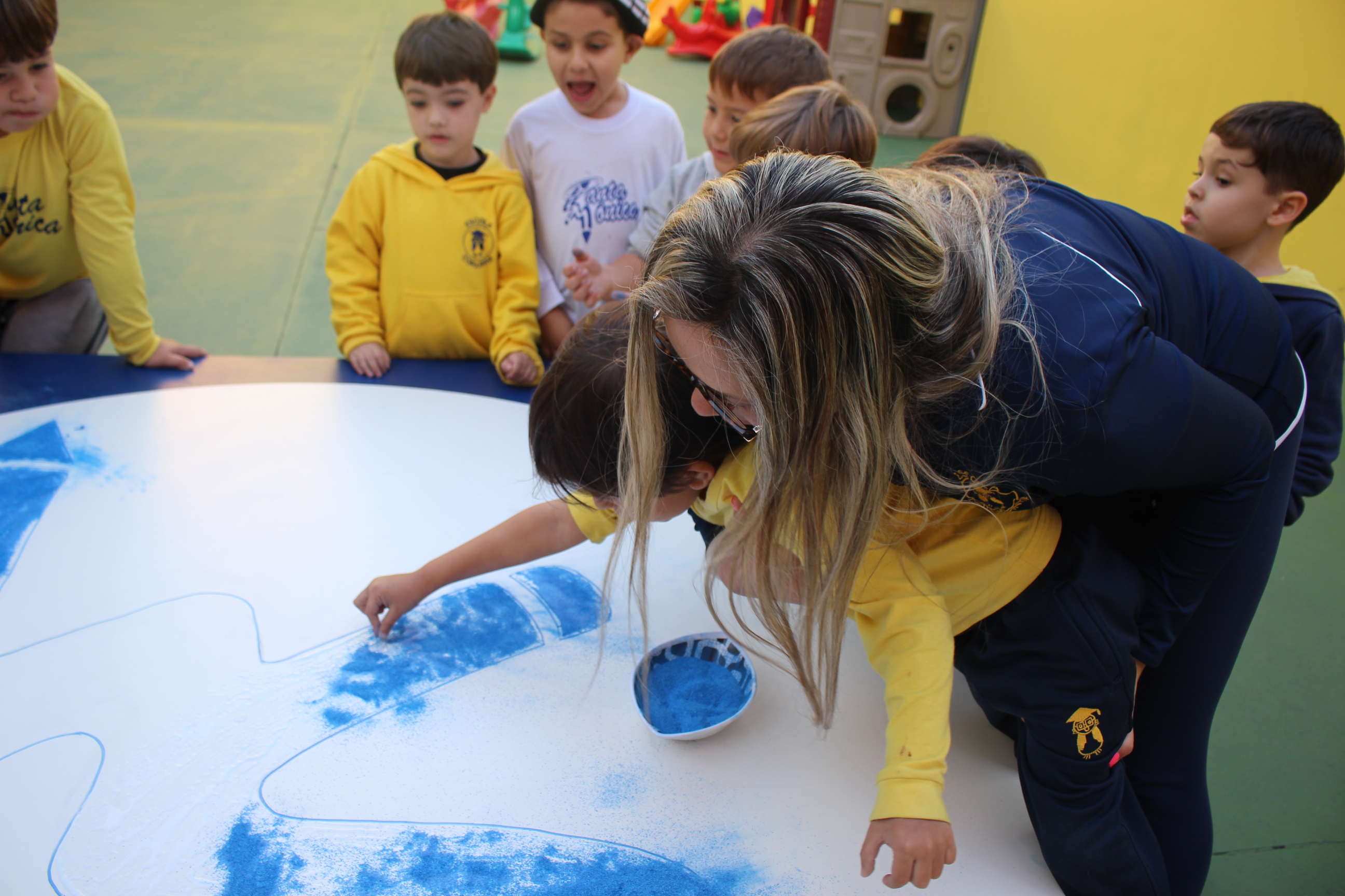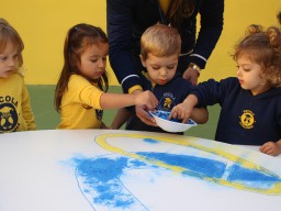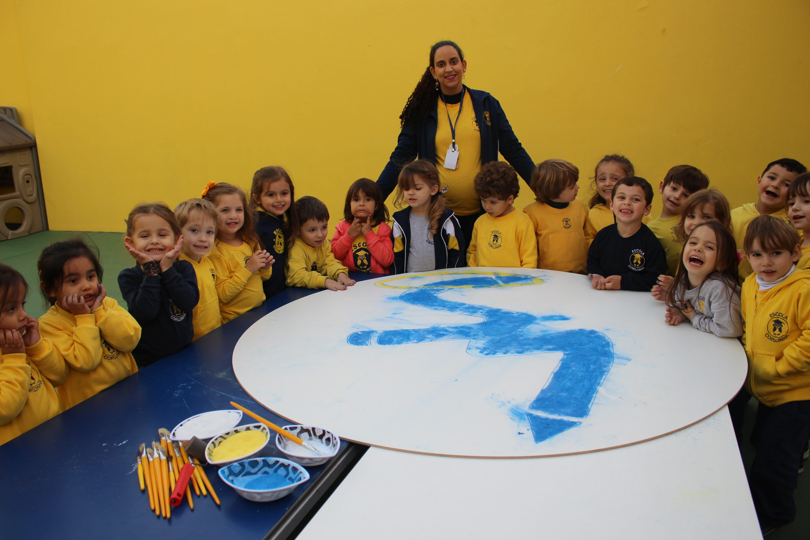 Os pequenos da Escola Corujinha se empenharam bastante para entregar um presente especial para a querida Escola Santa Mônica. Eles se divertiram muito utilizando areia colorida para decorar o mosaico gigante com a logomarca da escola. As professoras deram uma ajudinha na preparação do presente, mas os pequenos é que fizeram a festa.