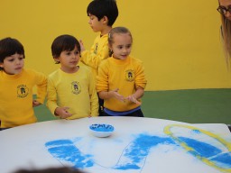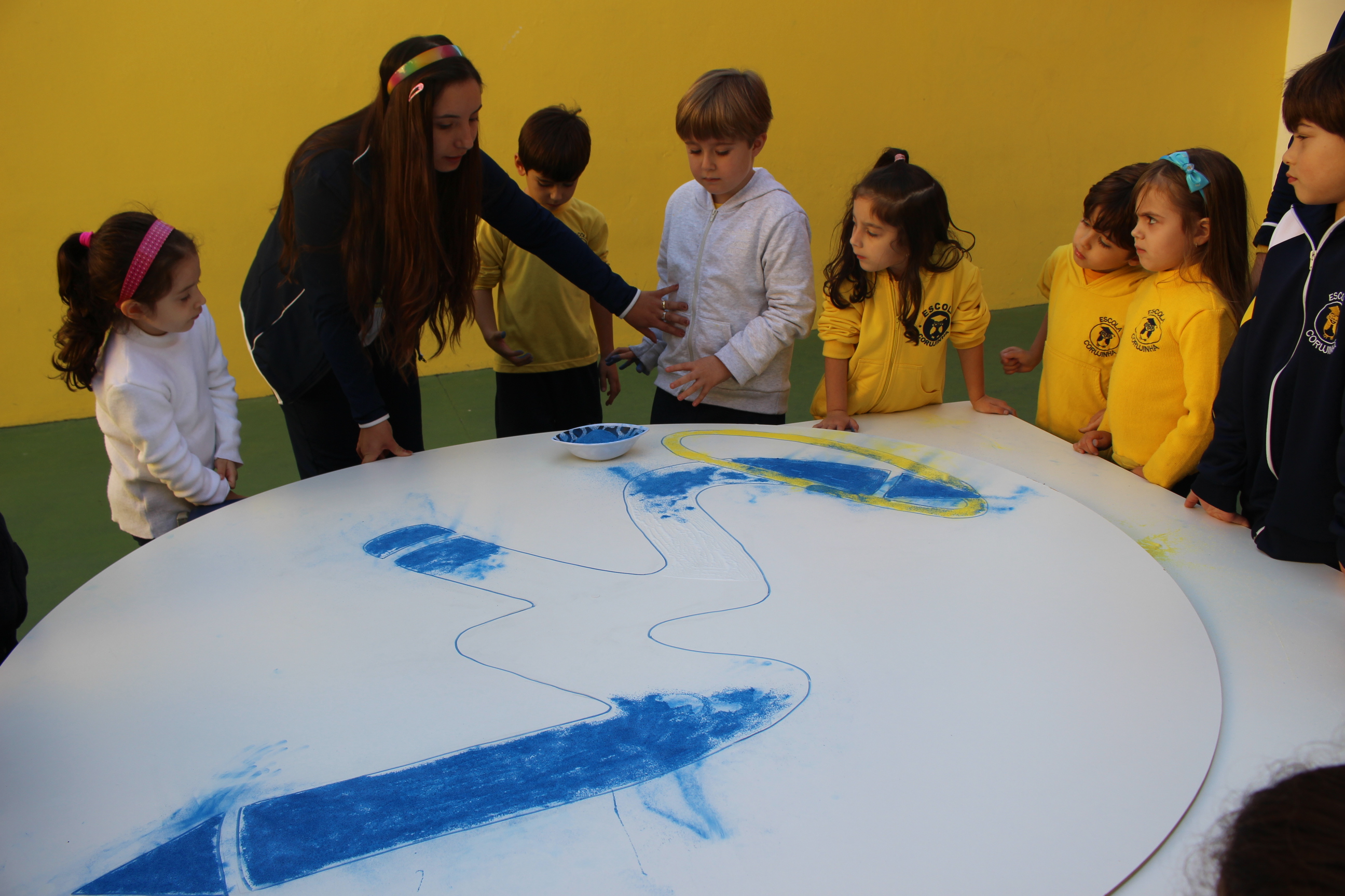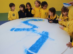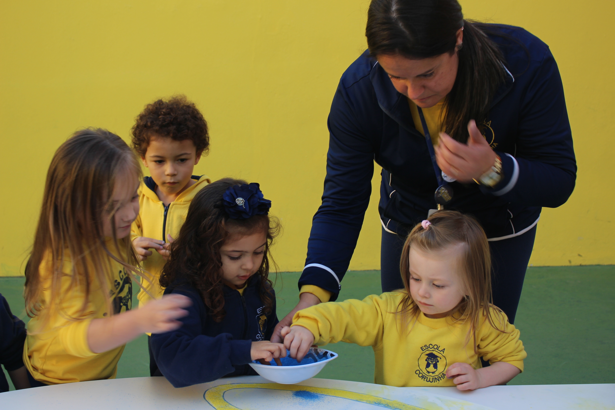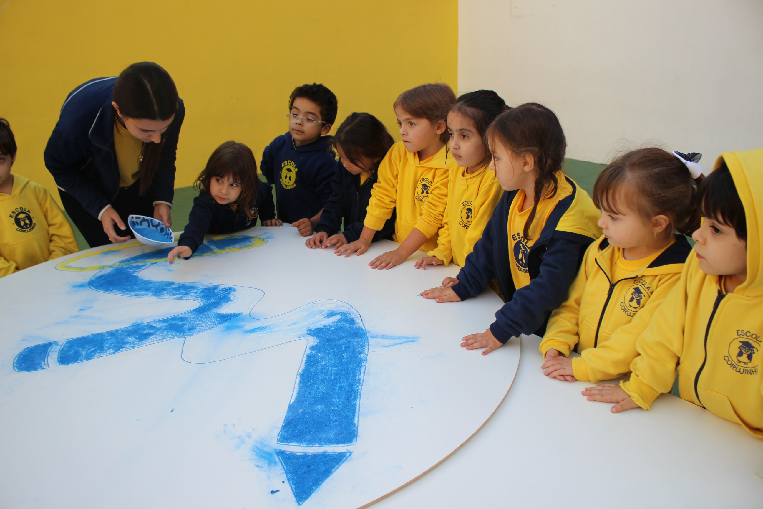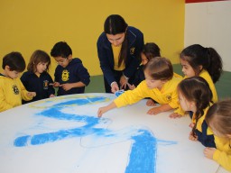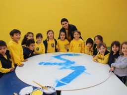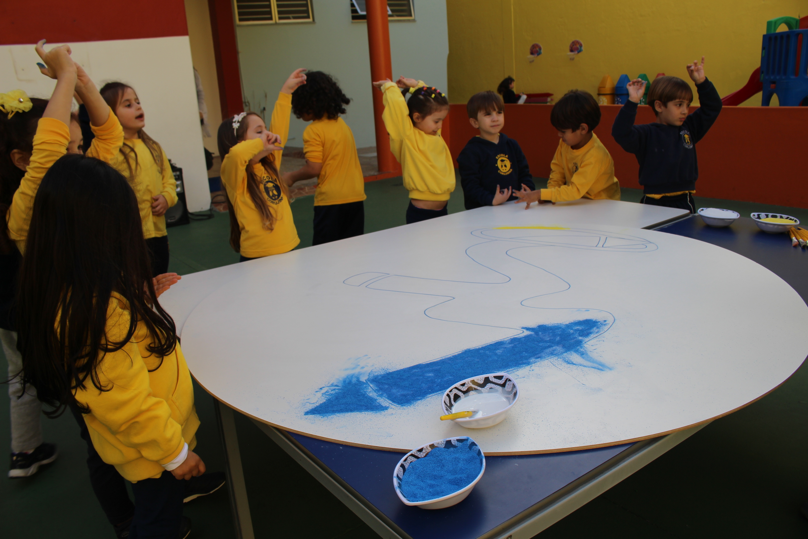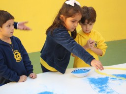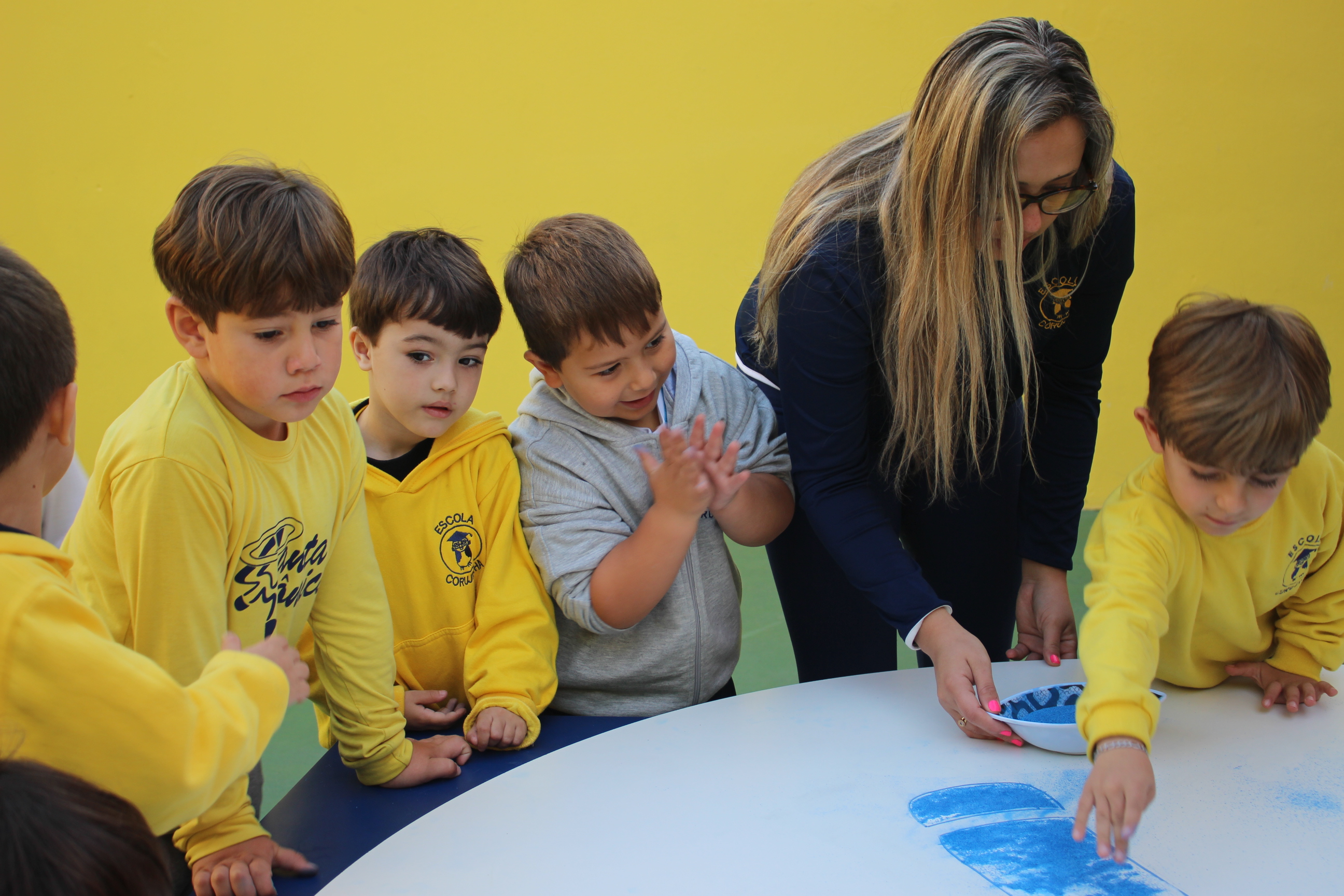Os pequenos da Escola Corujinha se empenharam bastante para entregar um presente especial para a querida Escola Santa Mônica. Eles se divertiram muito utilizando areia colorida para decorar o mosaico gigante com a logomarca da escola. As professoras deram uma ajudinha na preparação do presente, mas os pequenos é que fizeram a festa.