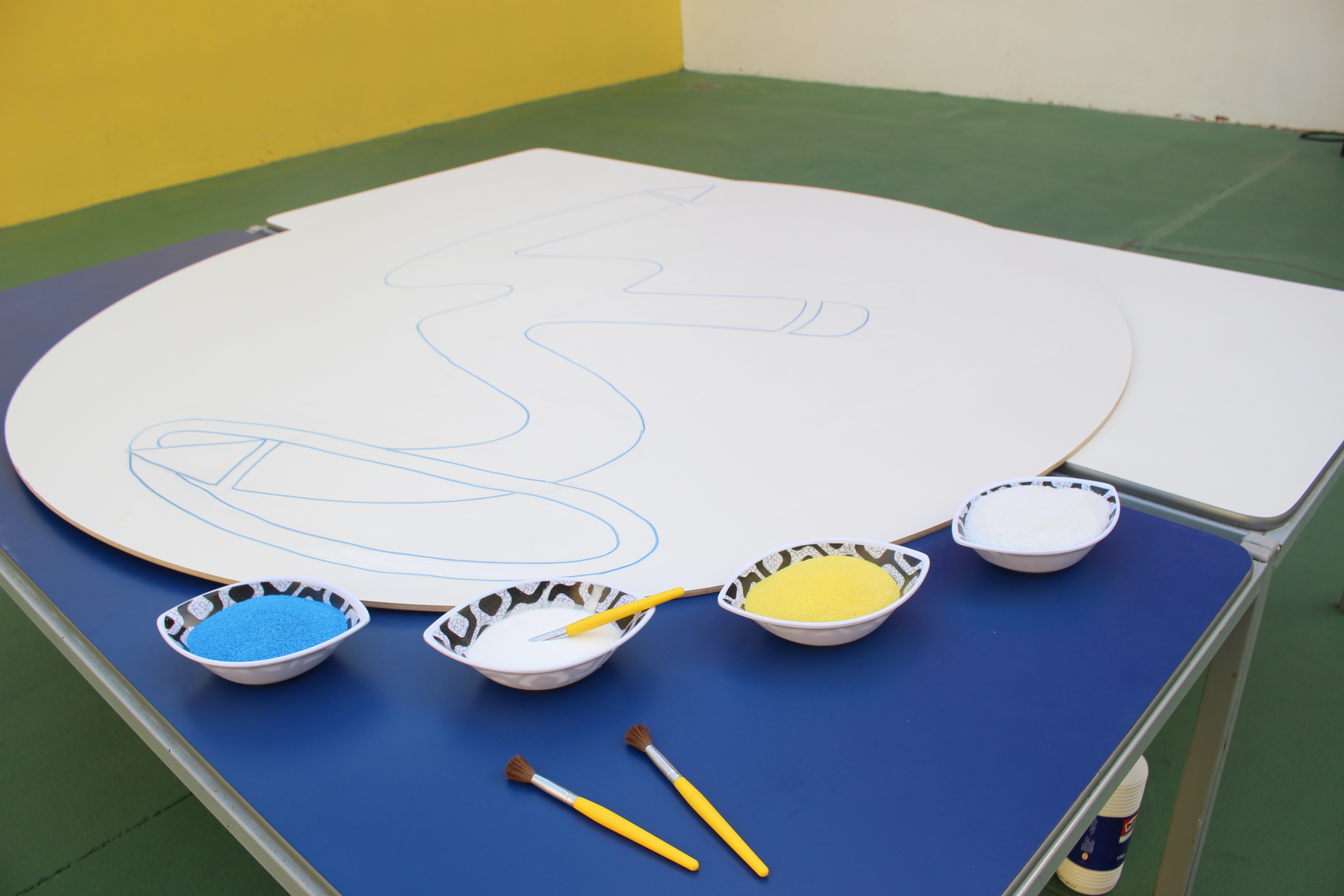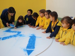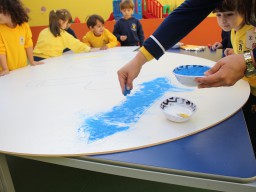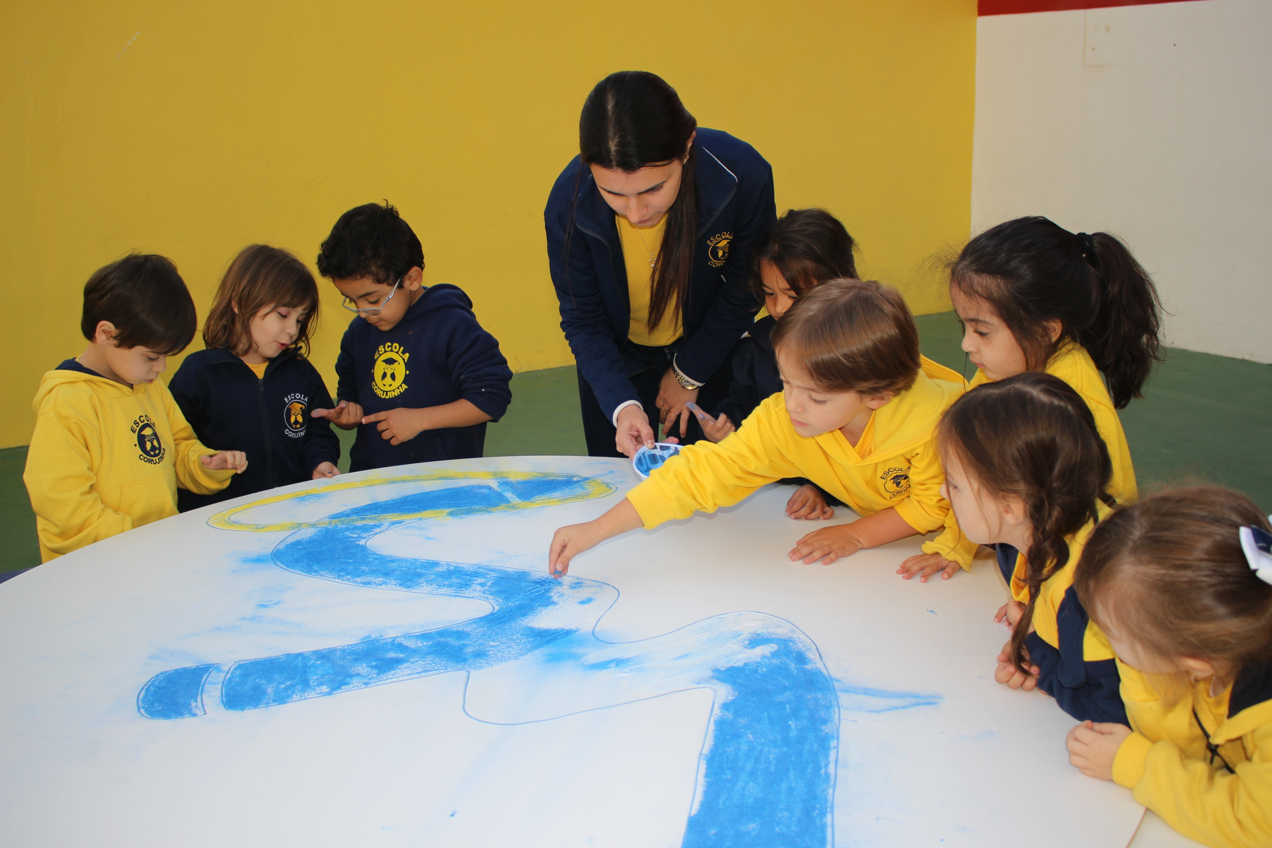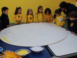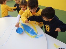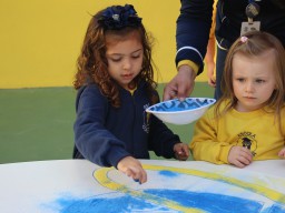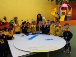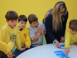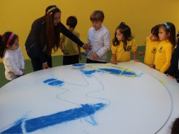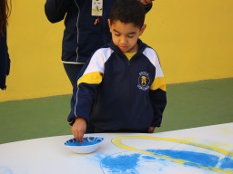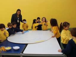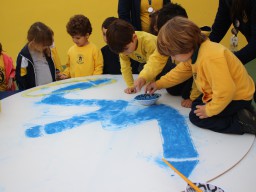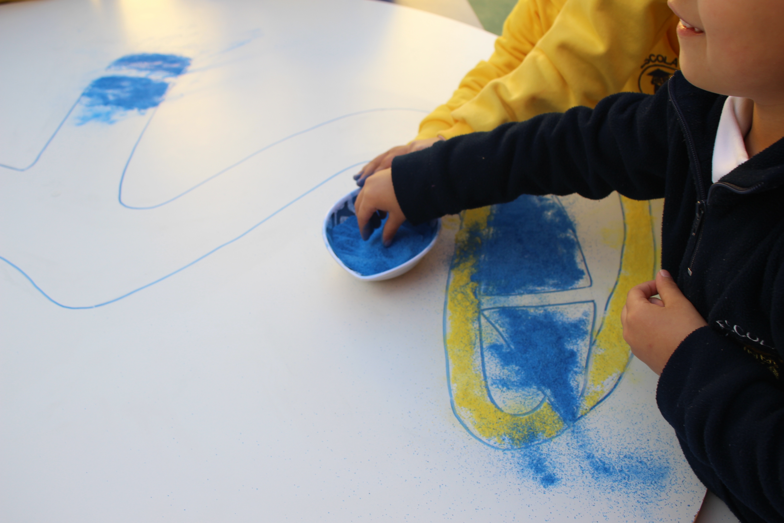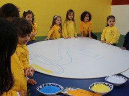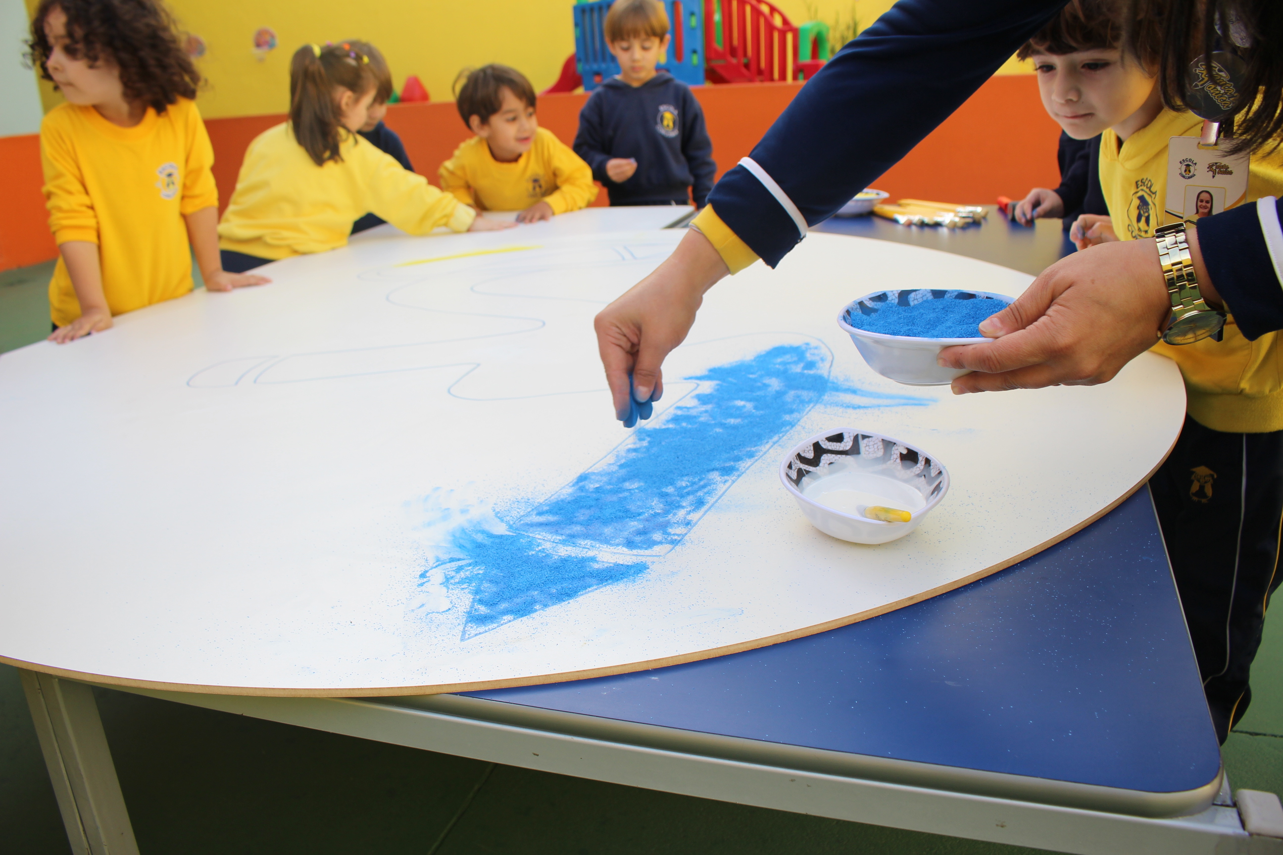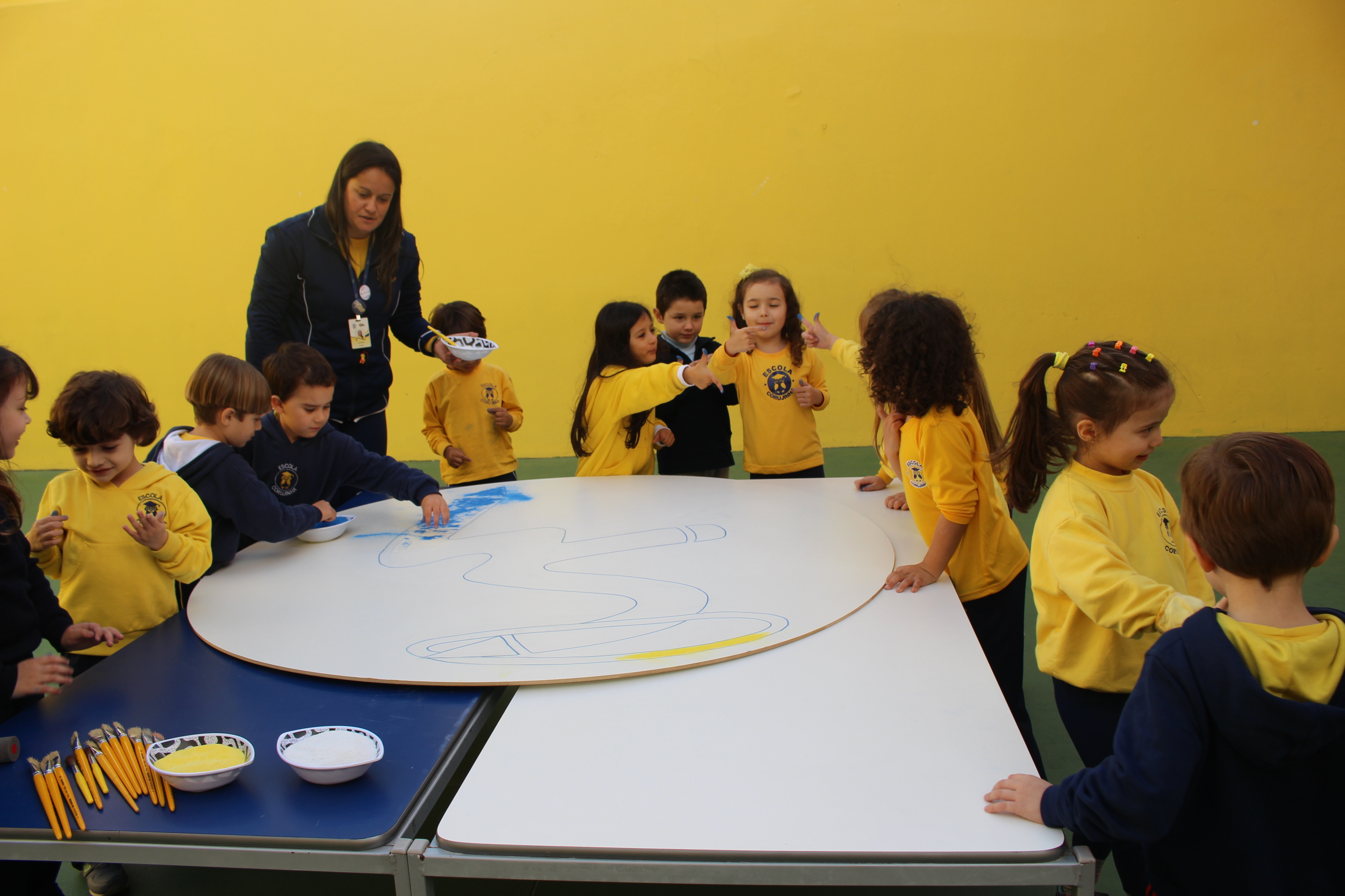 Os pequenos da Escola Corujinha se empenharam bastante para entregar um presente especial para a querida Escola Santa Mônica. Eles se divertiram muito utilizando areia colorida para decorar o mosaico gigante com a logomarca da escola. As professoras deram uma ajudinha na preparação do presente, mas os pequenos é que fizeram a festa.