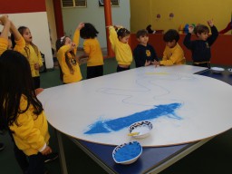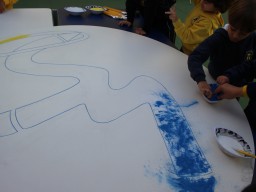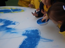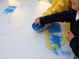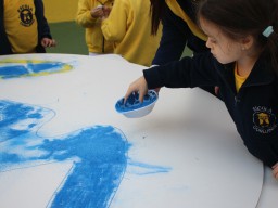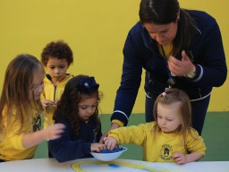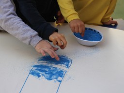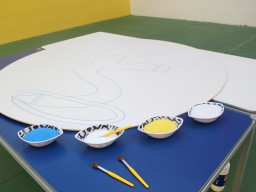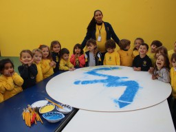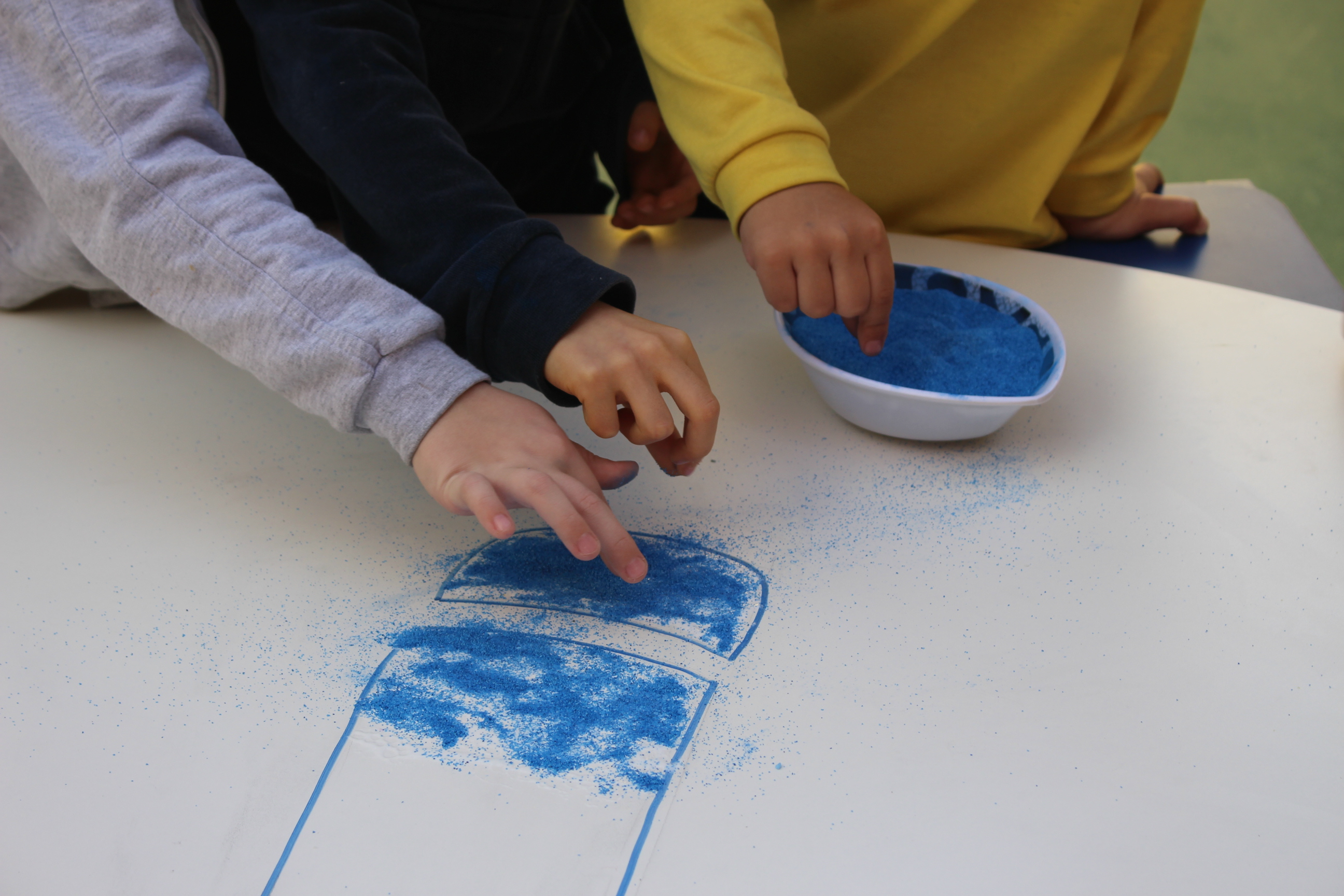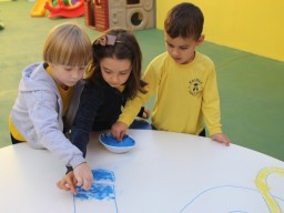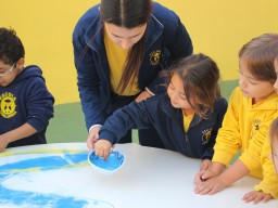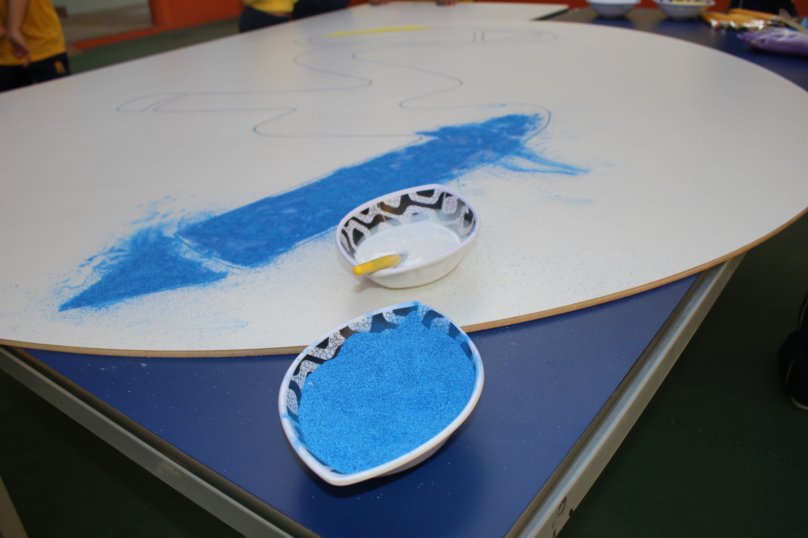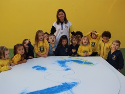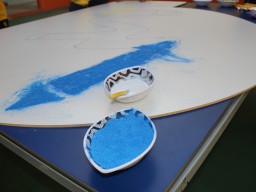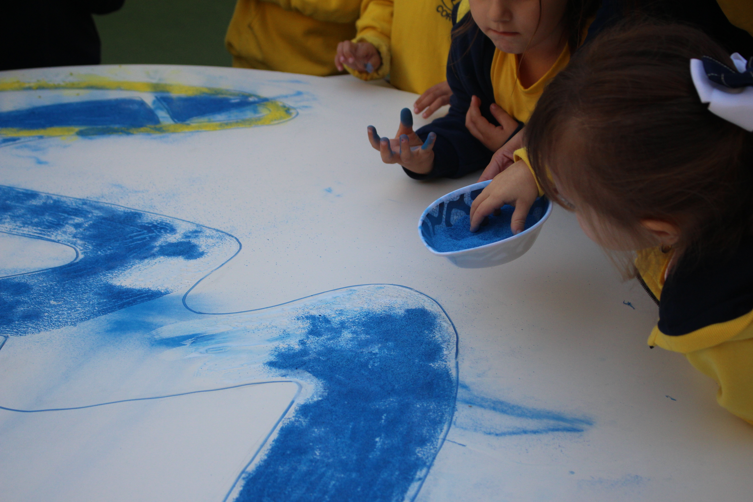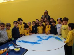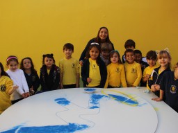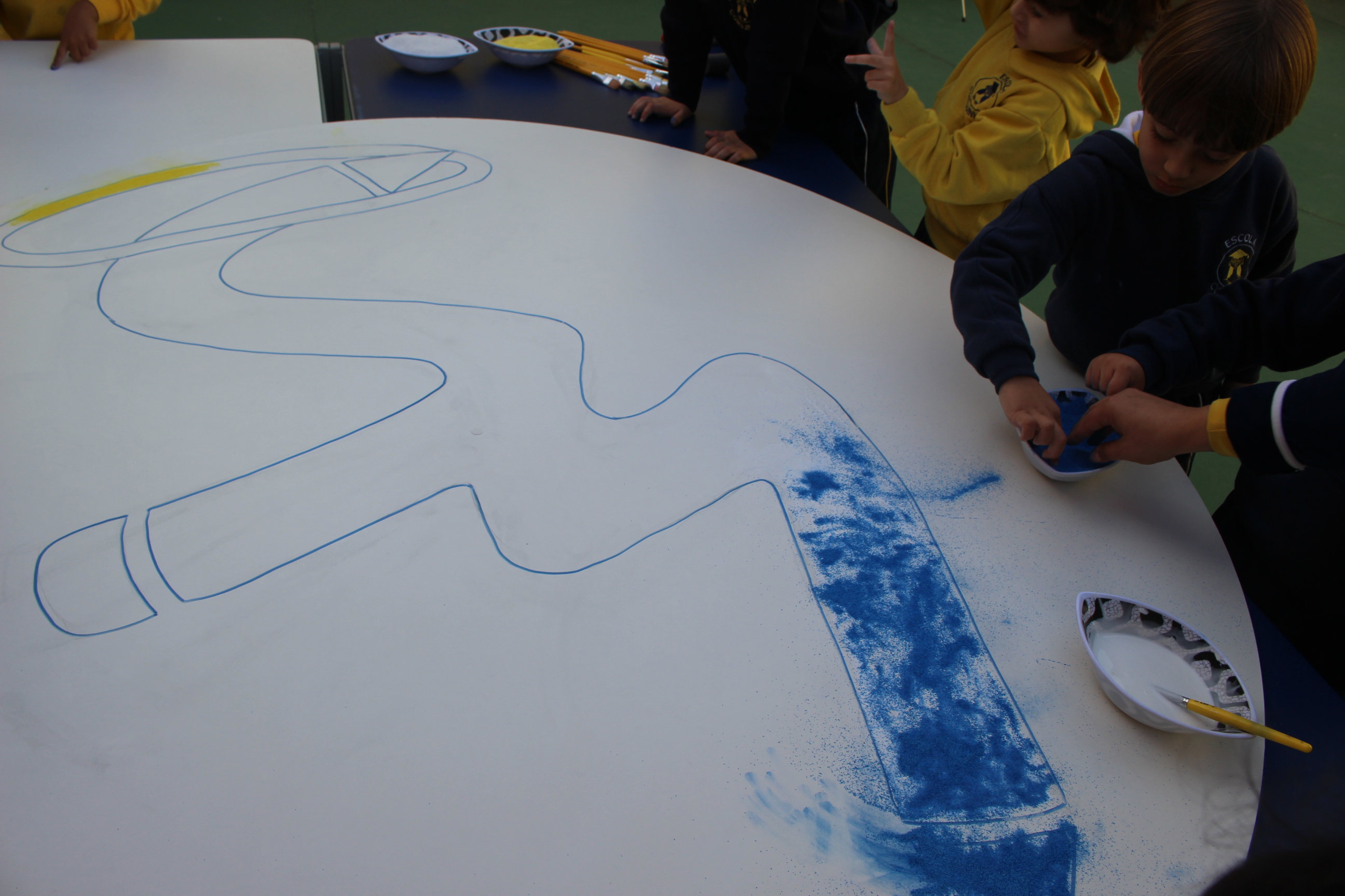 Os pequenos da Escola Corujinha se empenharam bastante para entregar um presente especial para a querida Escola Santa Mônica. Eles se divertiram muito utilizando areia colorida para decorar o mosaico gigante com a logomarca da escola. As professoras deram uma ajudinha na preparação do presente, mas os pequenos é que fizeram a festa.