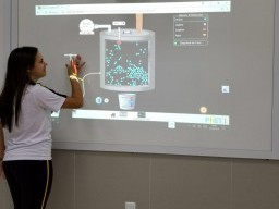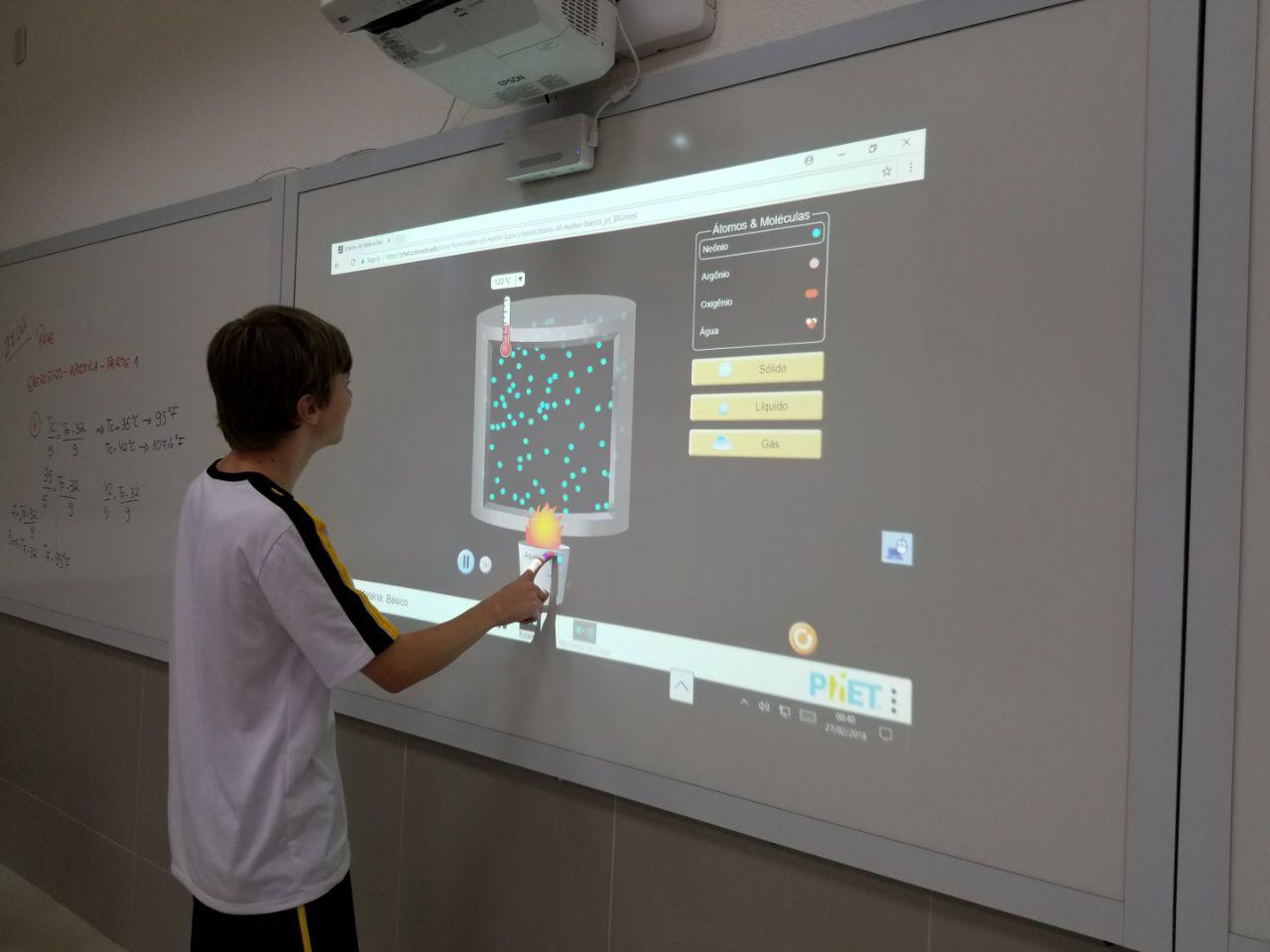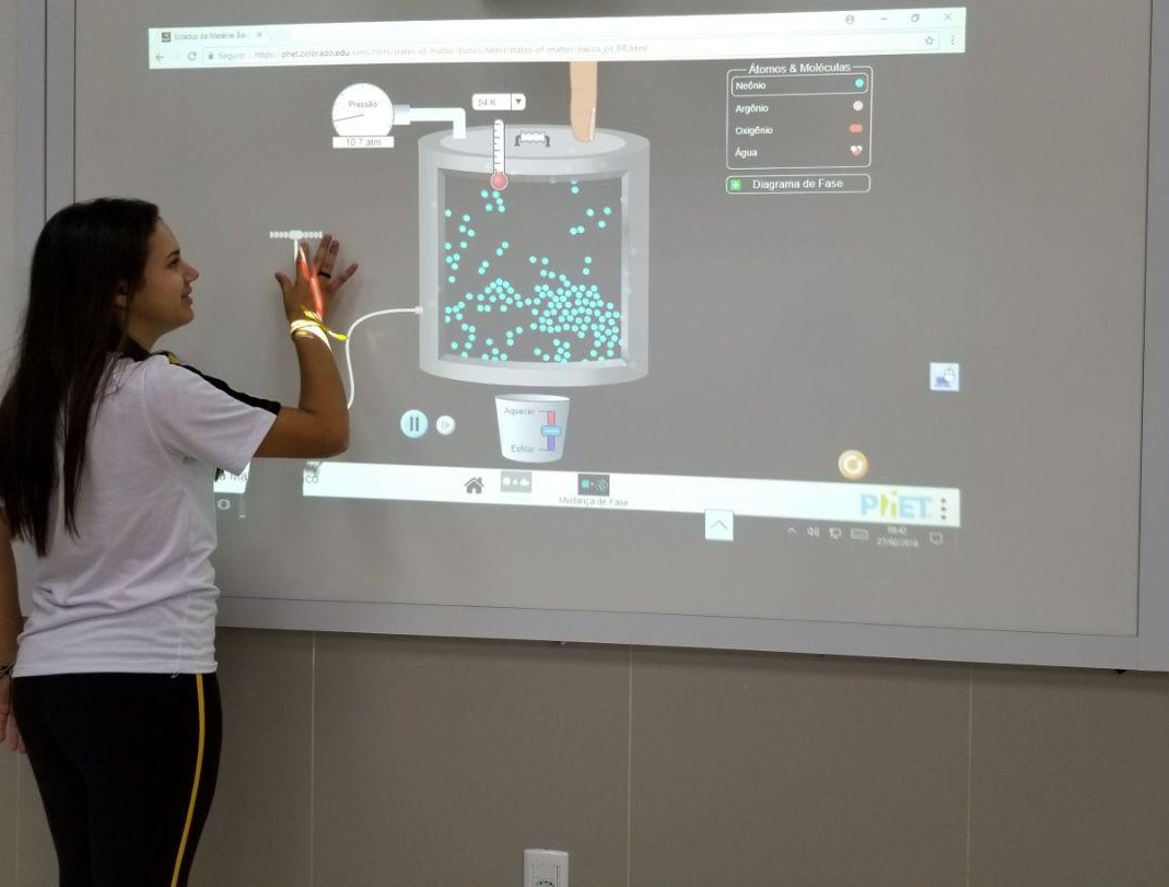 Alunos de 1º ano do Ensino Médio utilizando as simulações PHET na lousa digital para conhecer os conceitos de temperatura e estados físicos da matéria! As aulas interativas enriquecem muito mais o aprendizado de nossos alunos!