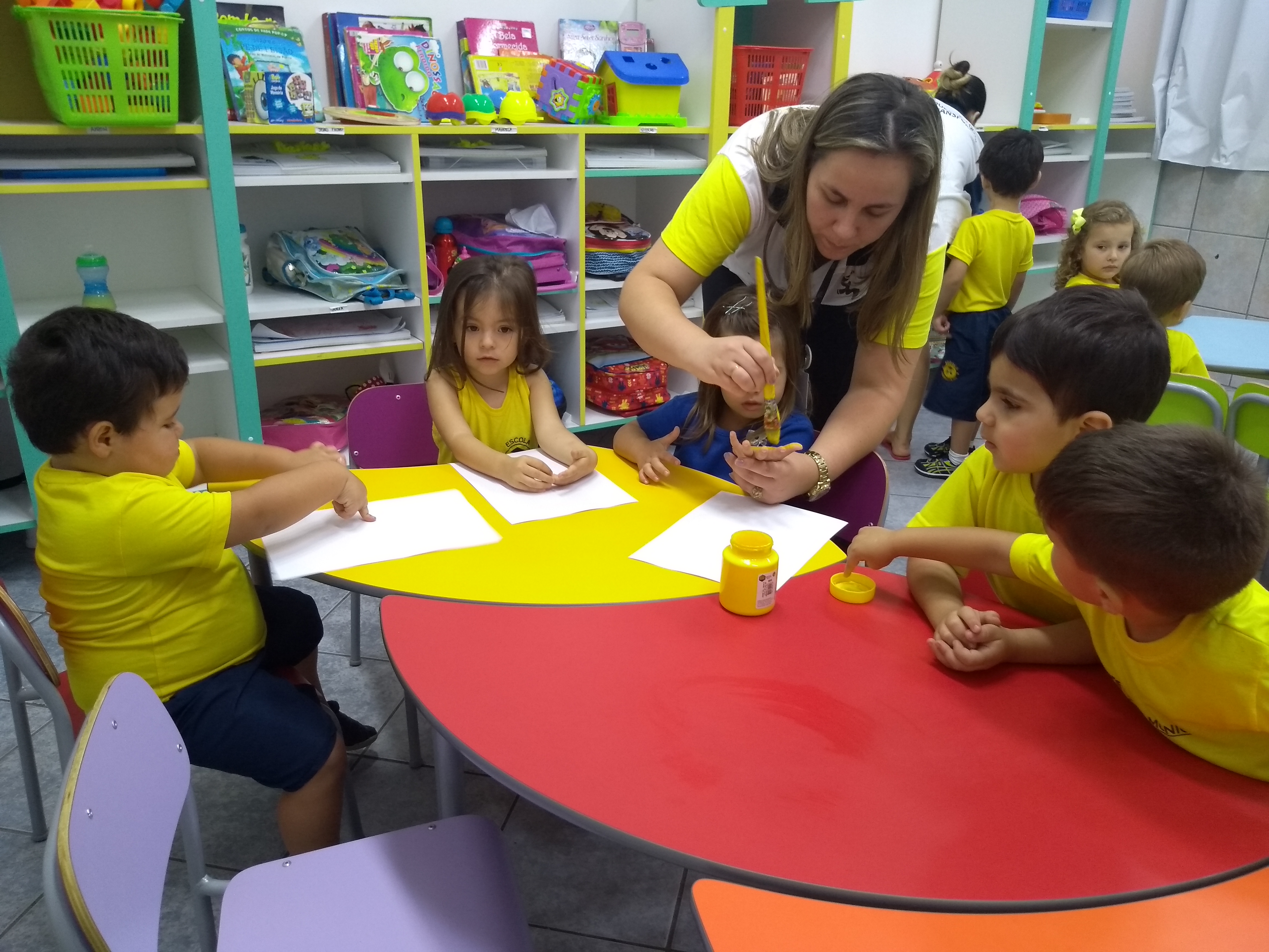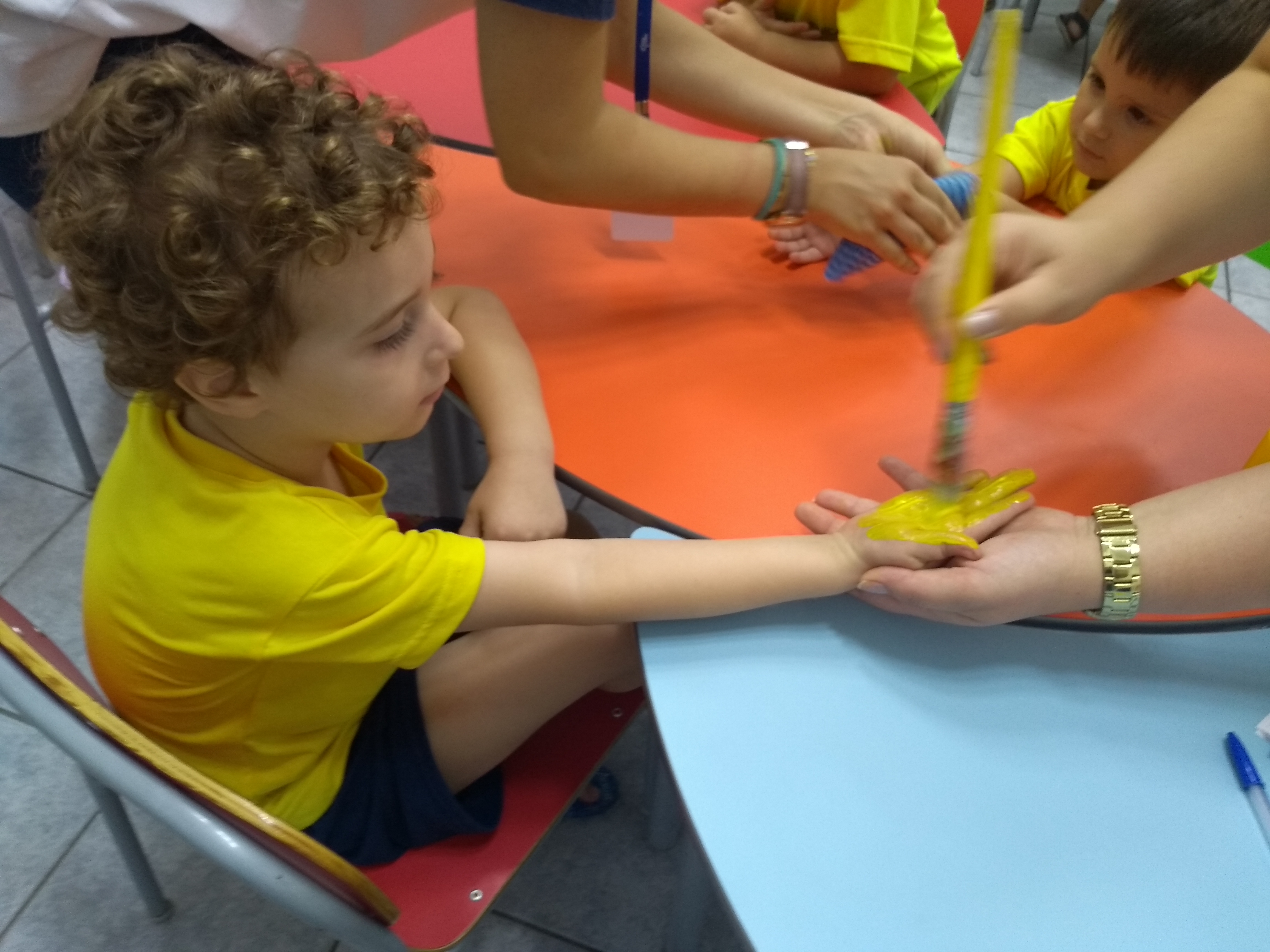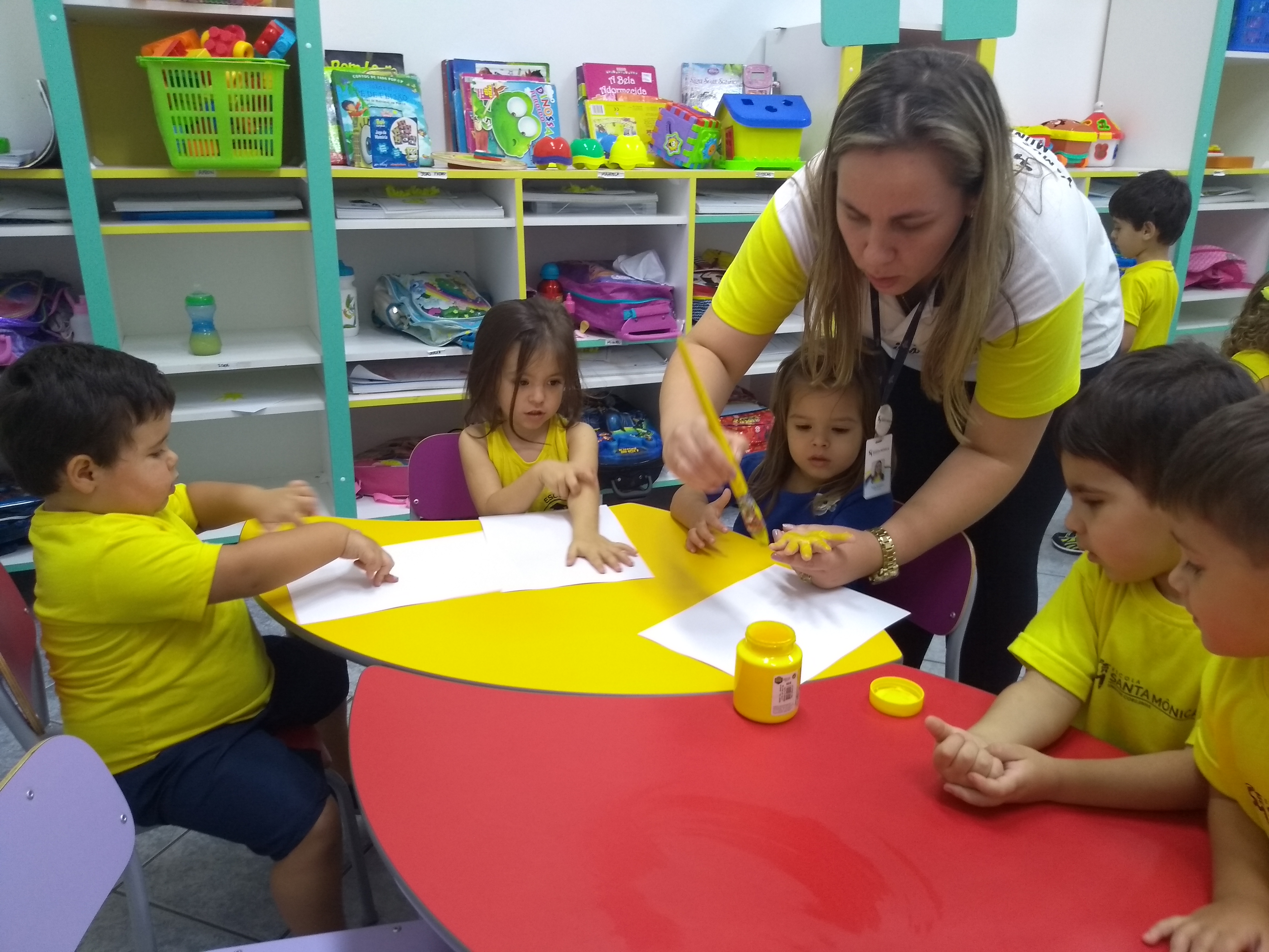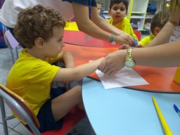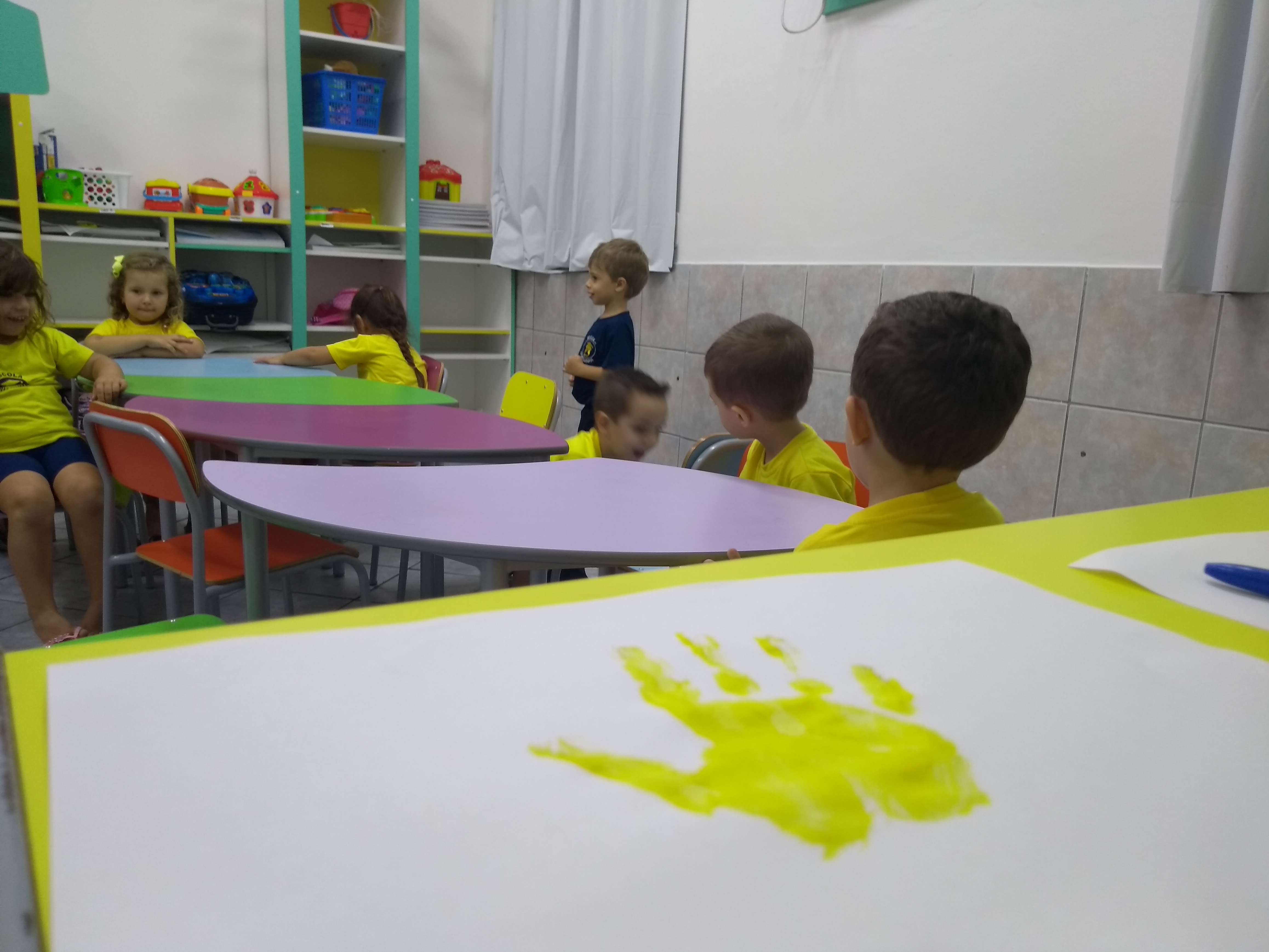 Os alunos da professora Bruna, turma 12 de Jardim I, estão conhecendo um pouco mais sobre a cor amarela e utilizaram as mãos e tinta para confeccionar carimbos divertidos de patinhos.