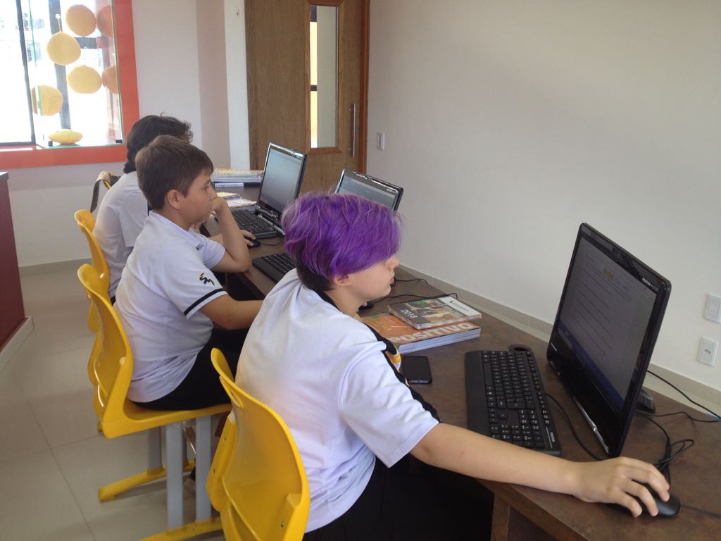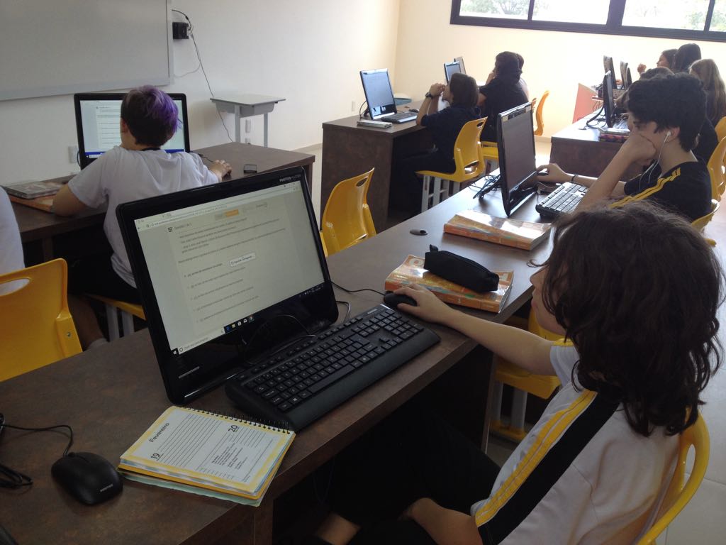 O professor Diego, de Português, levou os alunos de 7º ano do Ensino Fundamental em nosso Laboratório de Informática para pesquisar sobre Renascimento e Antigo Regime e realizar trilhas de Português no ambiente digital do Positivo On.