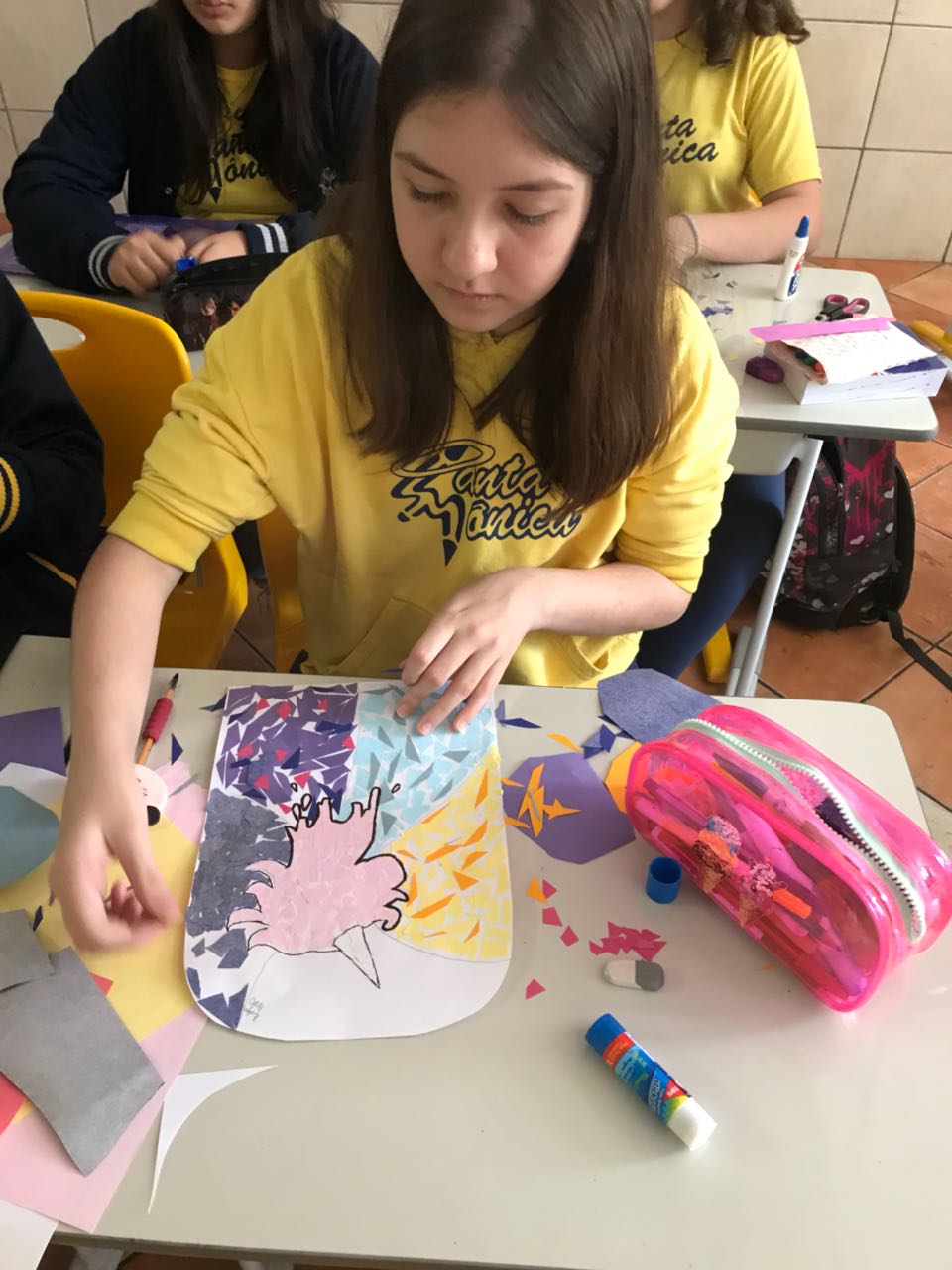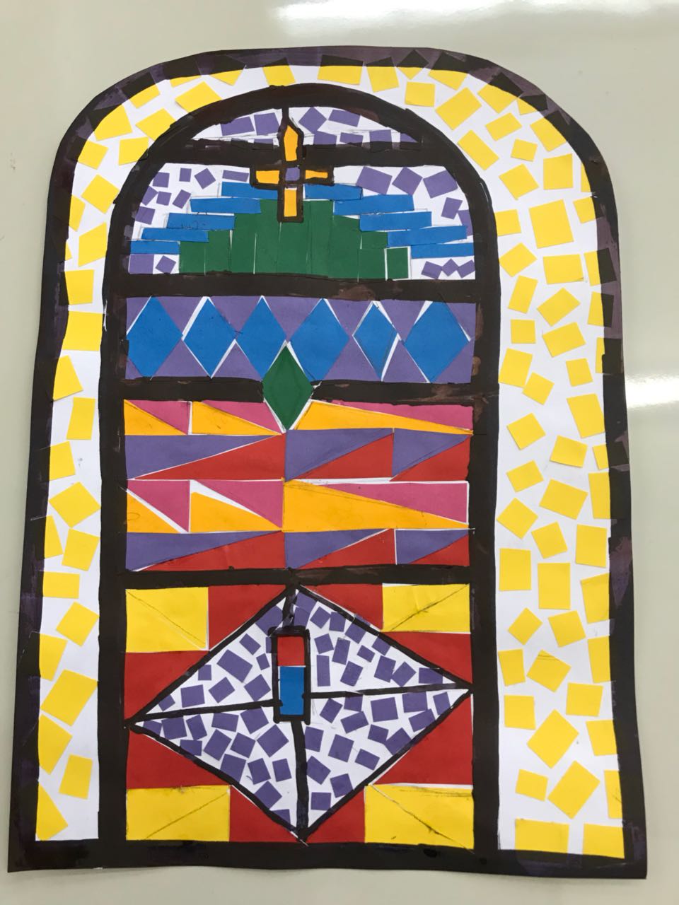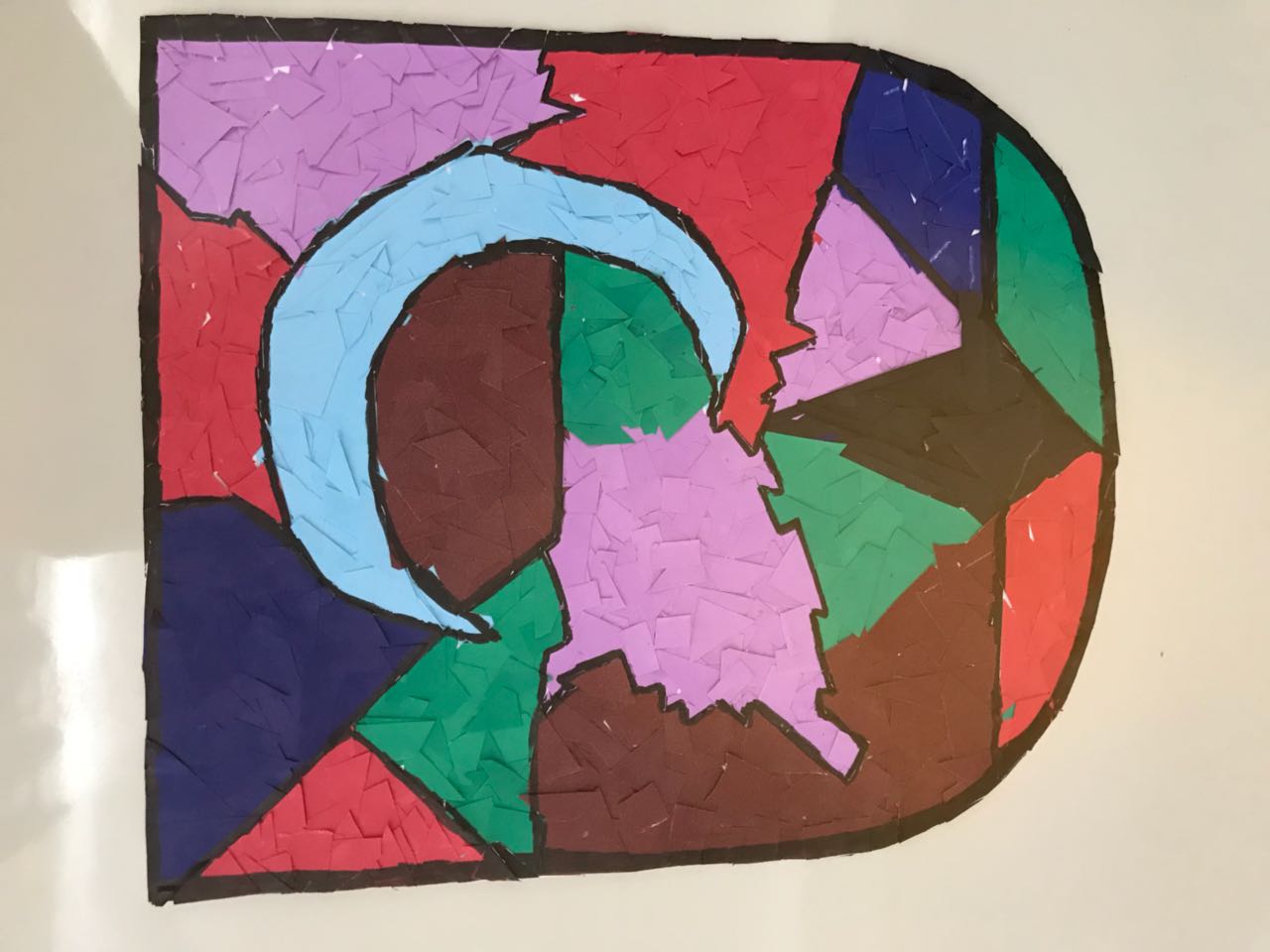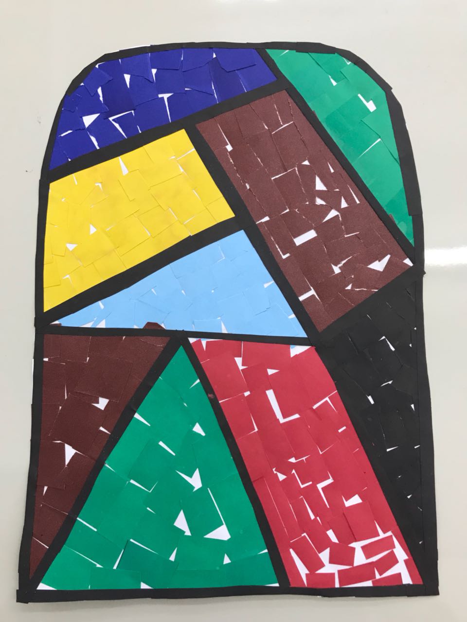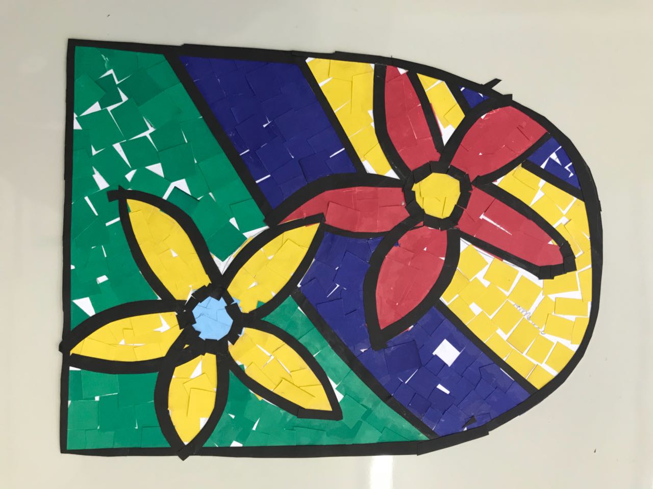 Nossos alunos de 7º ano do Ensino Fundamental produziram obras de arte utilizando a técnica vitral em mosaico, adaptada com pedaços de papel e recorte e colagem.