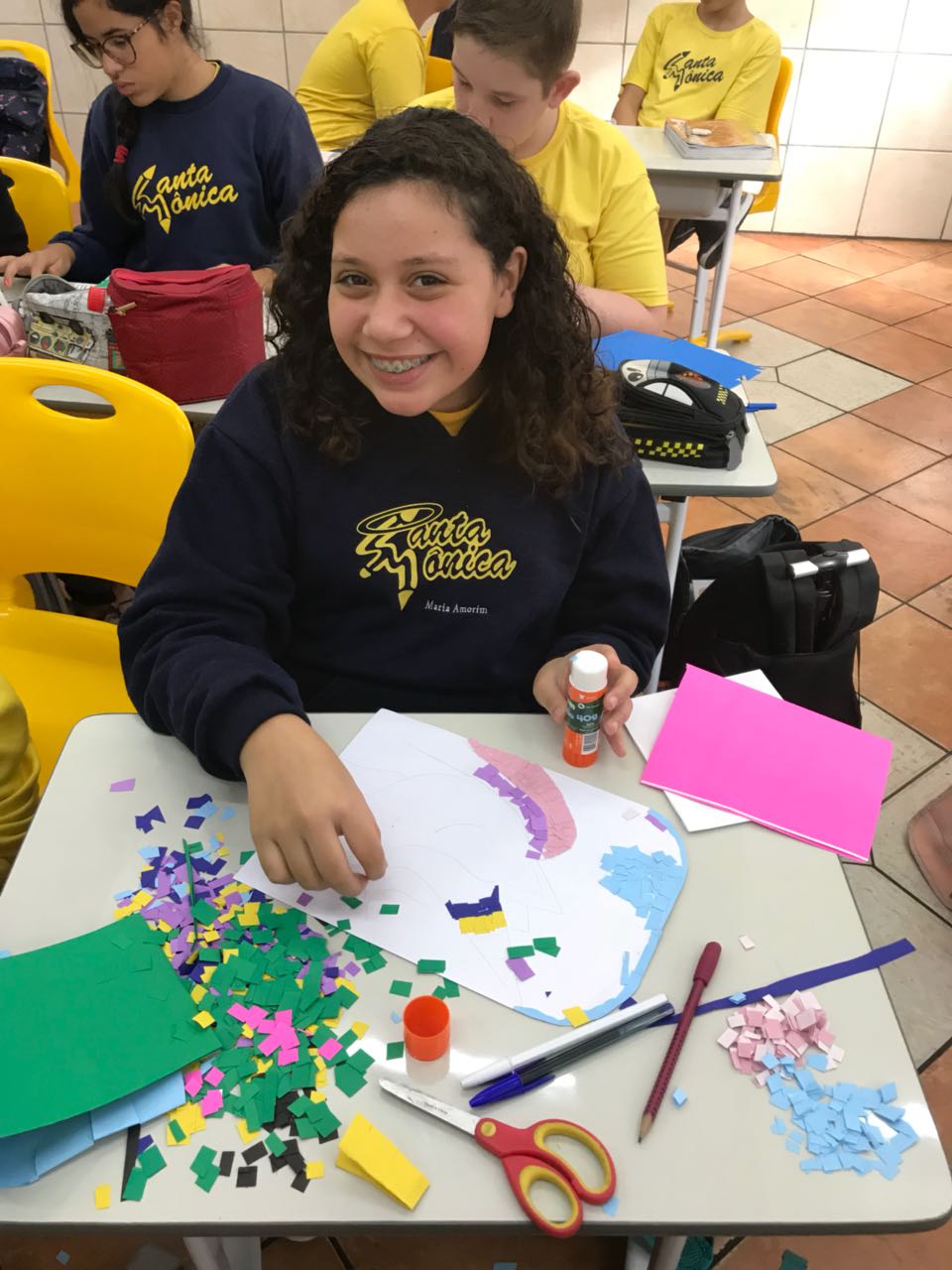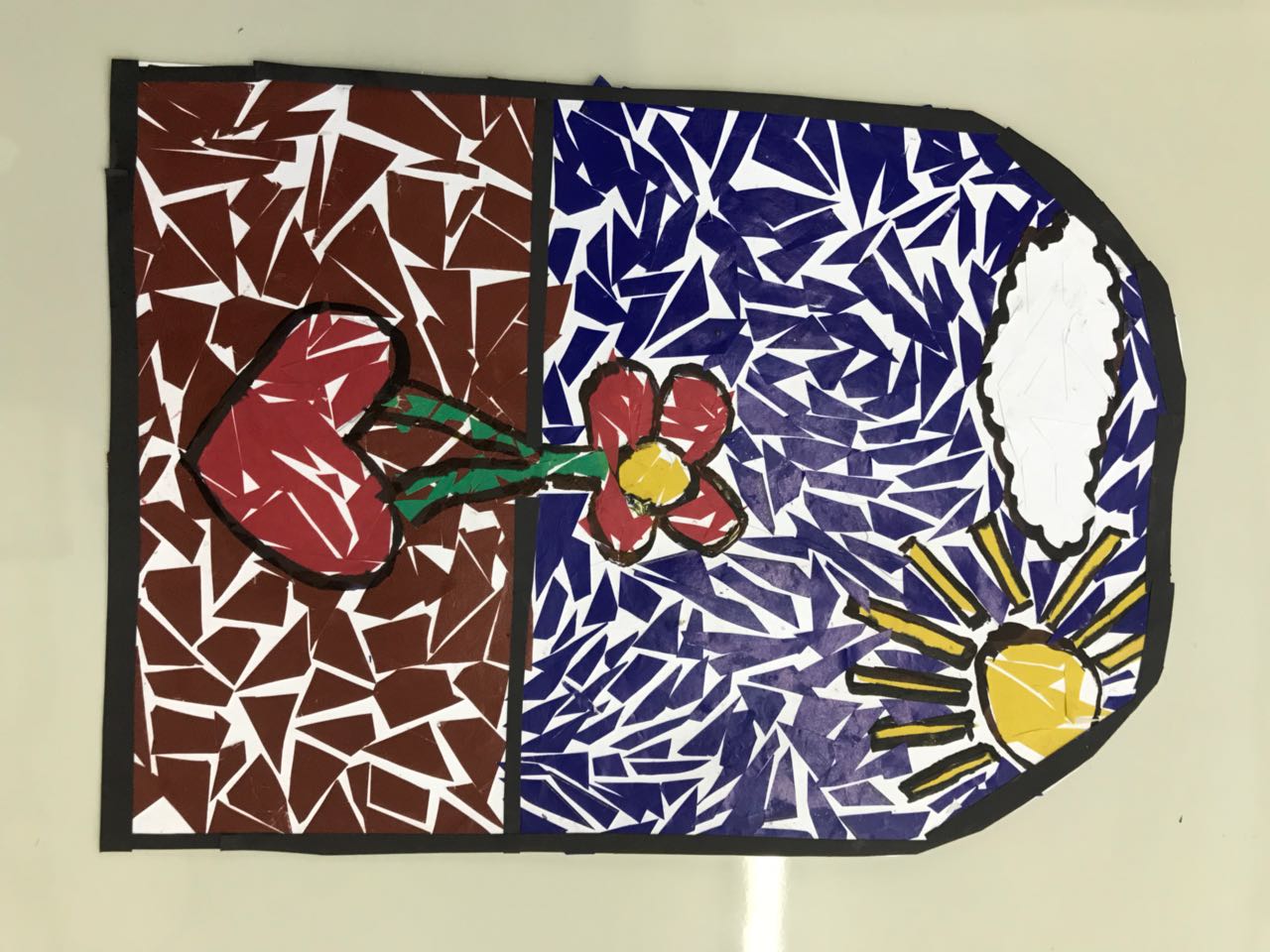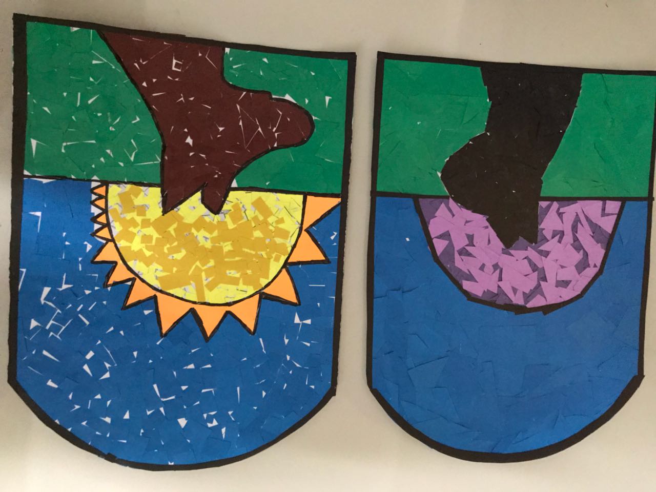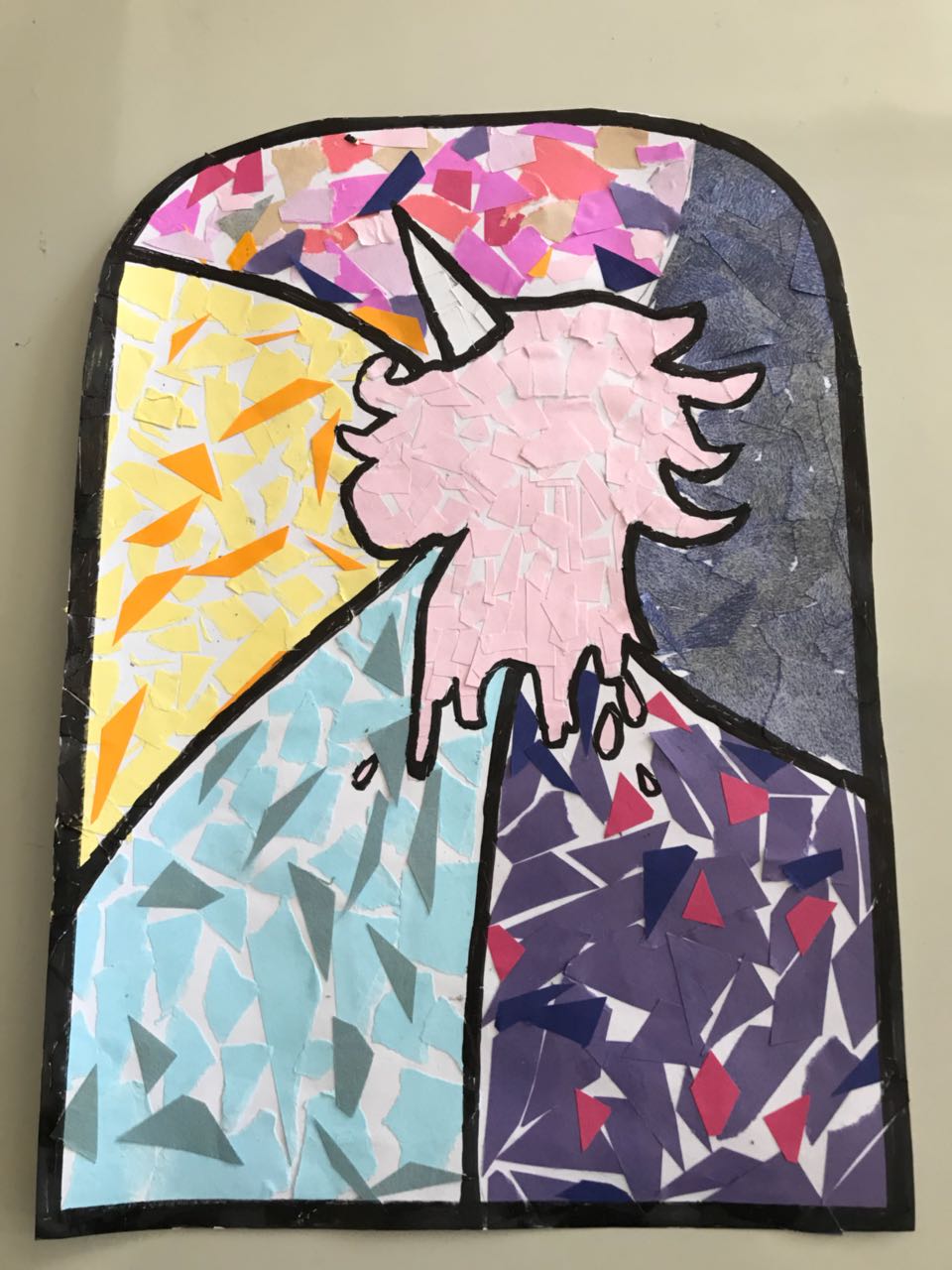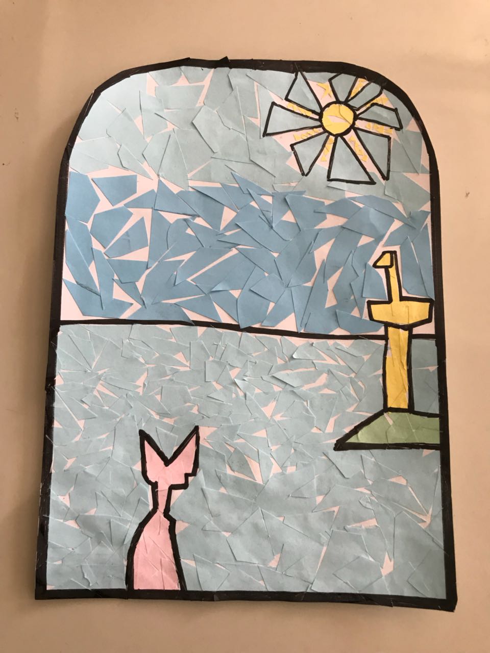 Nossos alunos de 7º ano do Ensino Fundamental produziram obras de arte utilizando a técnica vitral em mosaico, adaptada com pedaços de papel e recorte e colagem.