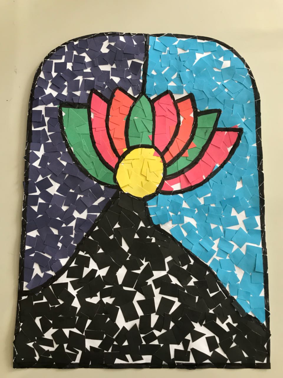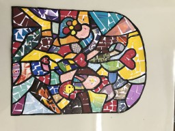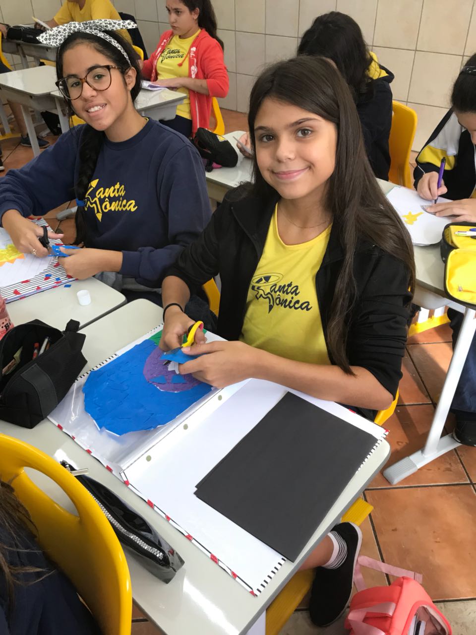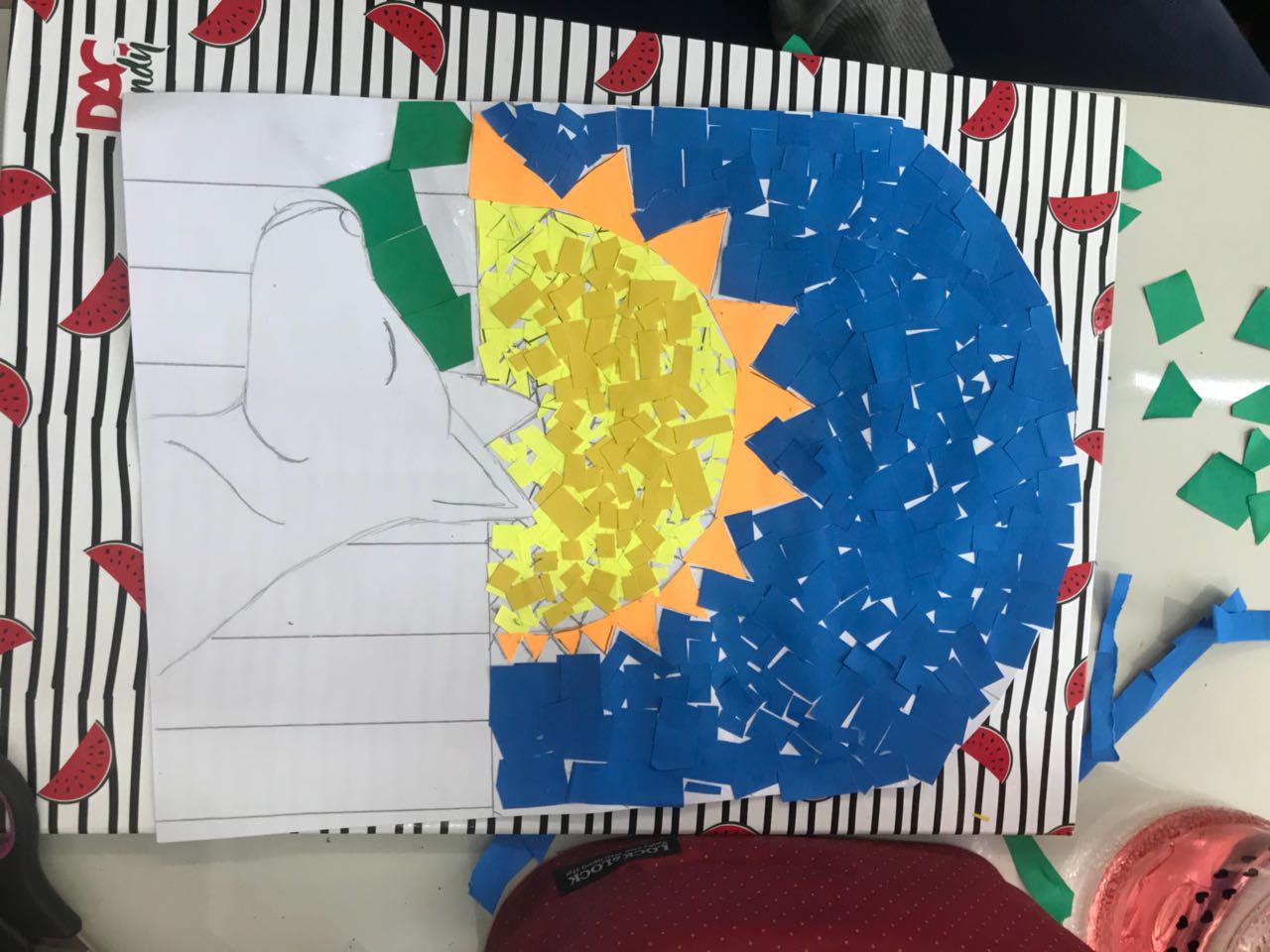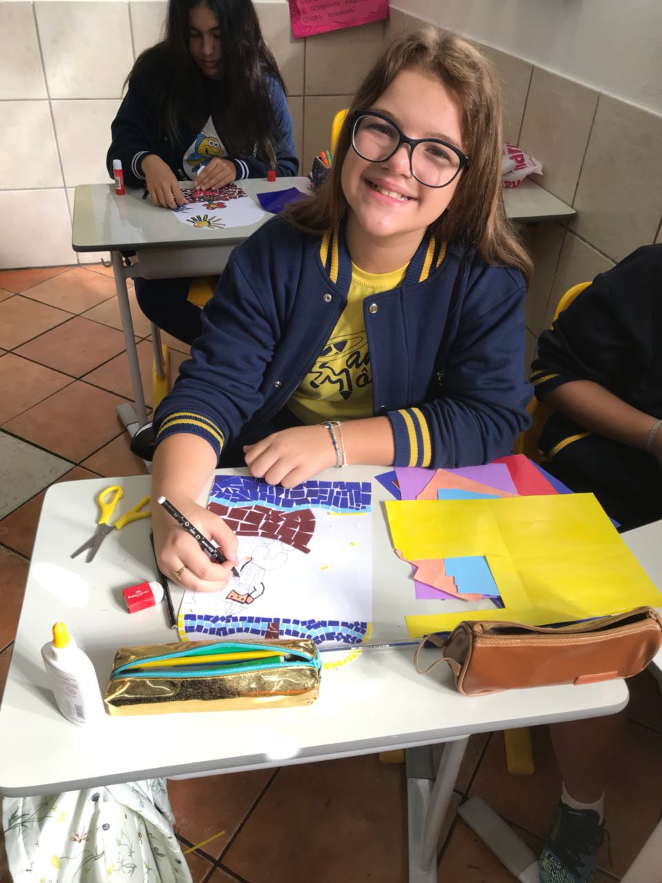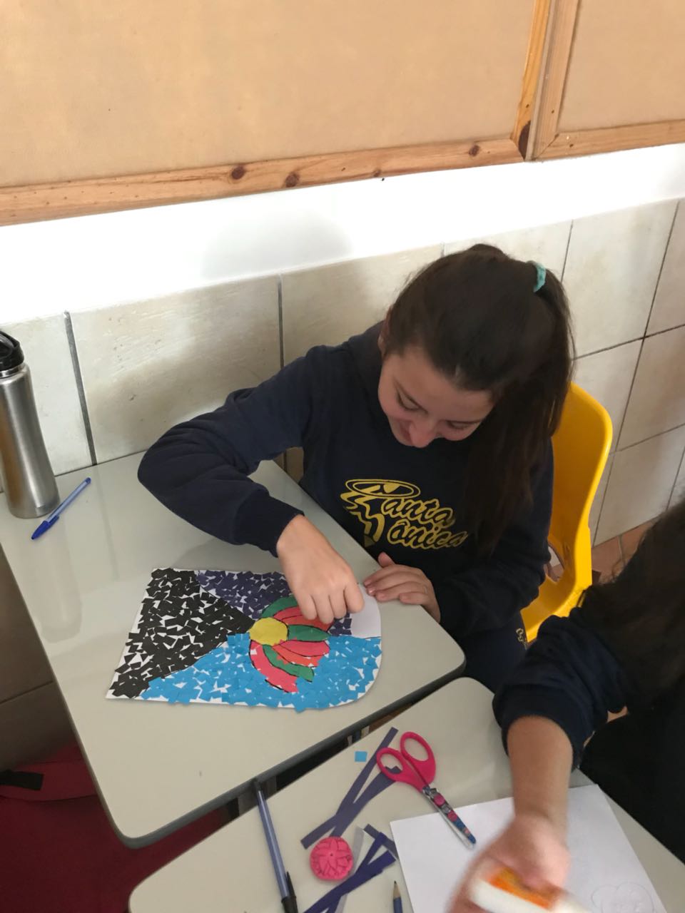 Nossos alunos de 7º ano do Ensino Fundamental produziram obras de arte utilizando a técnica vitral em mosaico, adaptada com pedaços de papel e recorte e colagem.