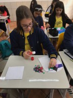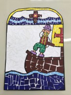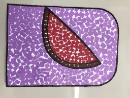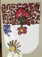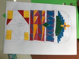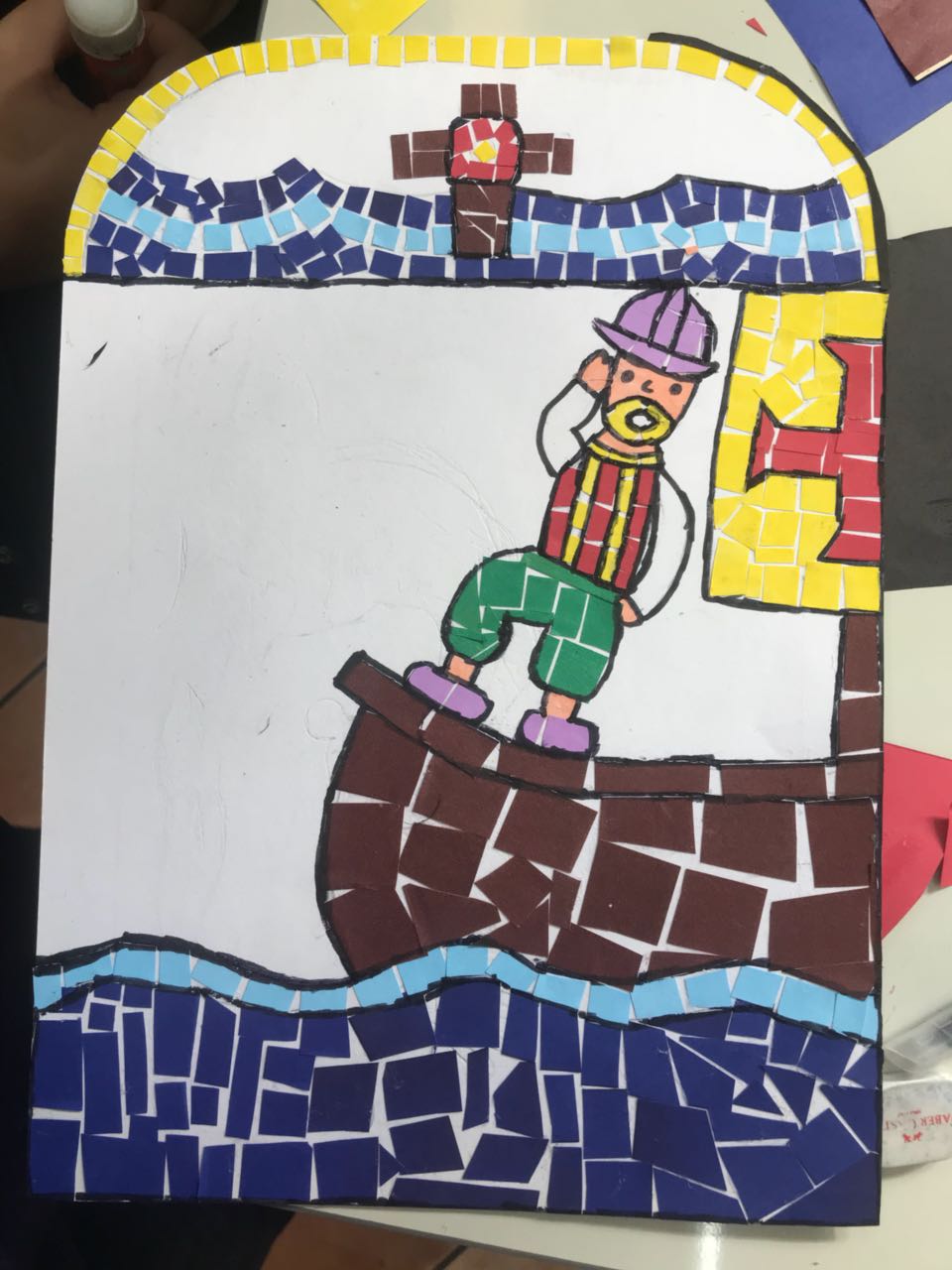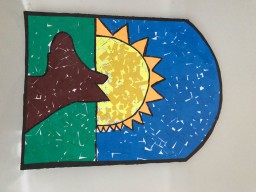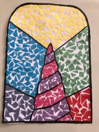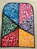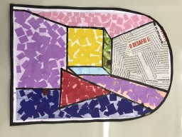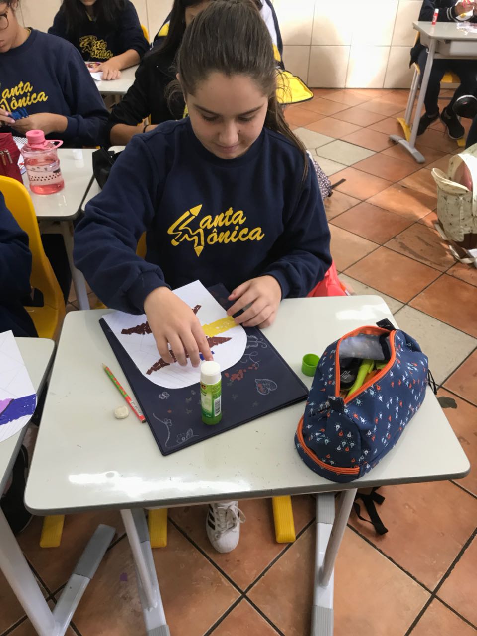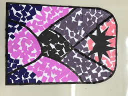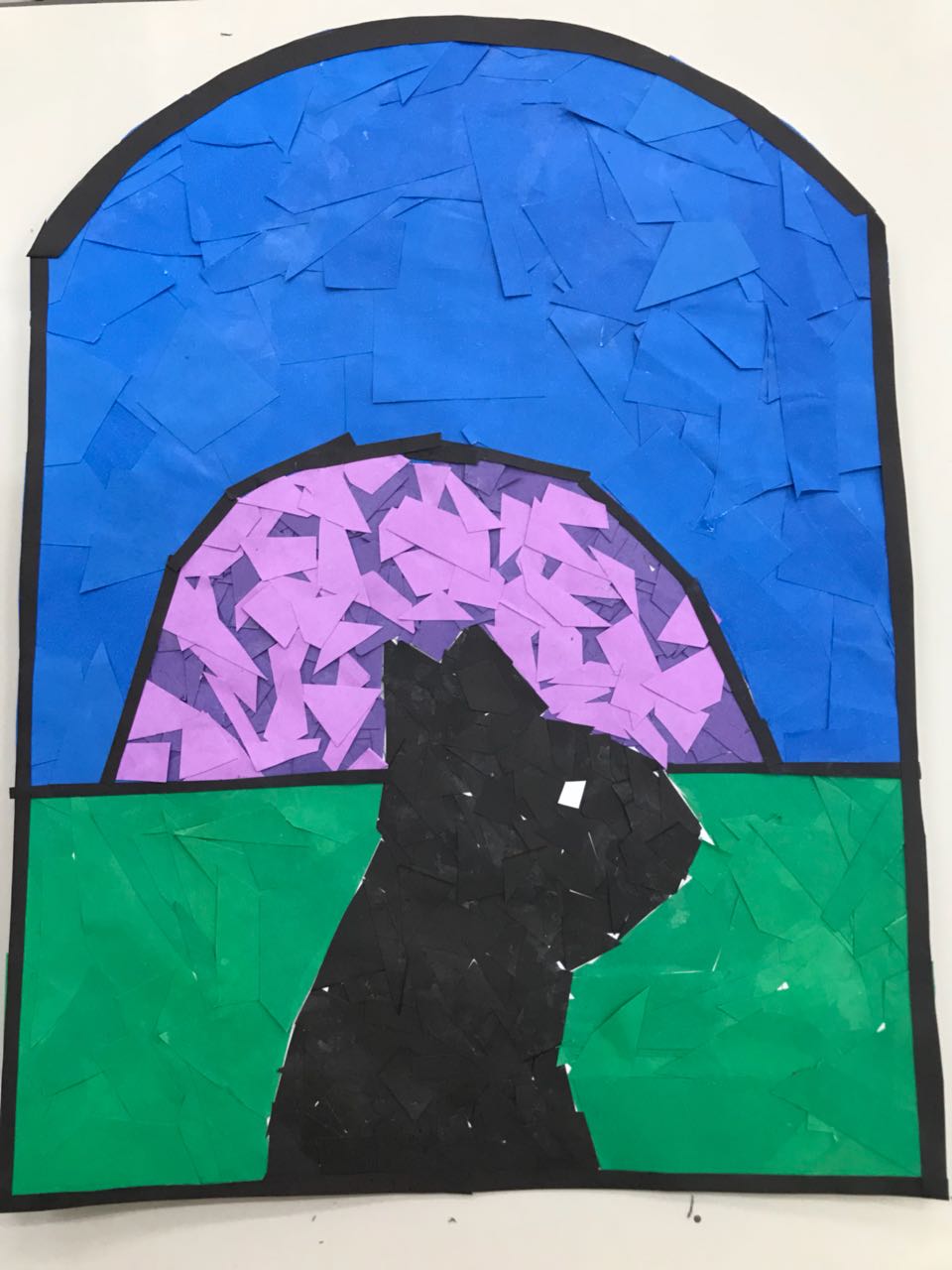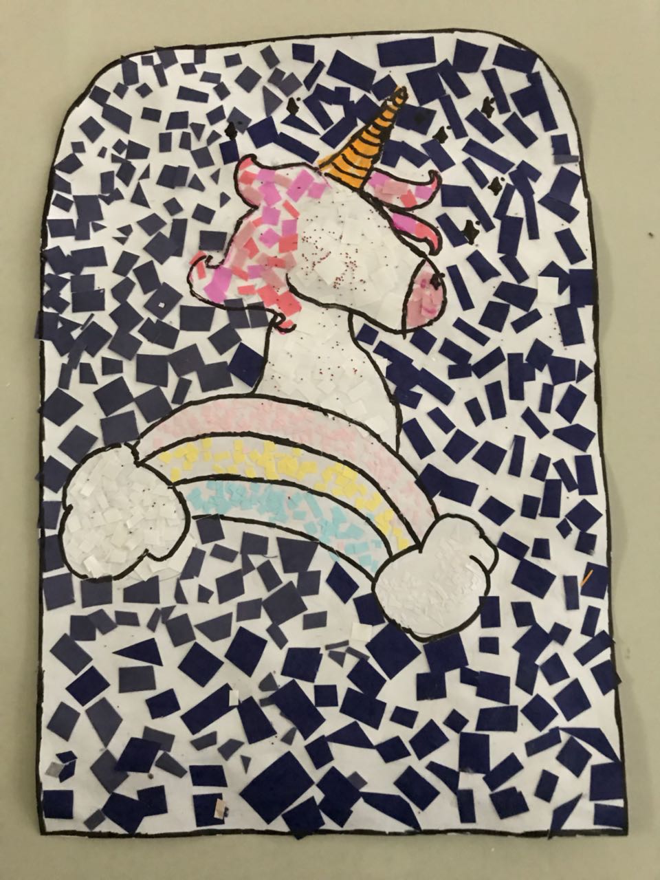 Nossos alunos de 7º ano do Ensino Fundamental produziram obras de arte utilizando a técnica vitral em mosaico, adaptada com pedaços de papel e recorte e colagem.
