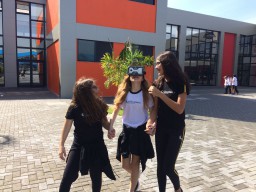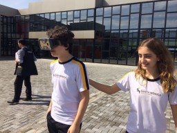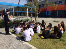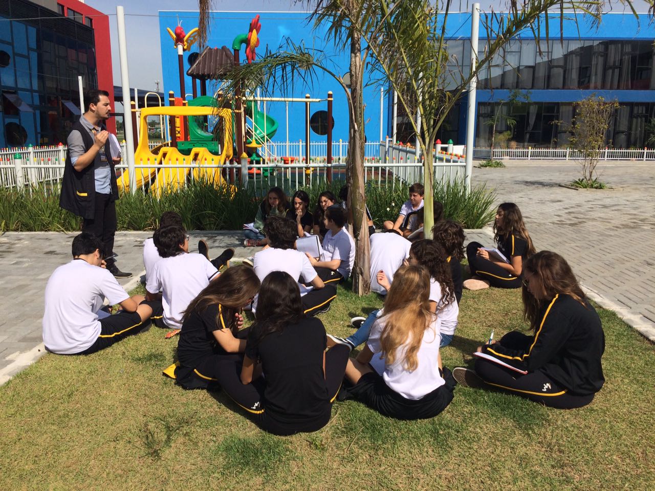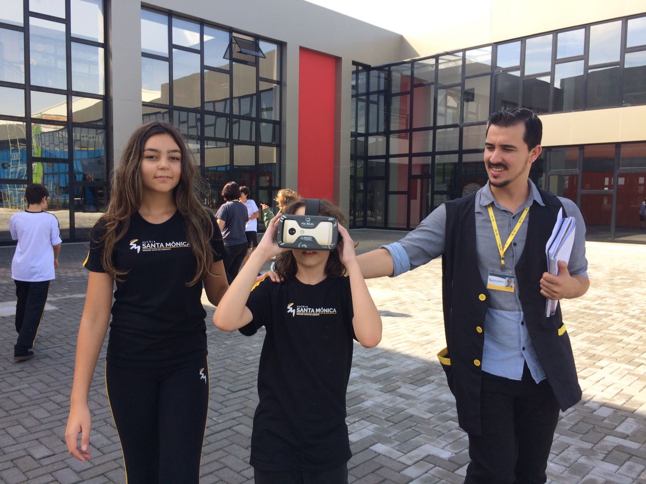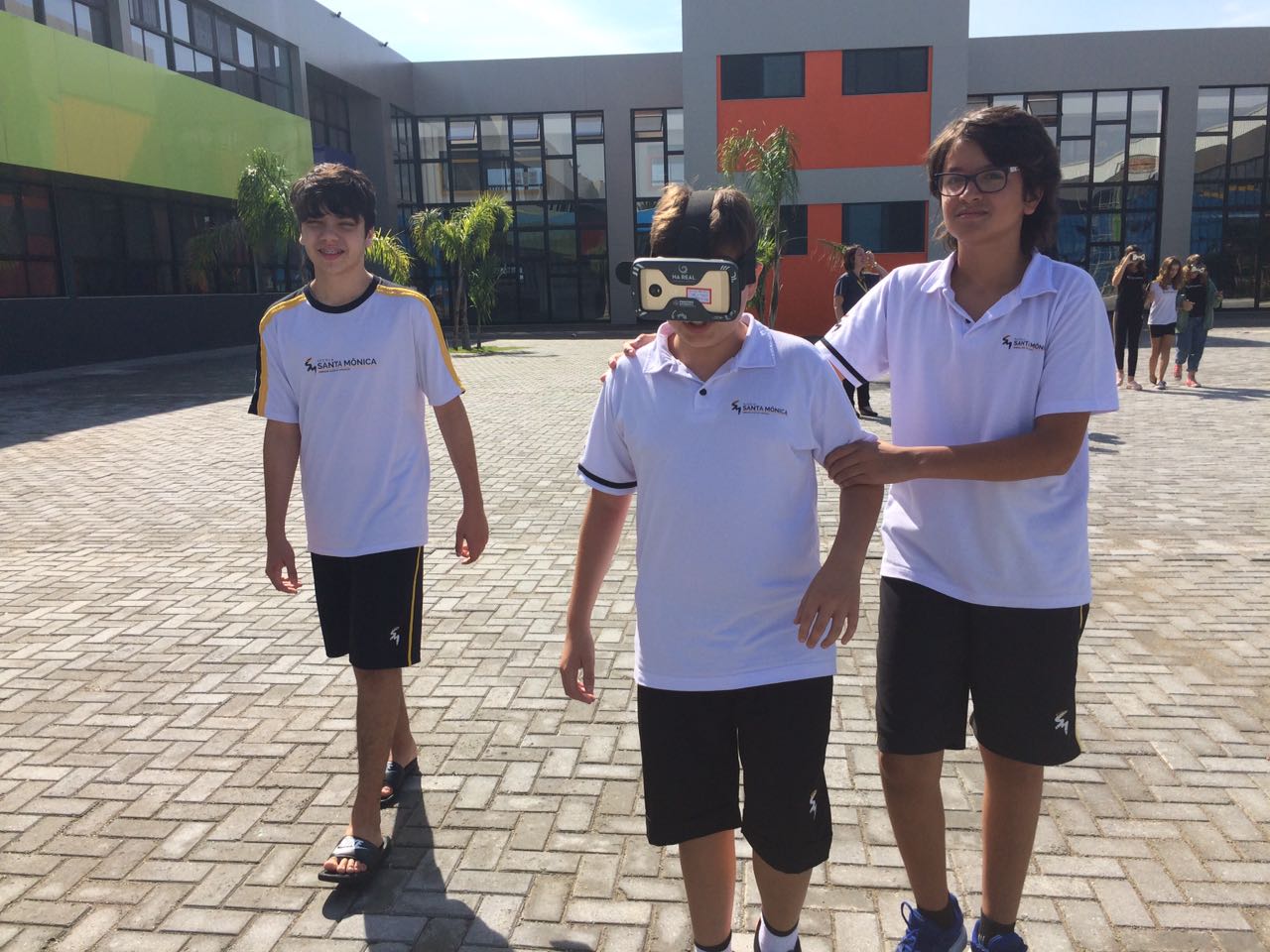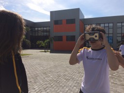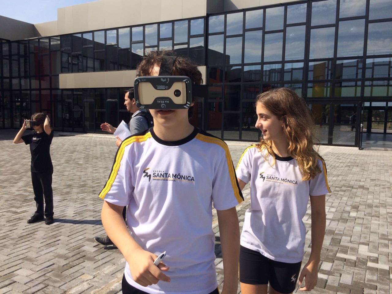 Os alunos de 7º ano do Ensino Fundamental utilizaram os óculos de realidade virtual para revisar os conceitos aprendidos na aula de Português, como conotação, denotação e figuras de linguagem. No pátio da escola eles puderam conversar e relacionar o conteúdo com um vídeo sobre mobilidade urbana.