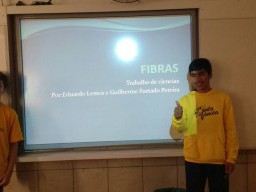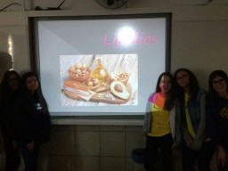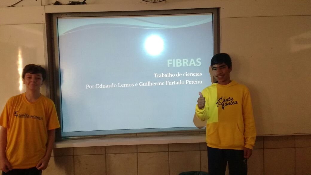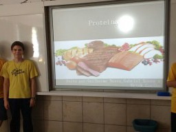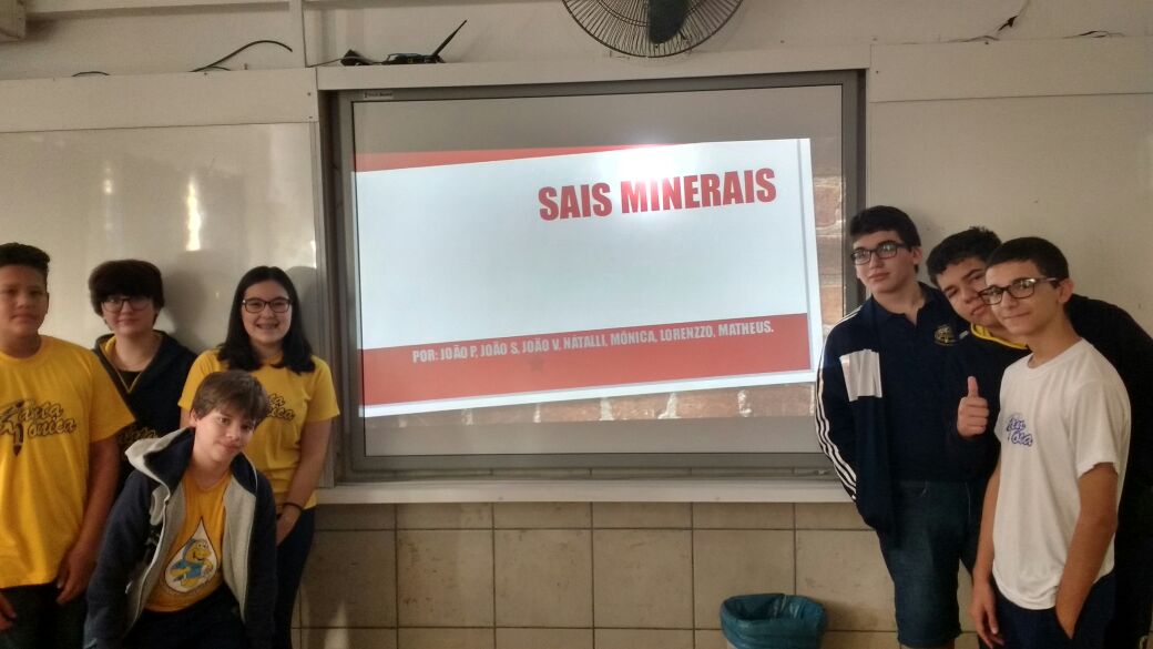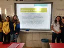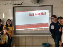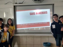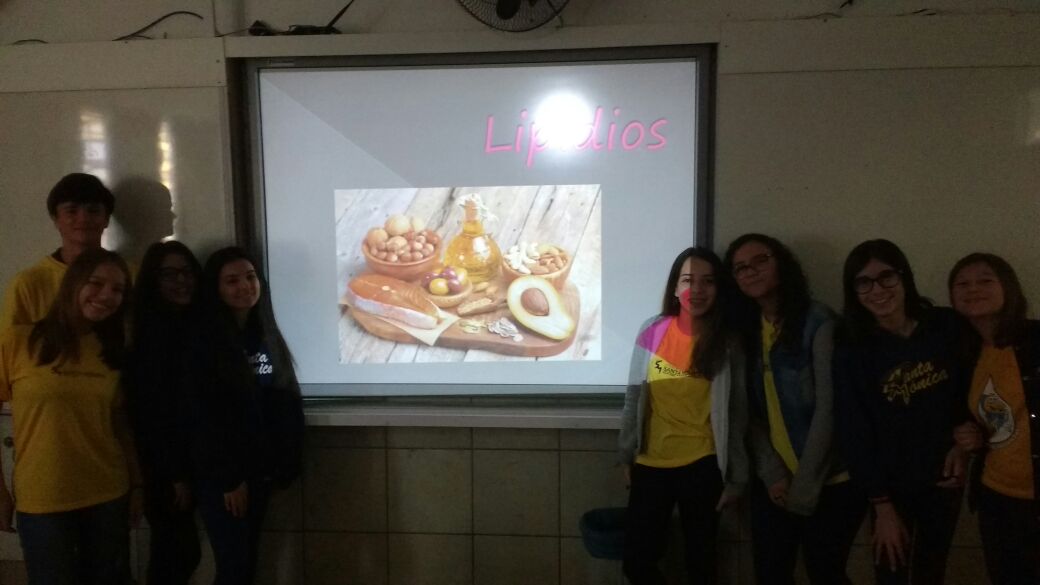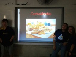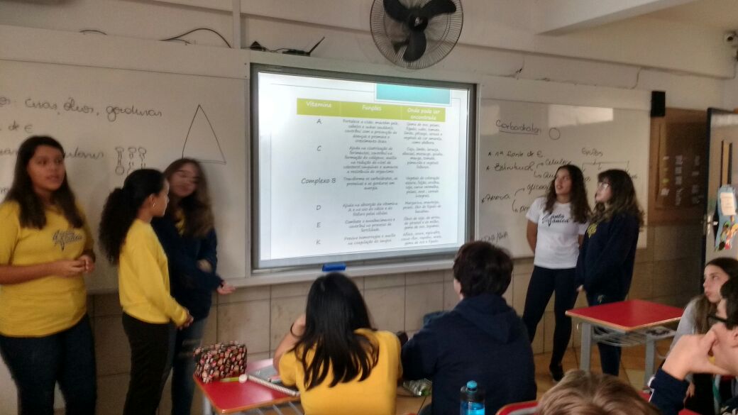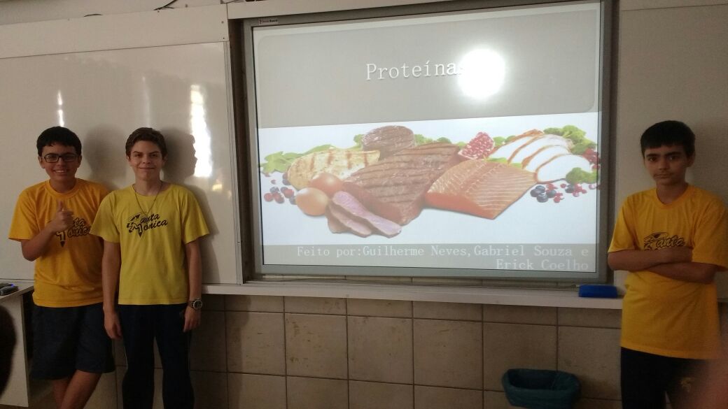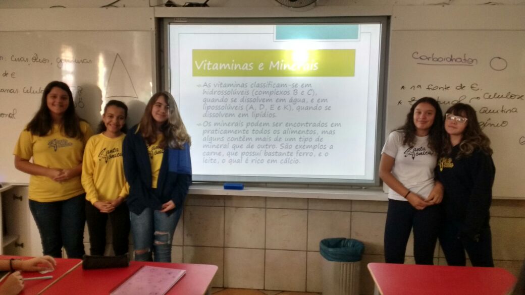 Utilizando a lousa digital, os alunos de 8º ano do Ensino Fundamental se dividiram em grupos e apresentaram trabalhos na aula de Ciências, professora Charlene, sobre nutrientes que compõem uma alimentação saudável.
