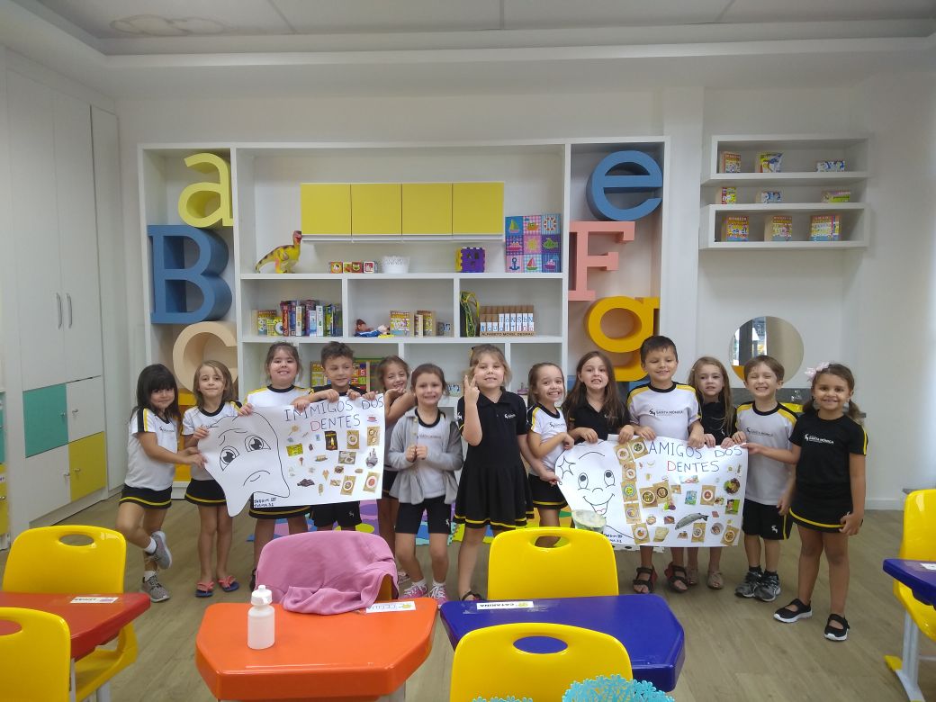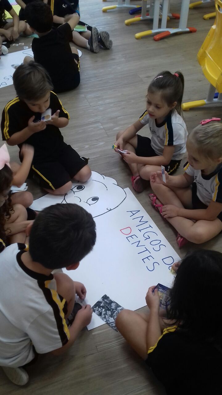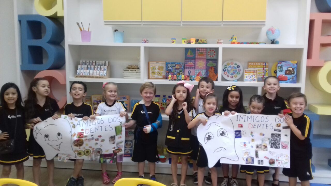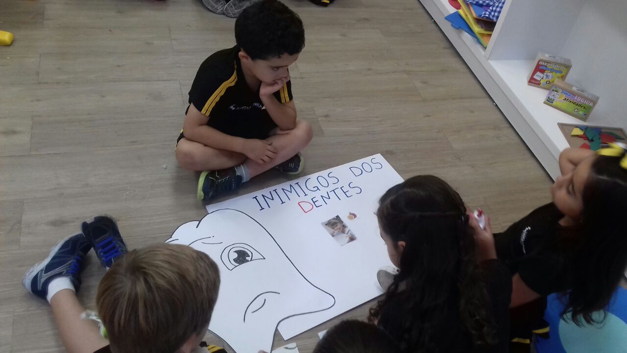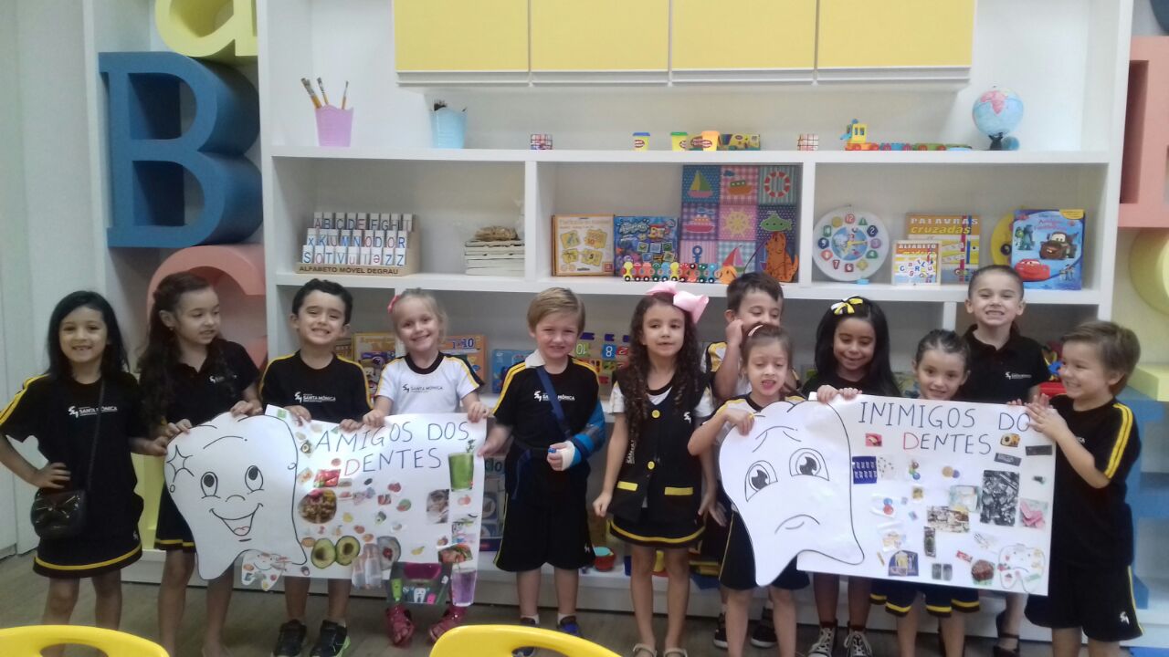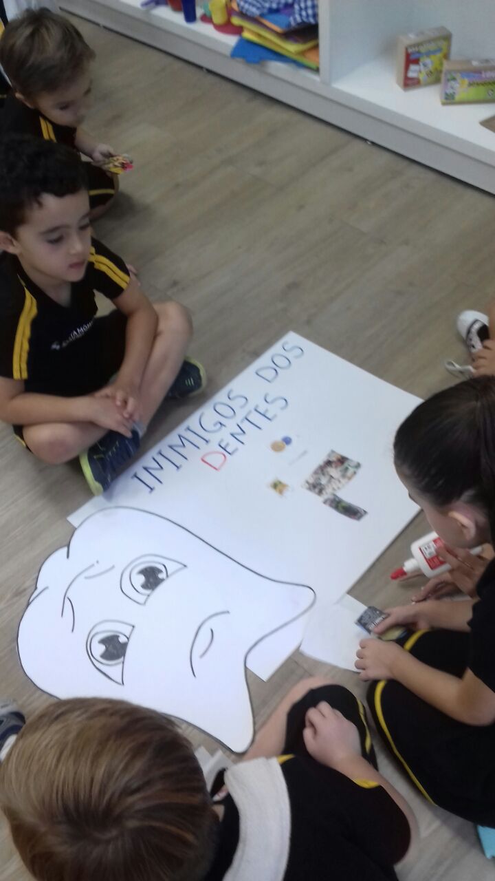 Nossos alunos de Jardim III participaram de mais uma aula sobre saúde bucal, na qual aprenderam a identificar os alimentos amigos e inimigos dos dentes Depois de identificá-los, eles produziram cartazes representando os grupos .