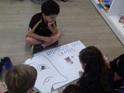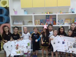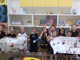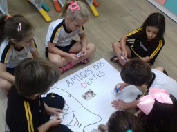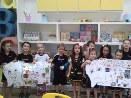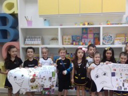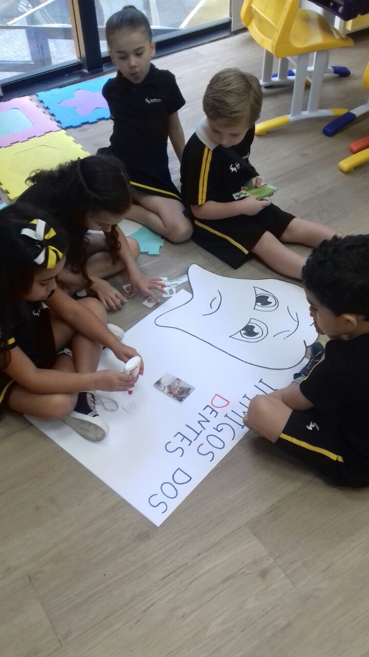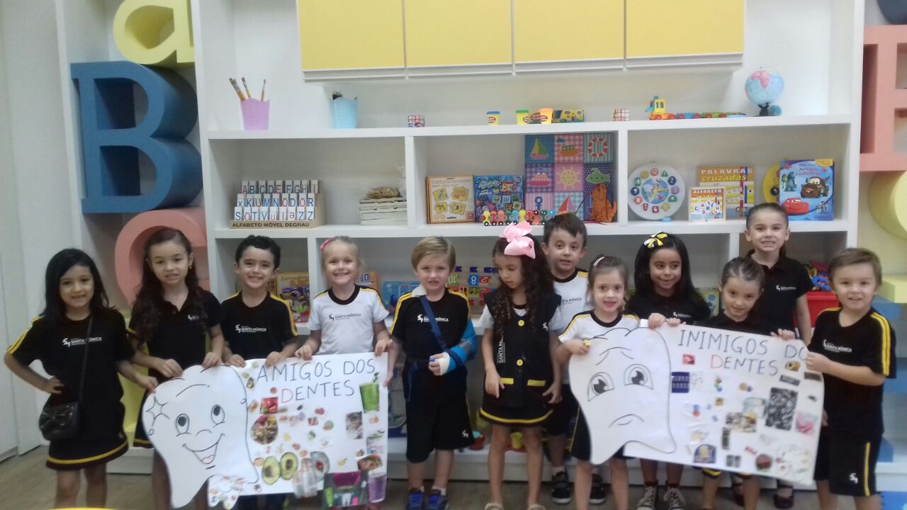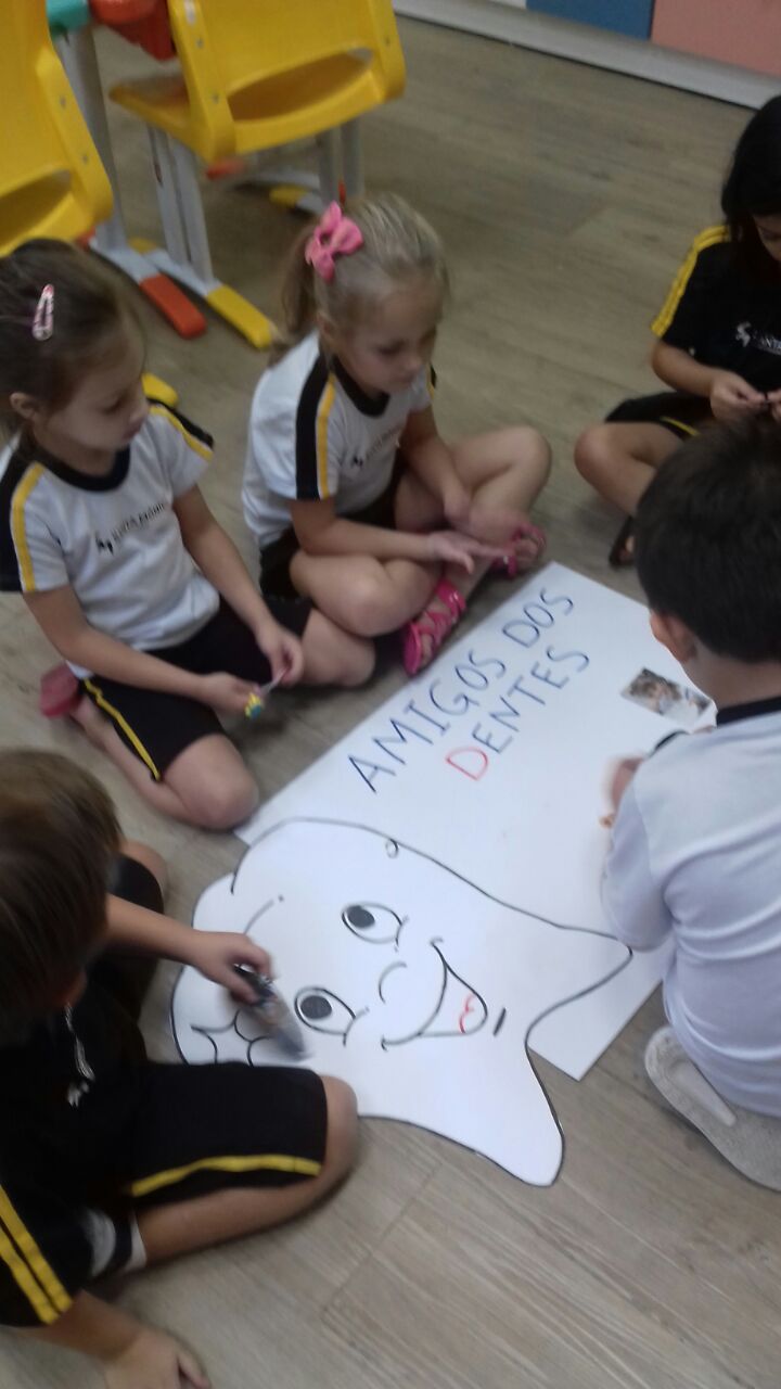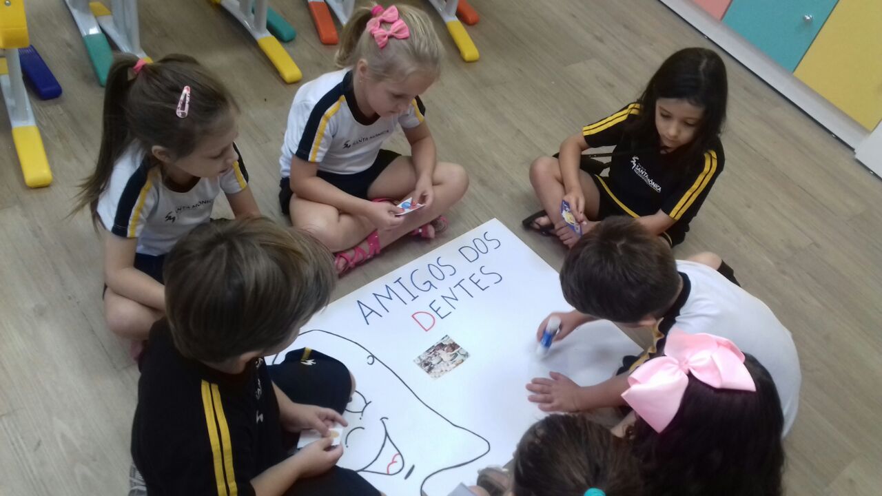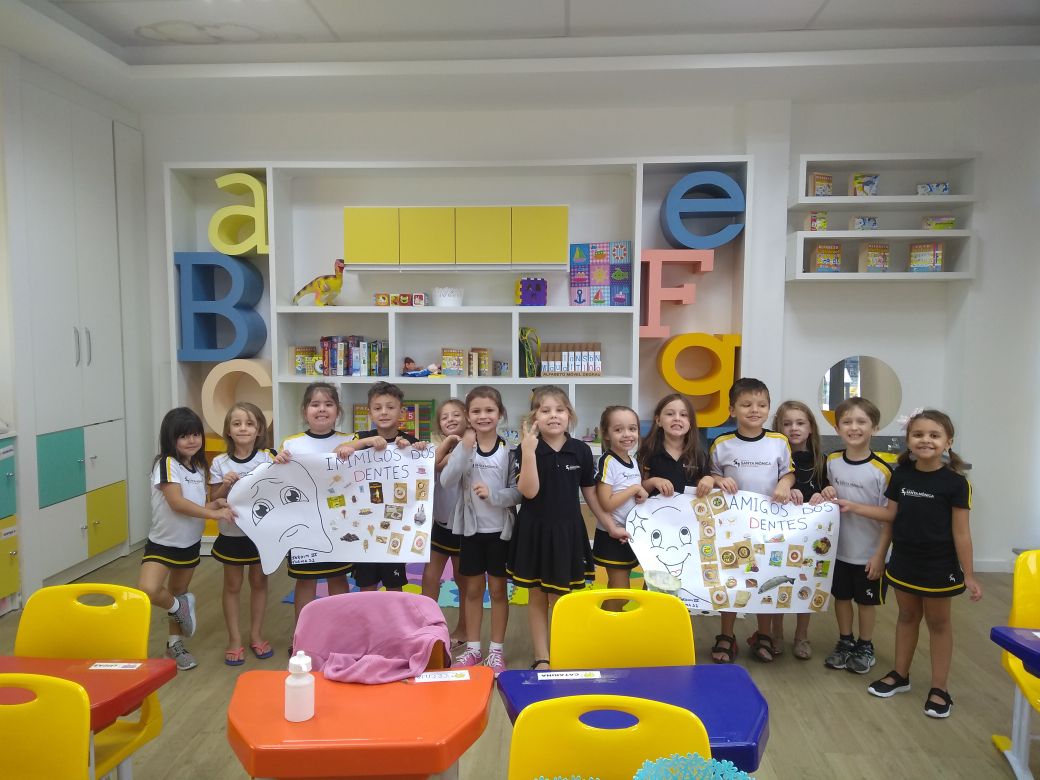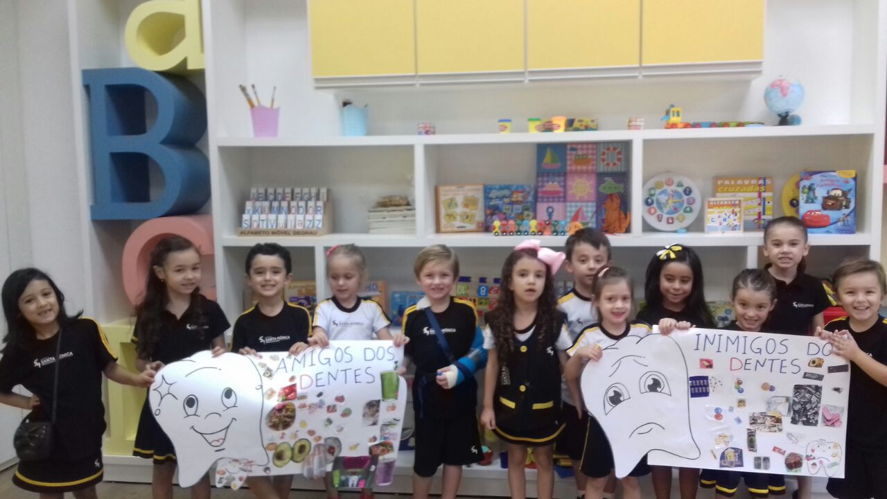 Nossos alunos de Jardim III participaram de mais uma aula sobre saúde bucal, na qual aprenderam a identificar os alimentos amigos e inimigos dos dentes Depois de identificá-los, eles produziram cartazes representando os grupos .
