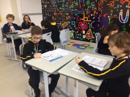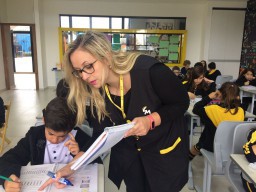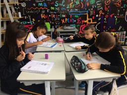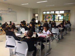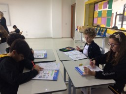 Os alunos de 3º ano do Ensino Fundamental utilizaram os cubinhos dourados disponíveis no espaço da Matemágica para relembrar os conceitos de centena e dezena.