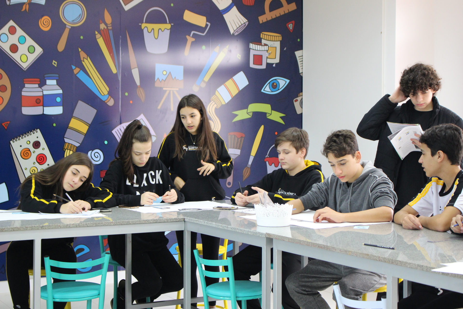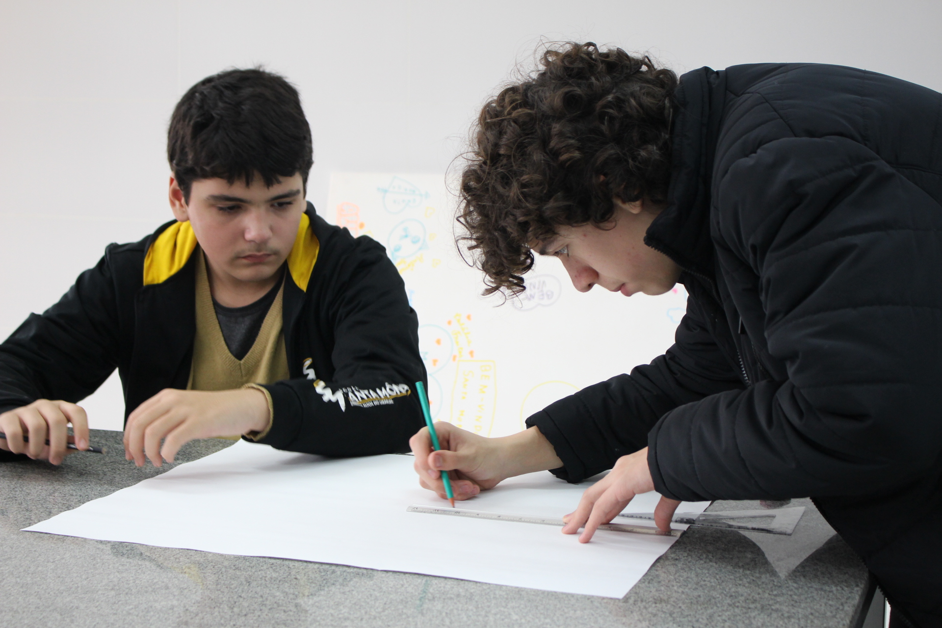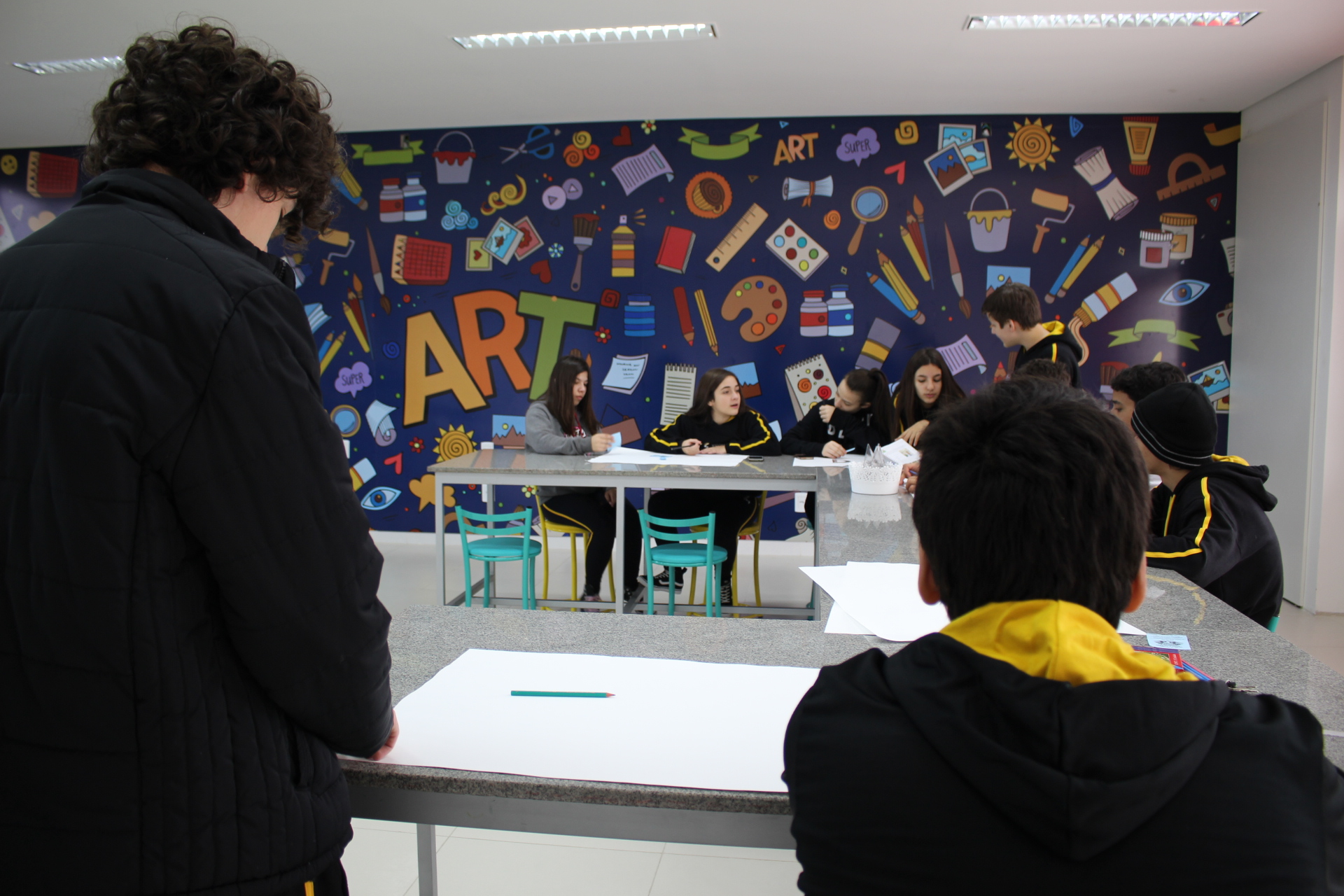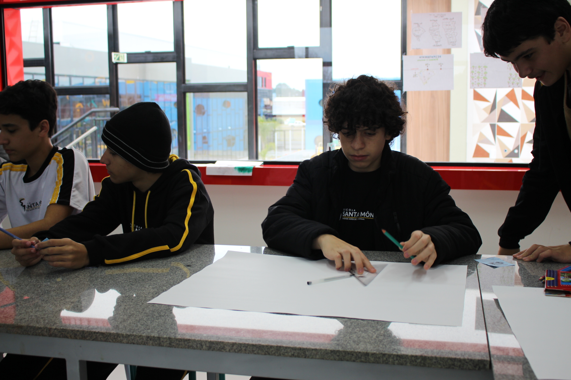 Para aplicar os conteúdos aprendidos durante as aulas de Arte, os alunos de 9º ano produziram cartazes utilizando os conceitos de perspectiva e ponto de fuga.