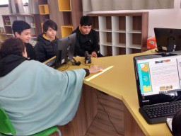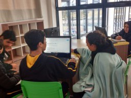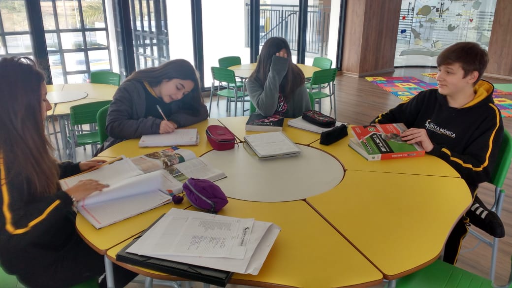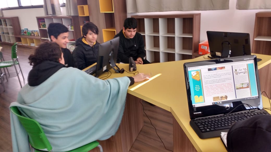 Os alunos de 9º ano utilizaram os livros didáticos e computadores disponíveis no espaço Colab Space como recurso para desenvolver uma pesquisa aprofundada sobre fungos.