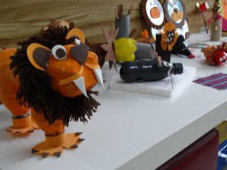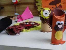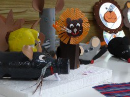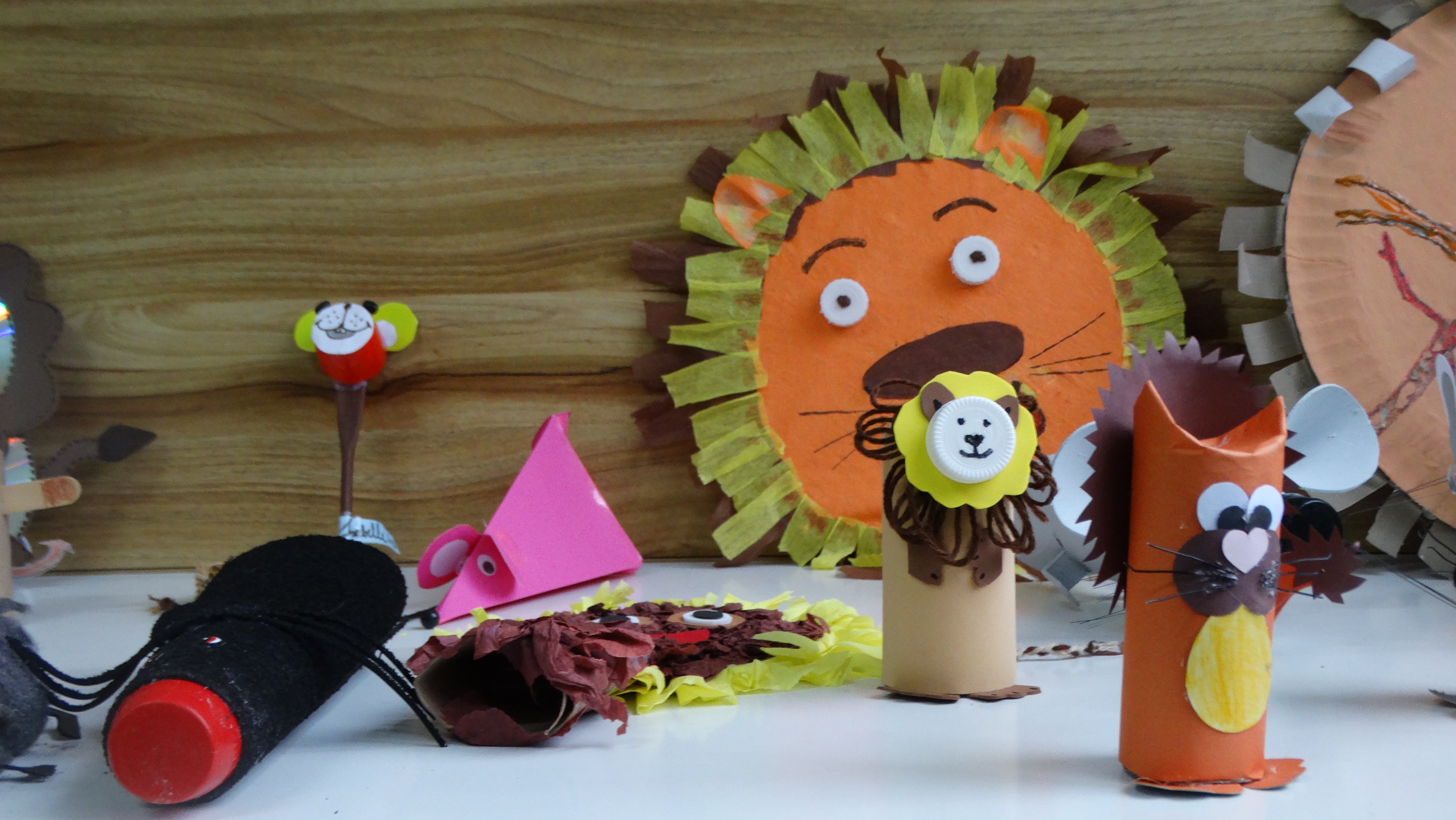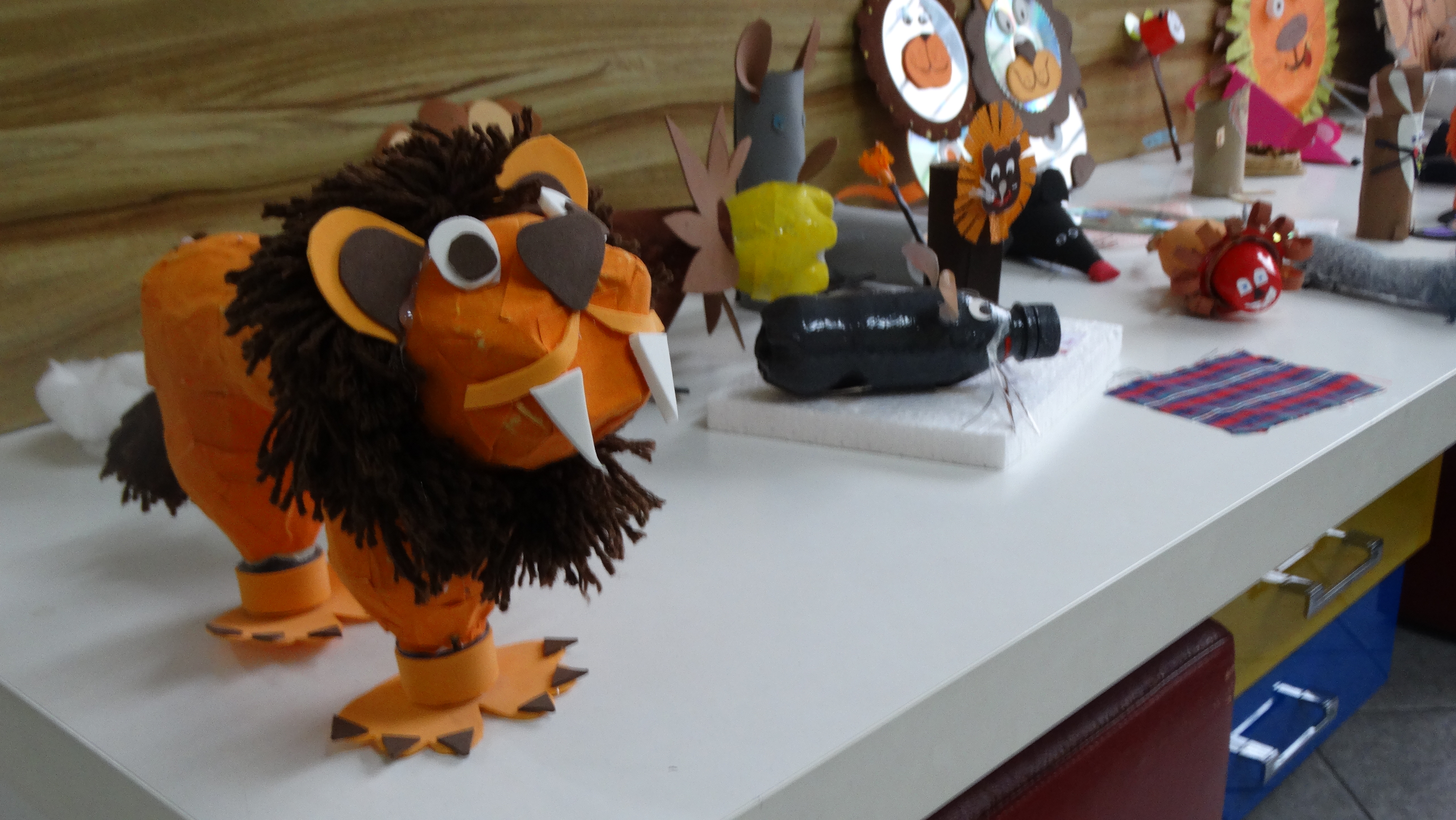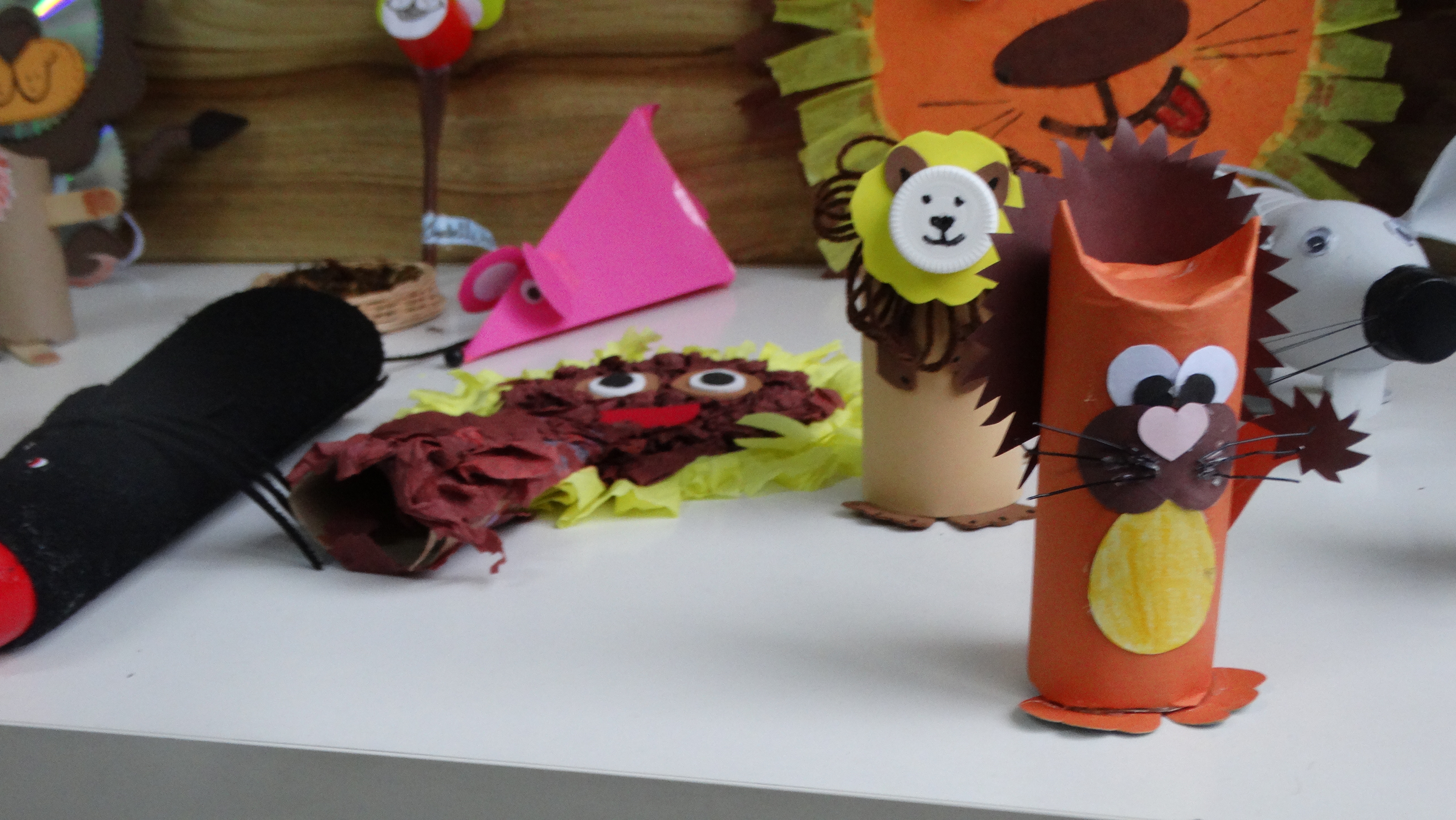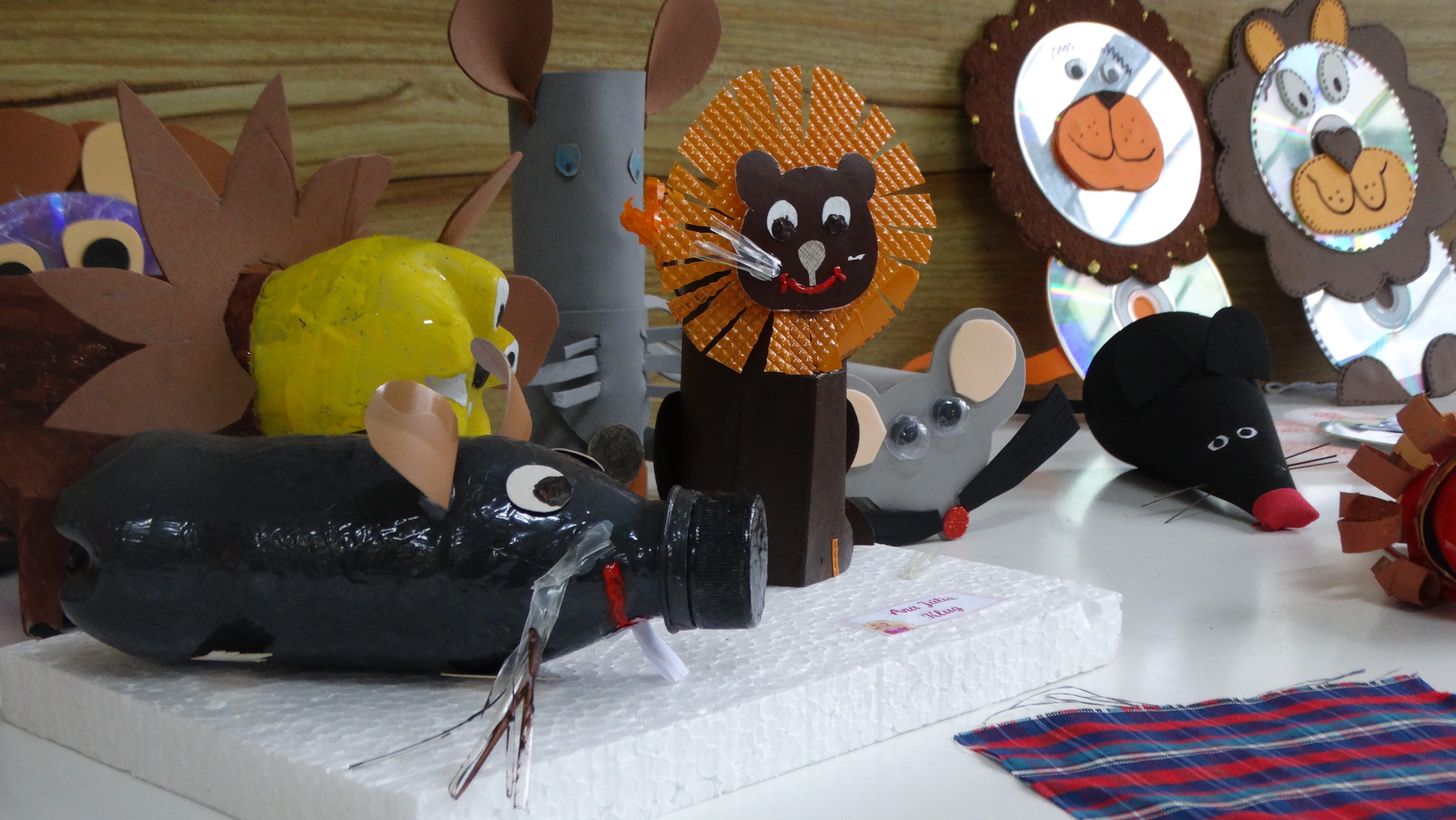 As turmas do Jardim III estão aprendendo sobre as letras do alfabeto. E para dar asas a imaginação, ouviram a história "O leão e o rato" e produziram os personagens principais da história utilizando material reciclável.