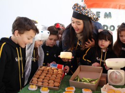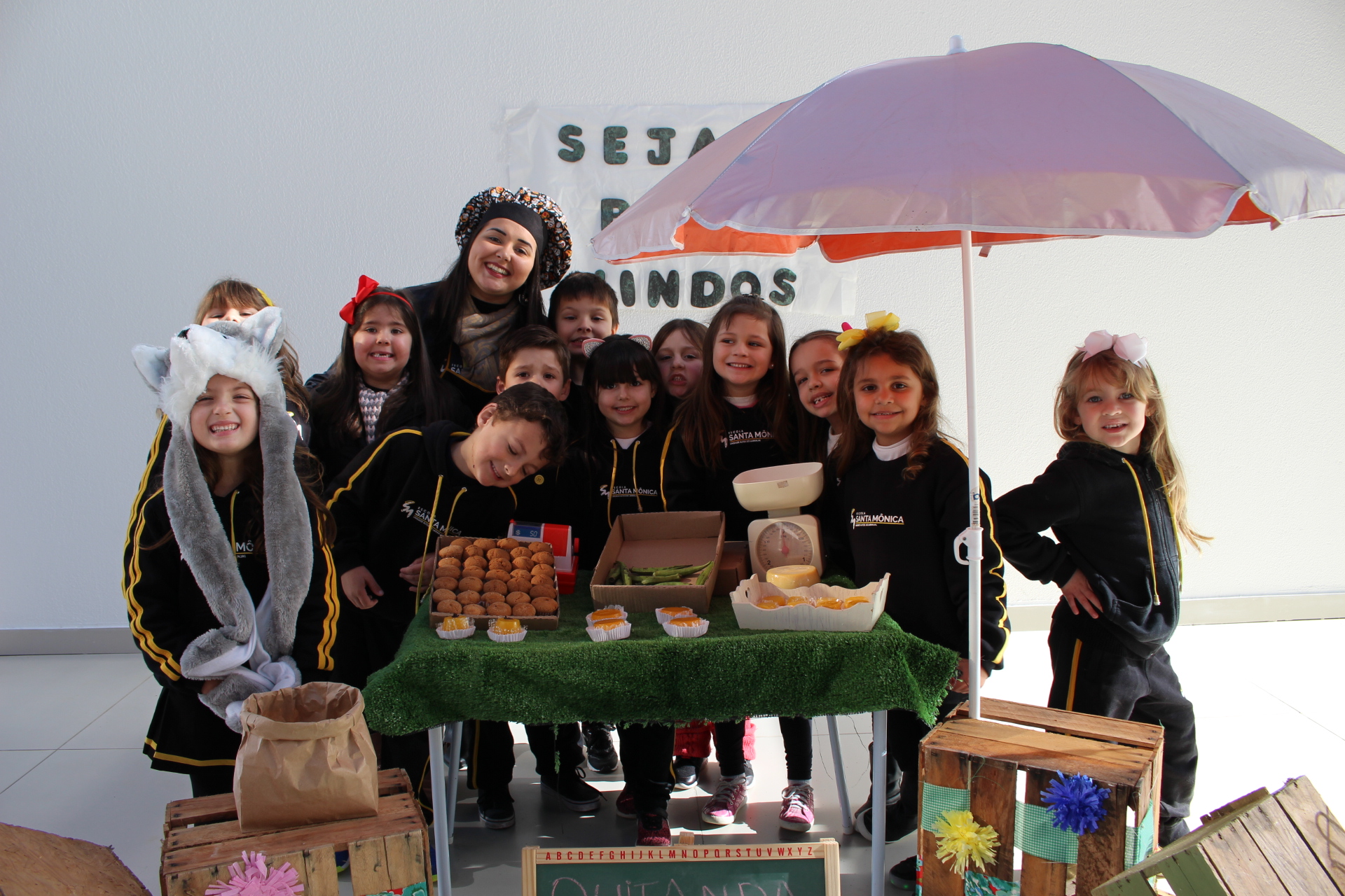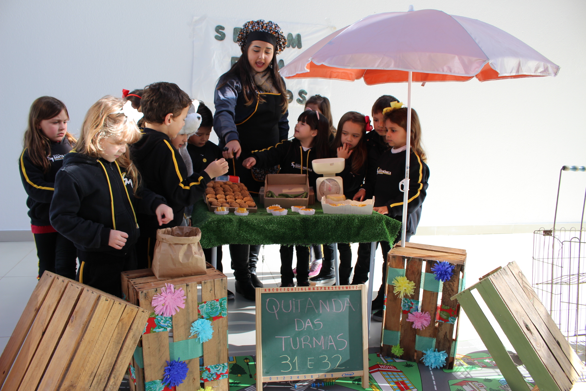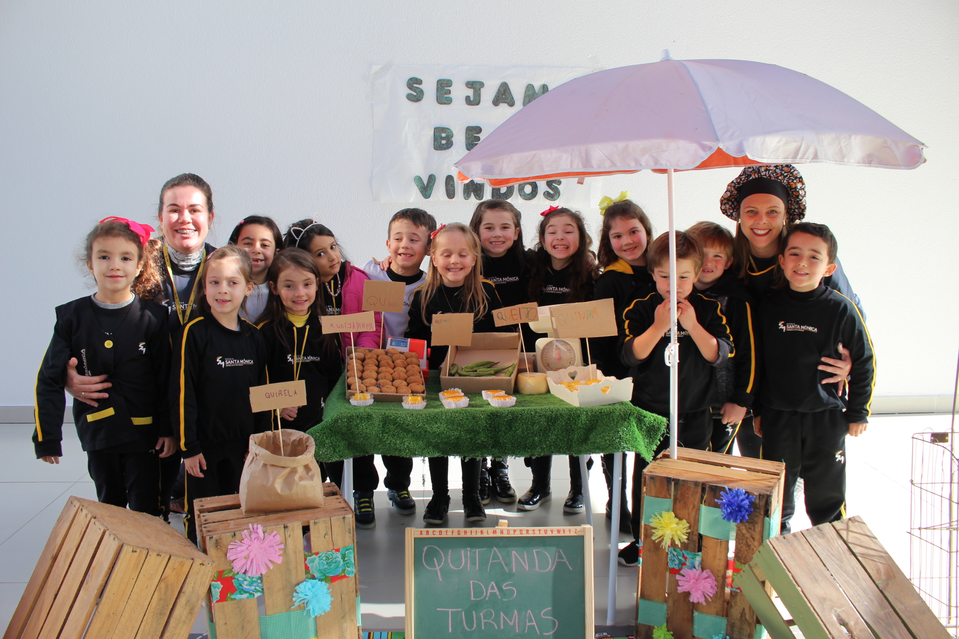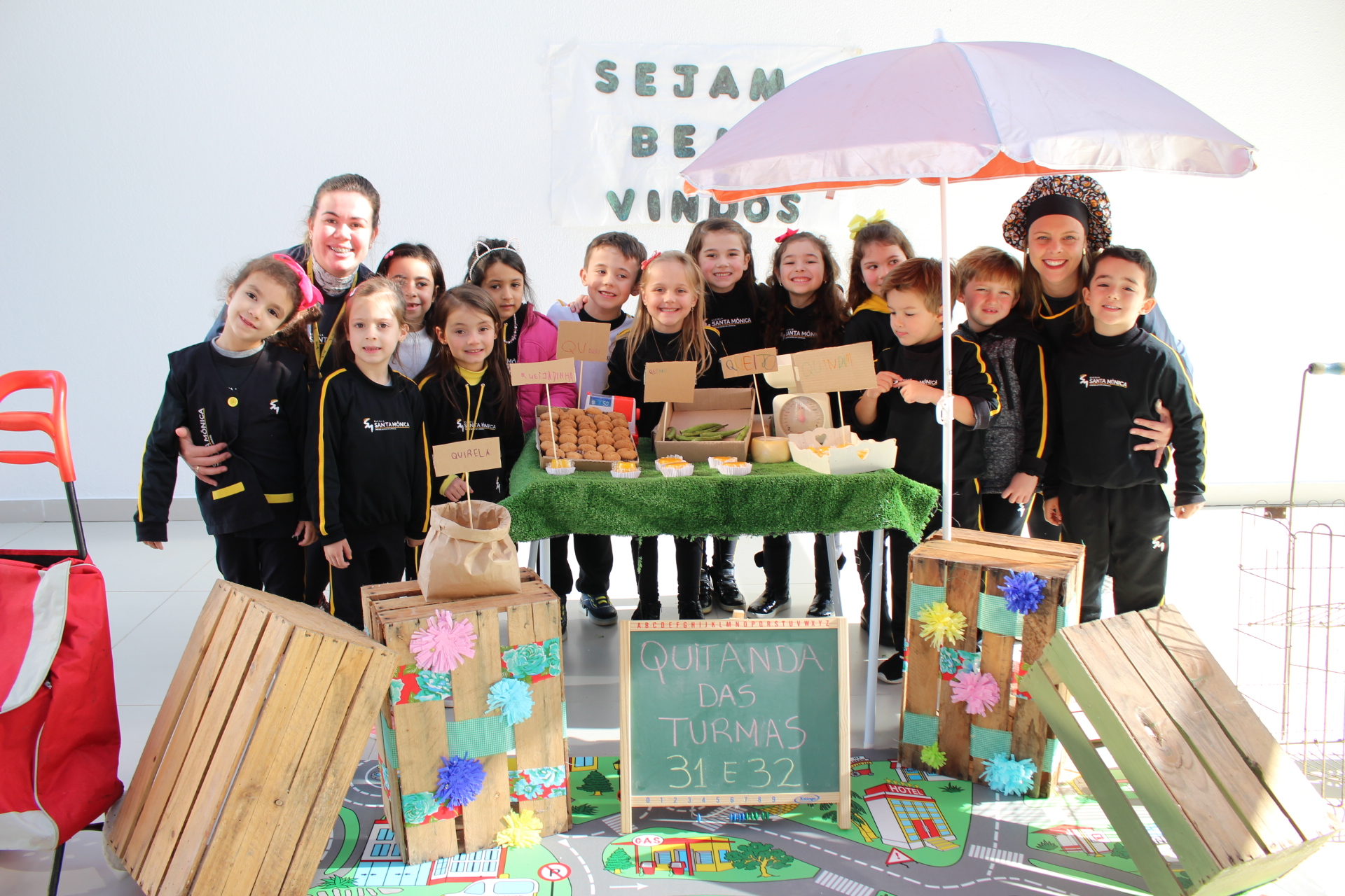 Os alunos do jardim III, turmas 31 e 32, estão conhecendo as letras do alfabeto e aprenderam palavras que começam com a letra "Q". Eles visitaram uma quitanda recheada de produtos especiais, como queijo, queijadinha, quindim e queque.