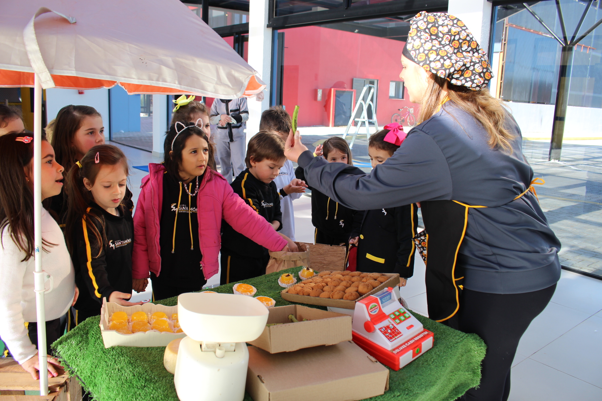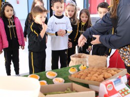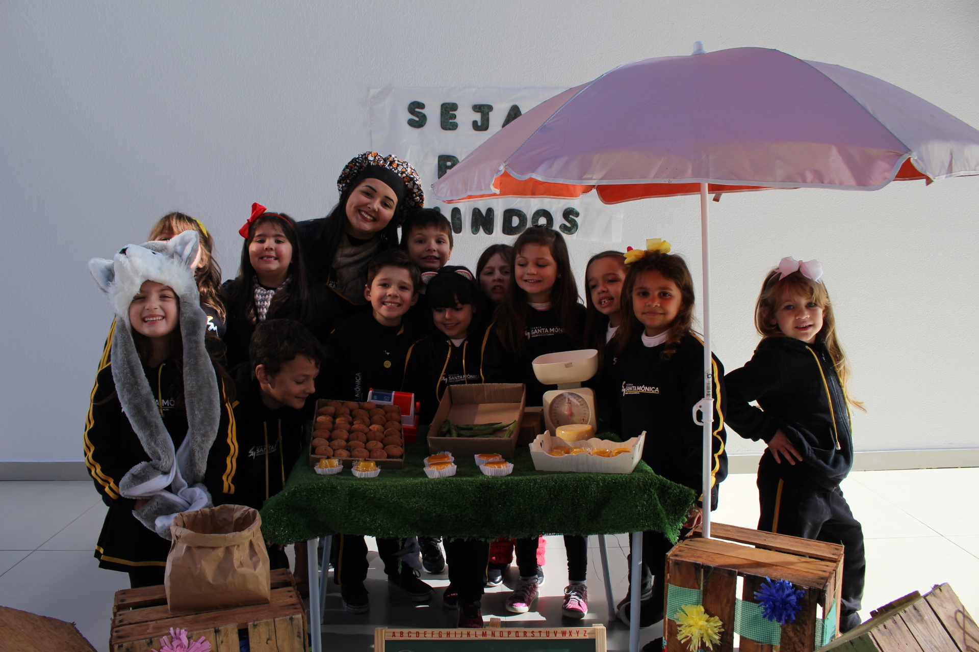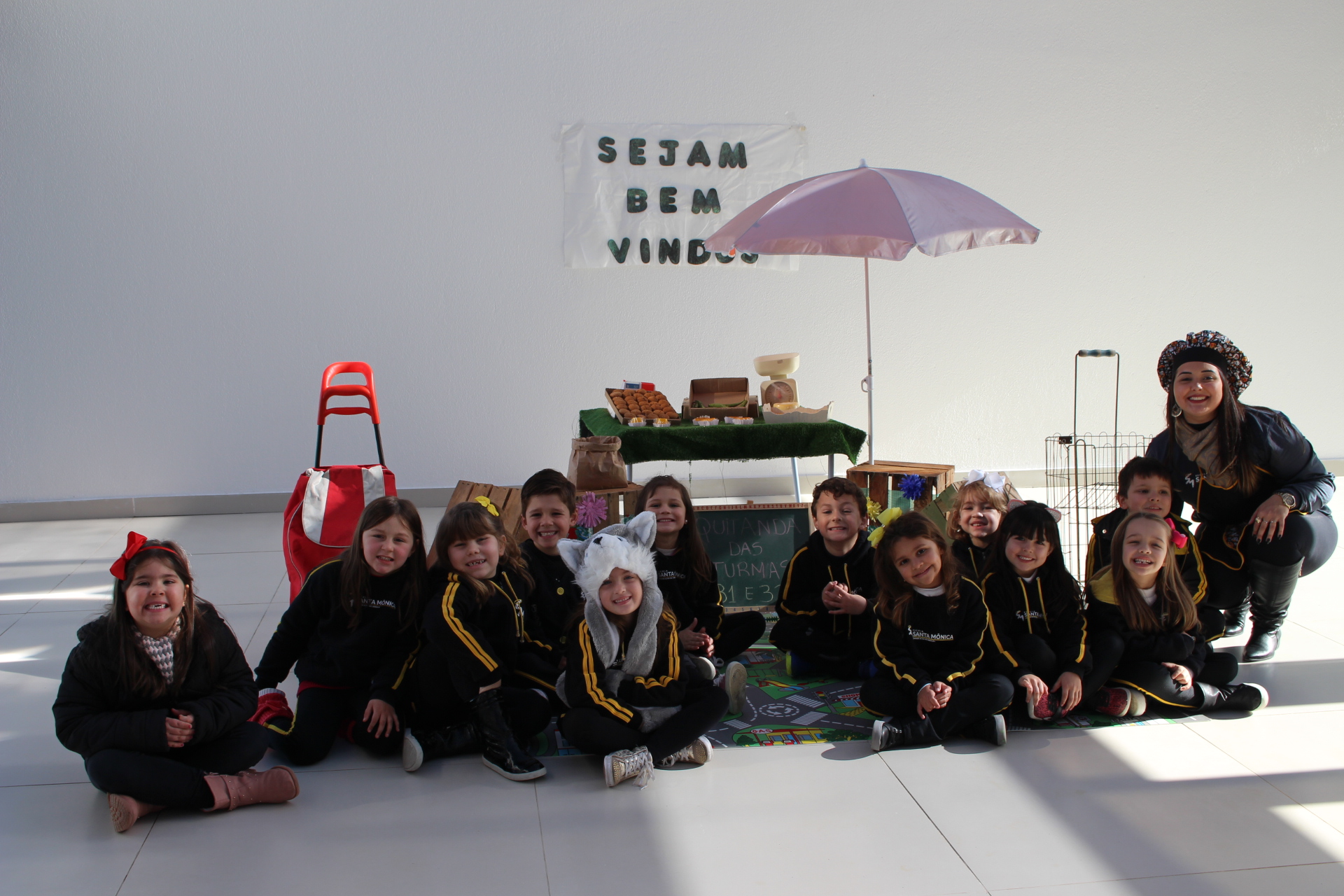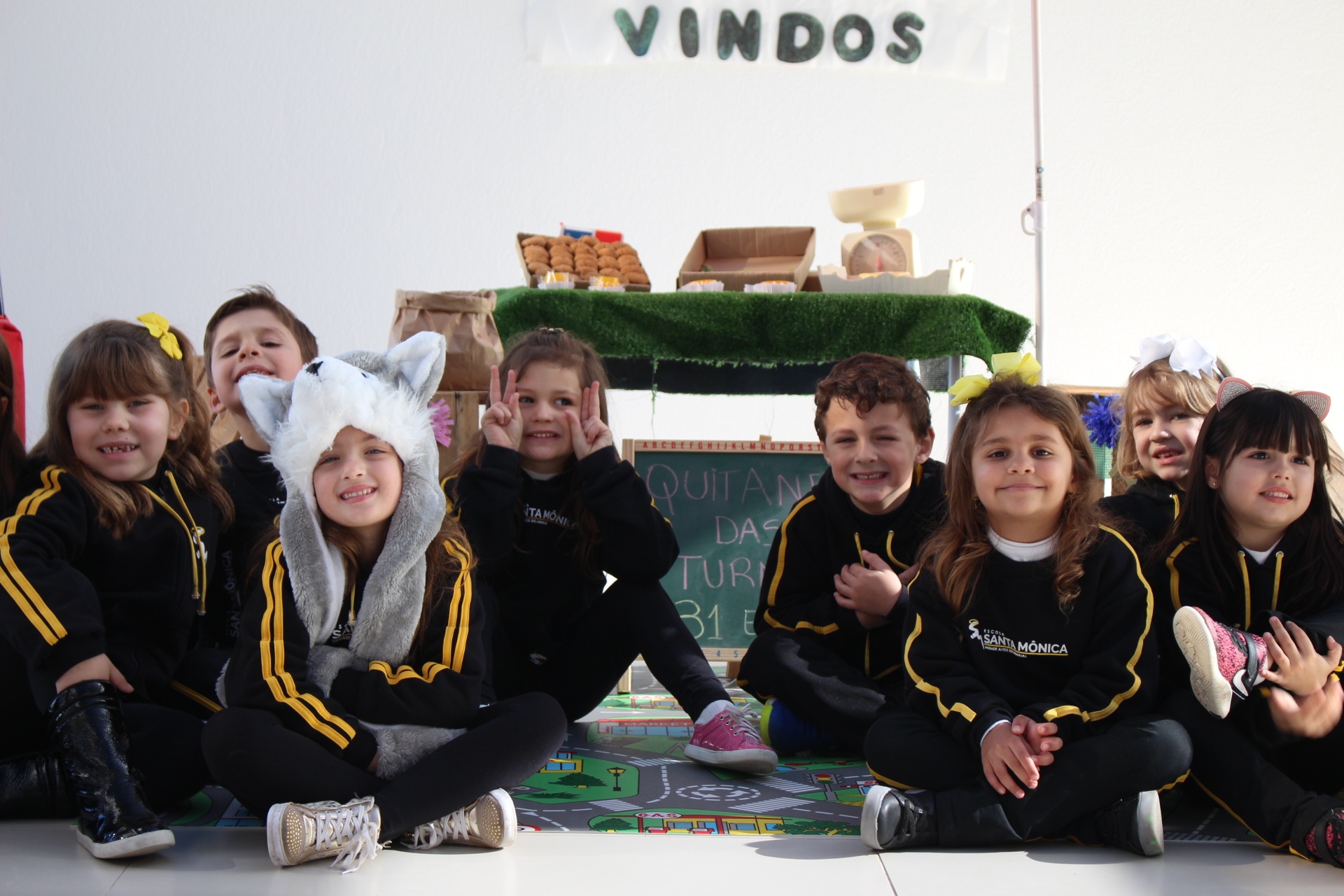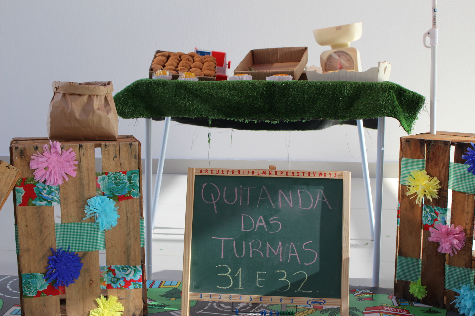 Os alunos do jardim III, turmas 31 e 32, estão conhecendo as letras do alfabeto e aprenderam palavras que começam com a letra "Q". Eles visitaram uma quitanda recheada de produtos especiais, como queijo, queijadinha, quindim e queque.