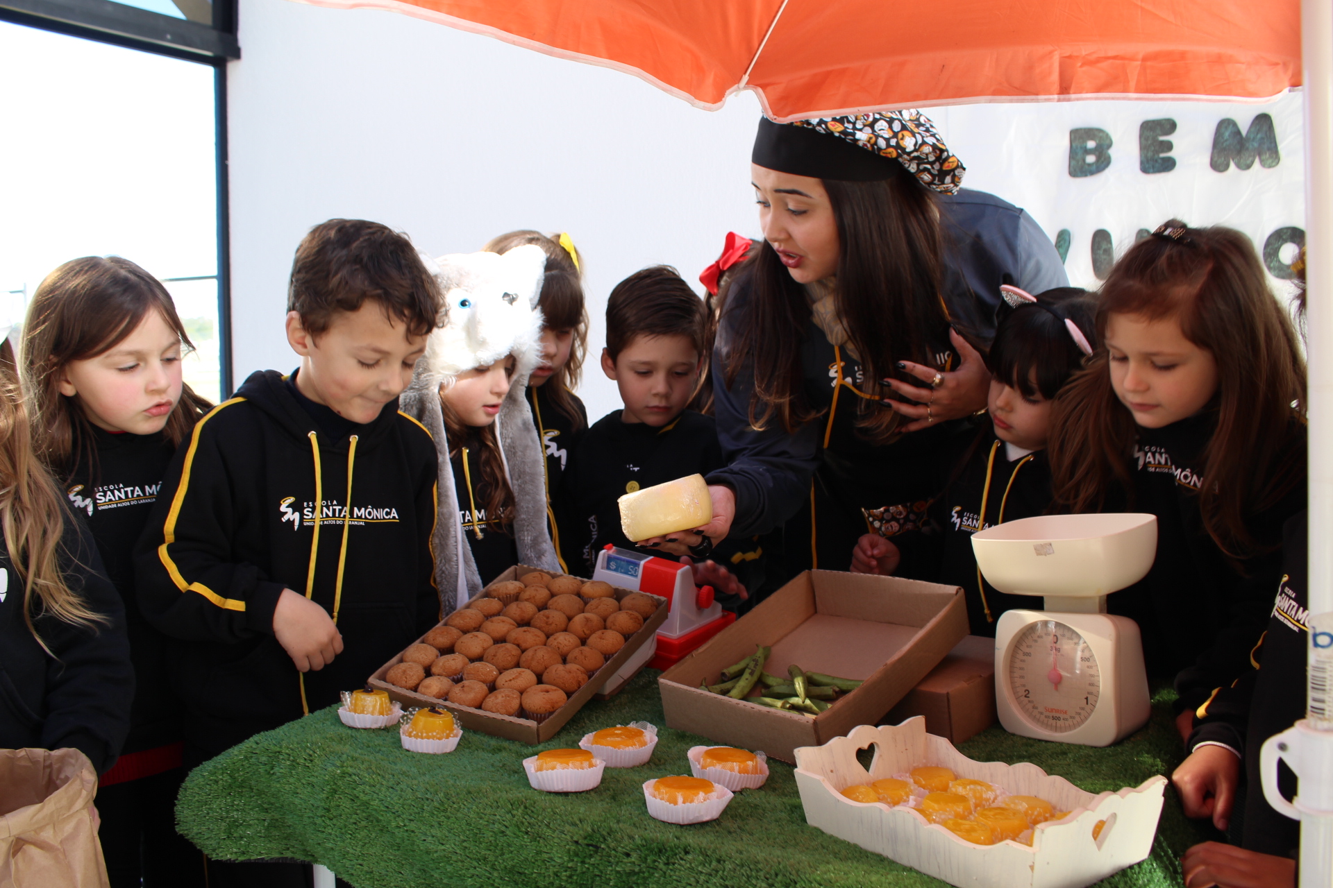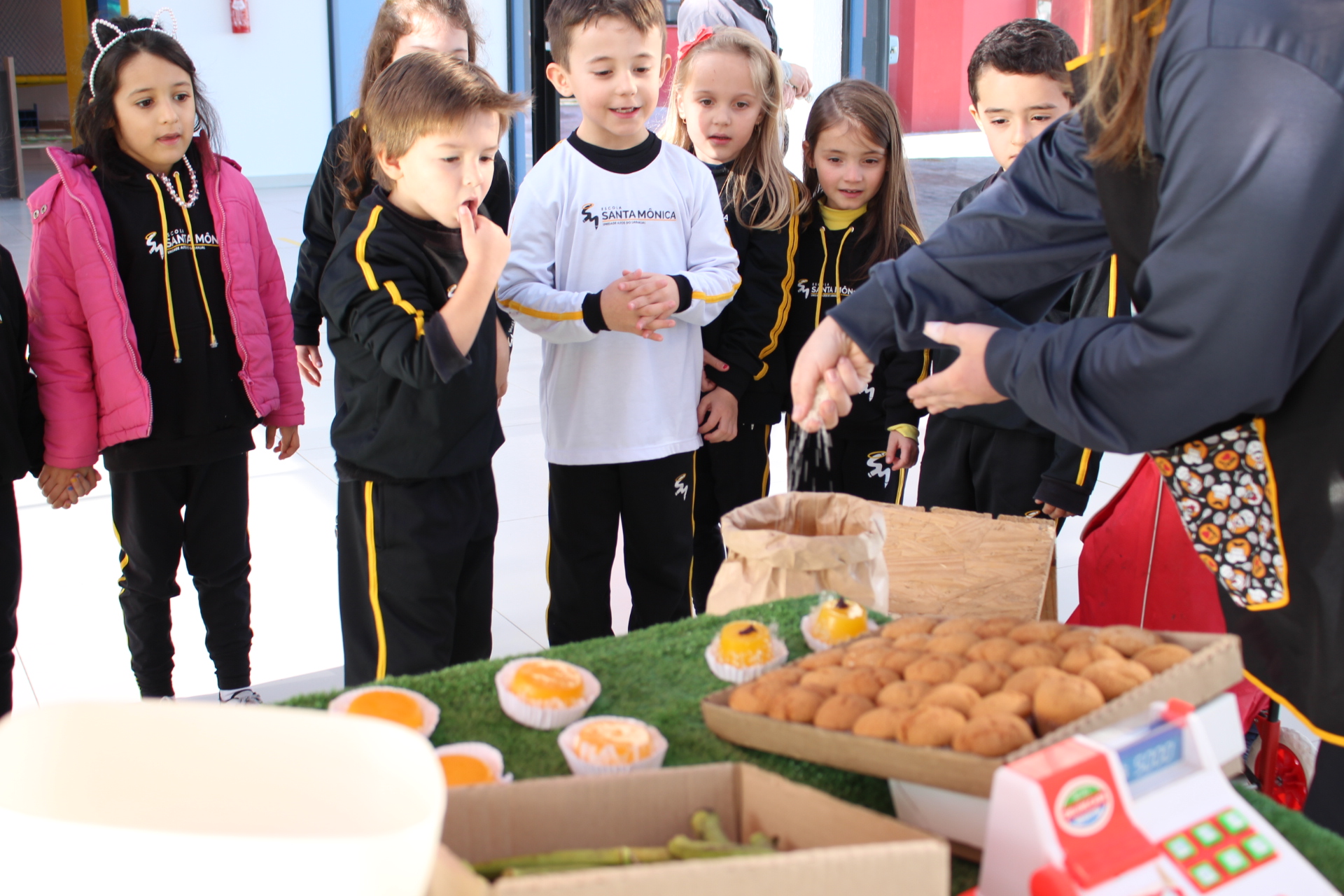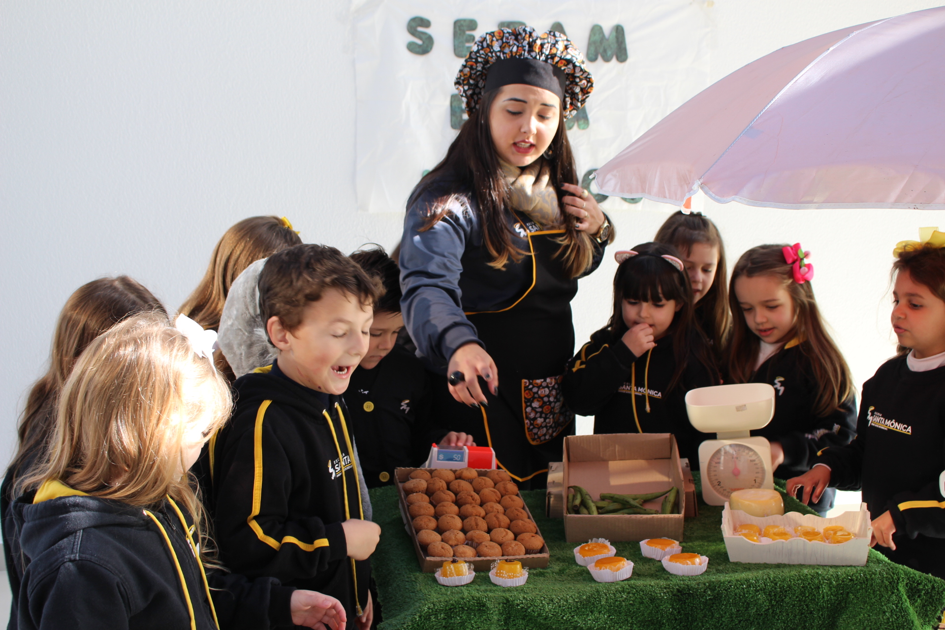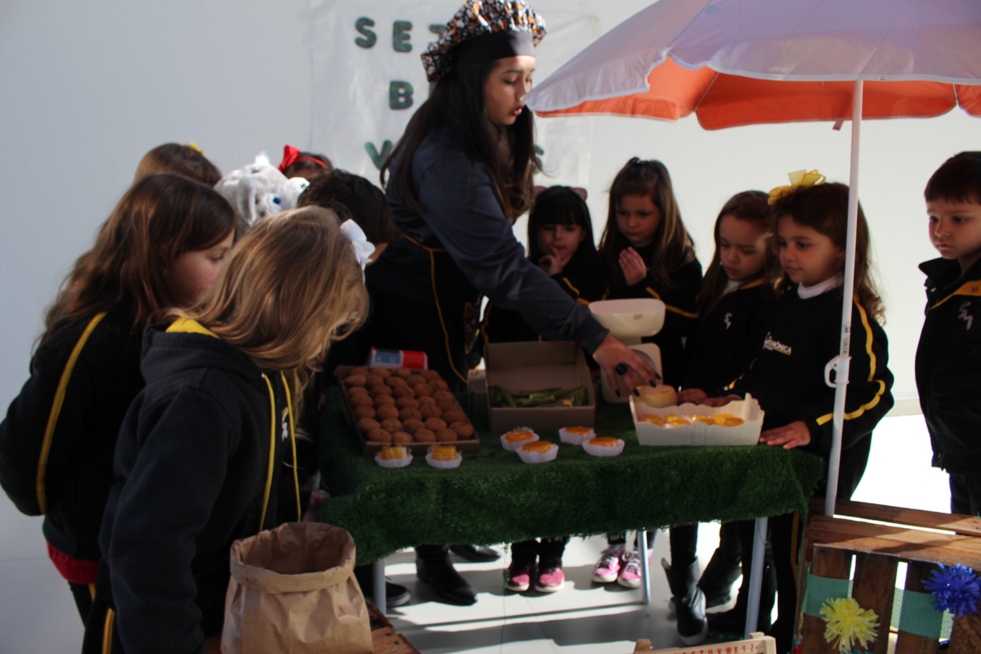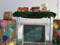 Os alunos do jardim III, turmas 31 e 32, estão conhecendo as letras do alfabeto e aprenderam palavras que começam com a letra "Q". Eles visitaram uma quitanda recheada de produtos especiais, como queijo, queijadinha, quindim e queque.
