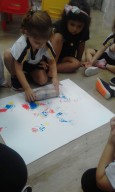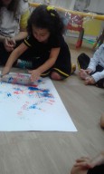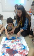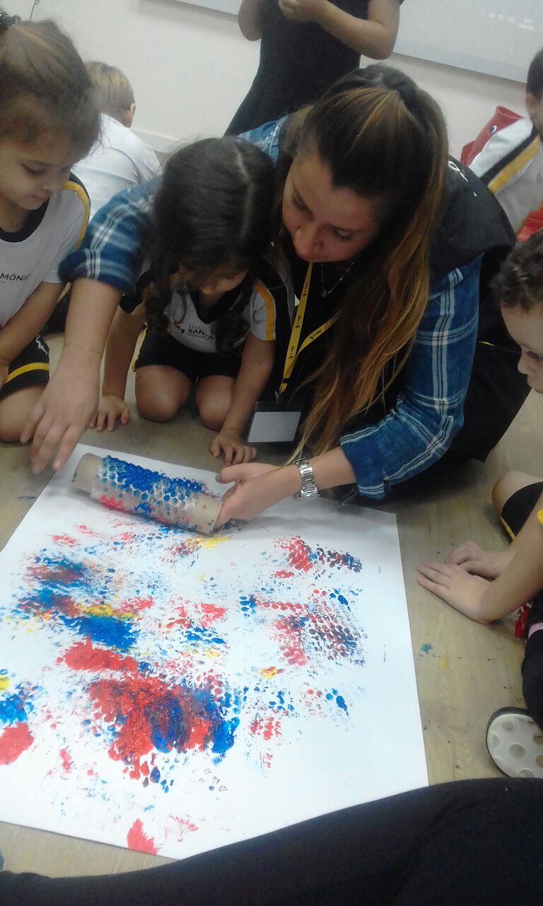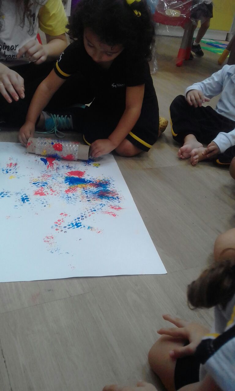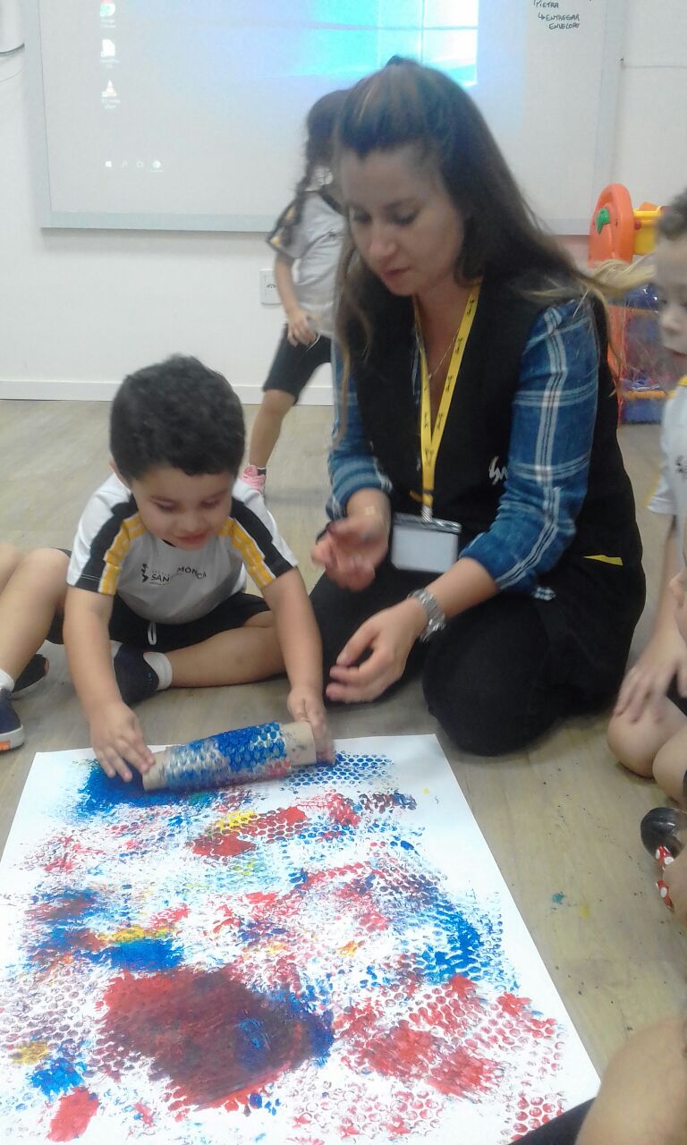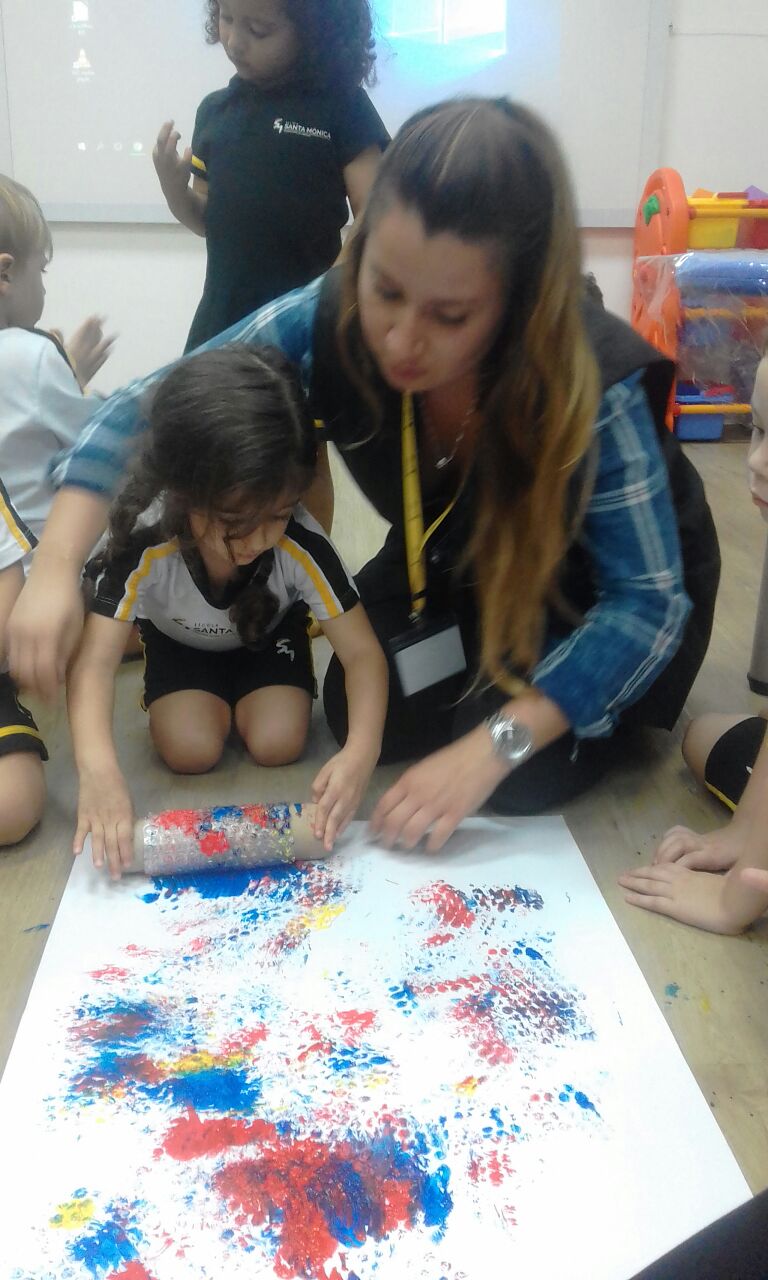 Os pequenos do Jardim I participaram de uma atividade lúdica sobre o universo das cores e utilizaram plástico bolha como técnica de pintura para aprofundar o conhecimento sobre cores primárias.