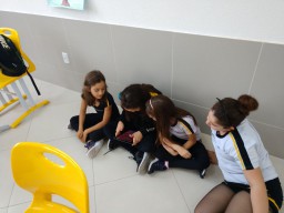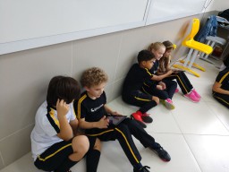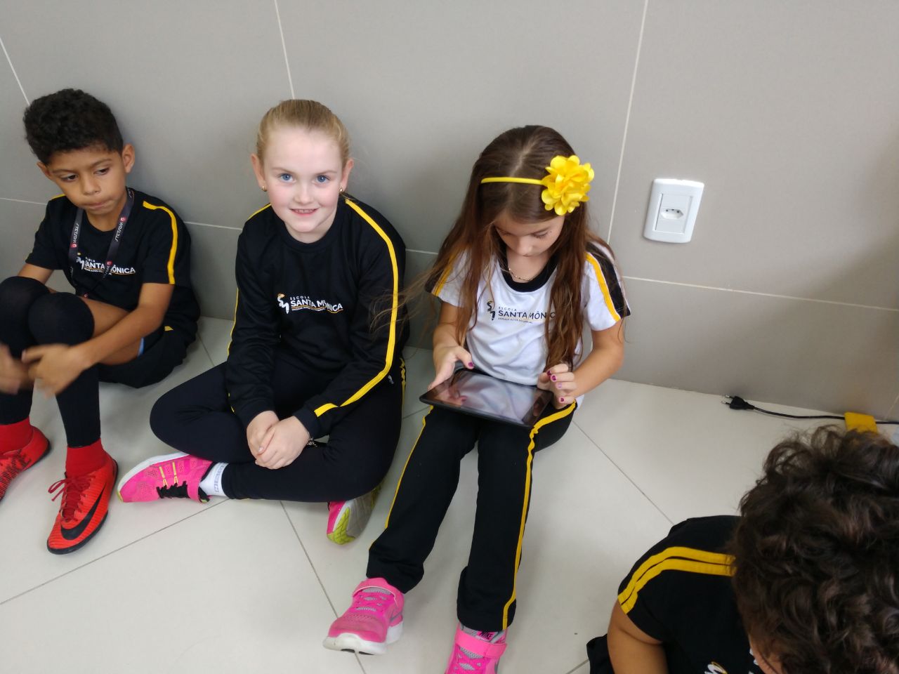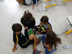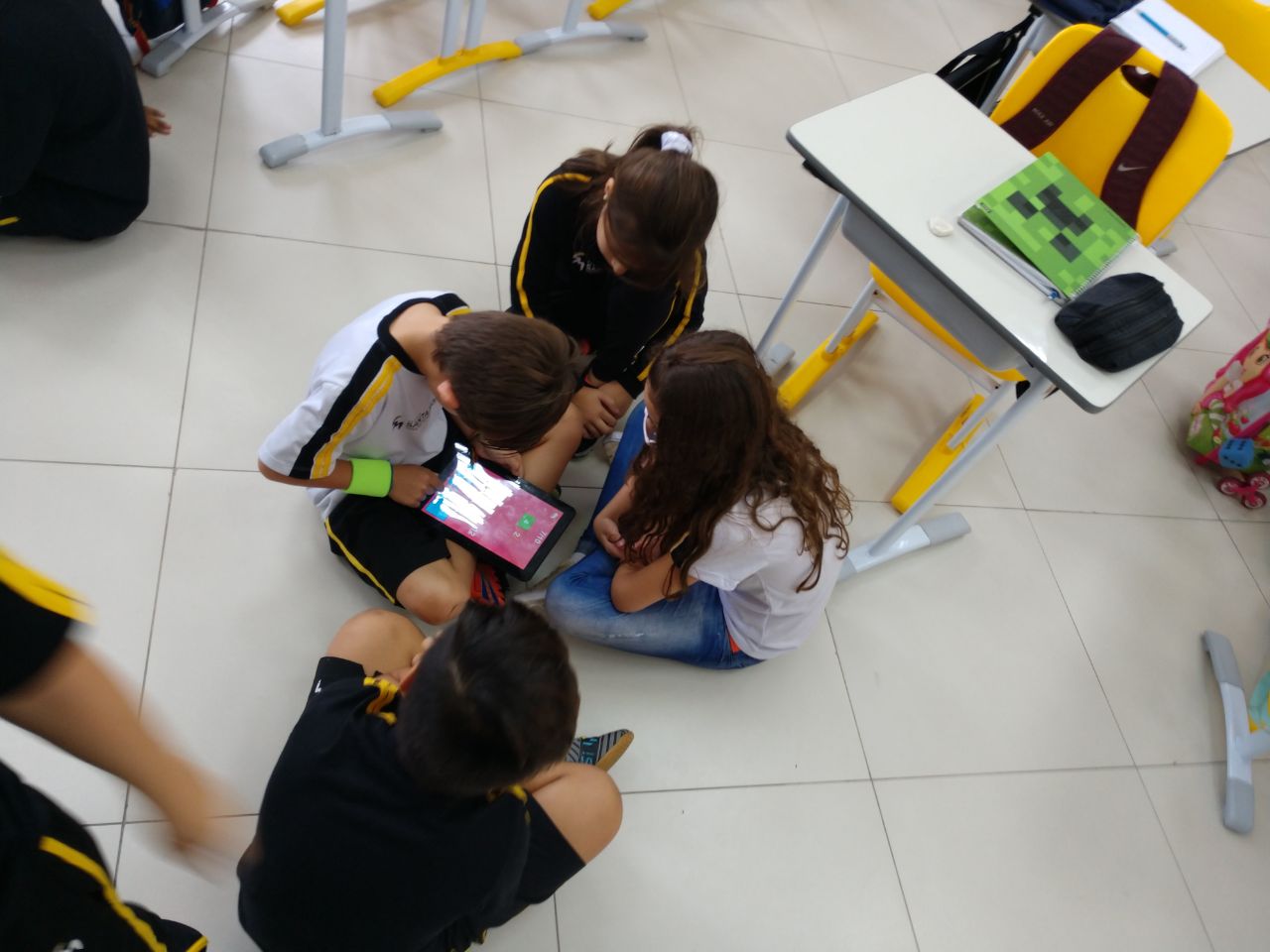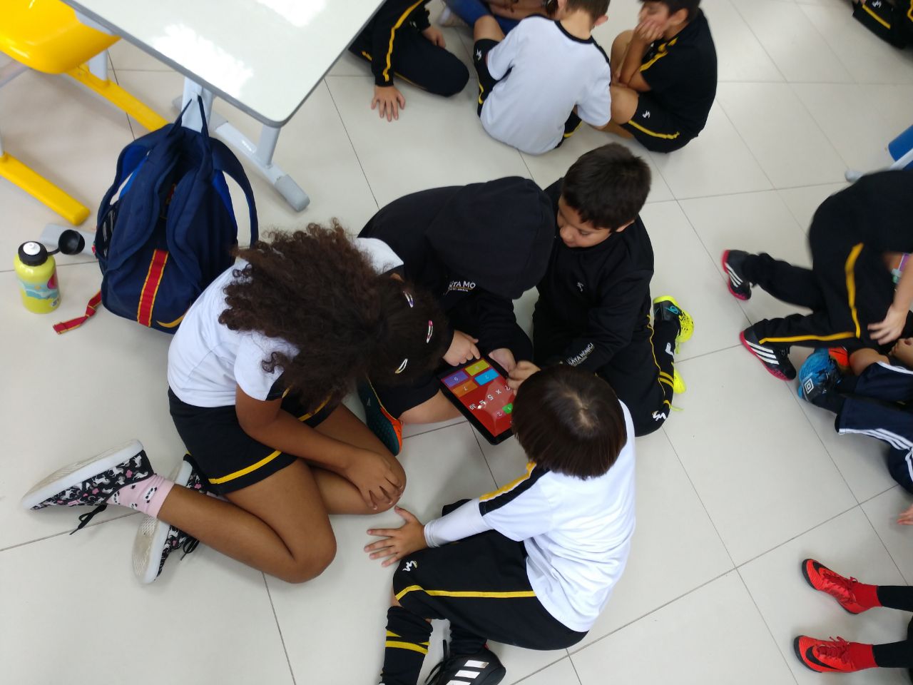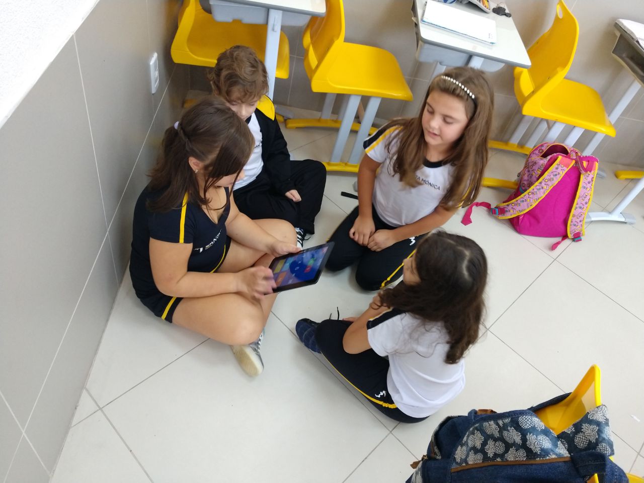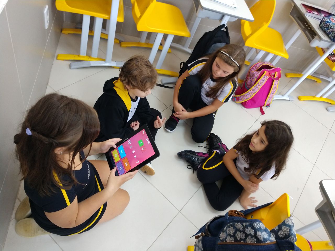 Divididos em grupos, os alunos de 3º ano do Ensino Fundamental utilizaram os tablets da escola para resolver questões matemáticas através de jogos lúdicos.
