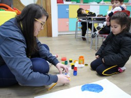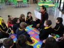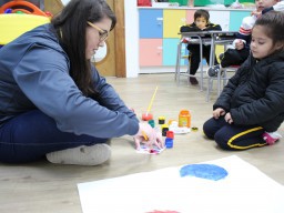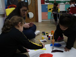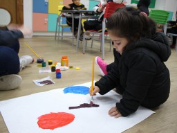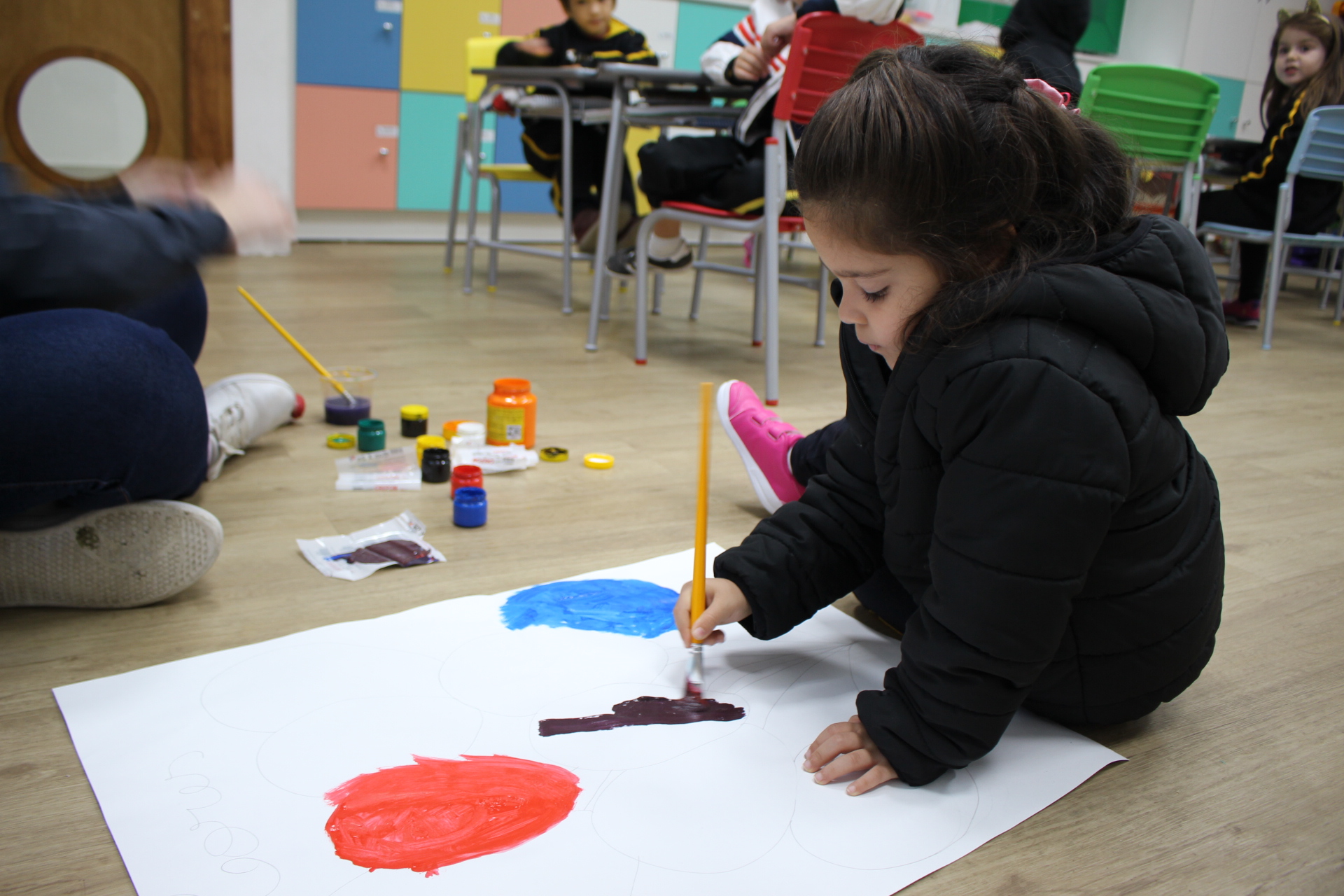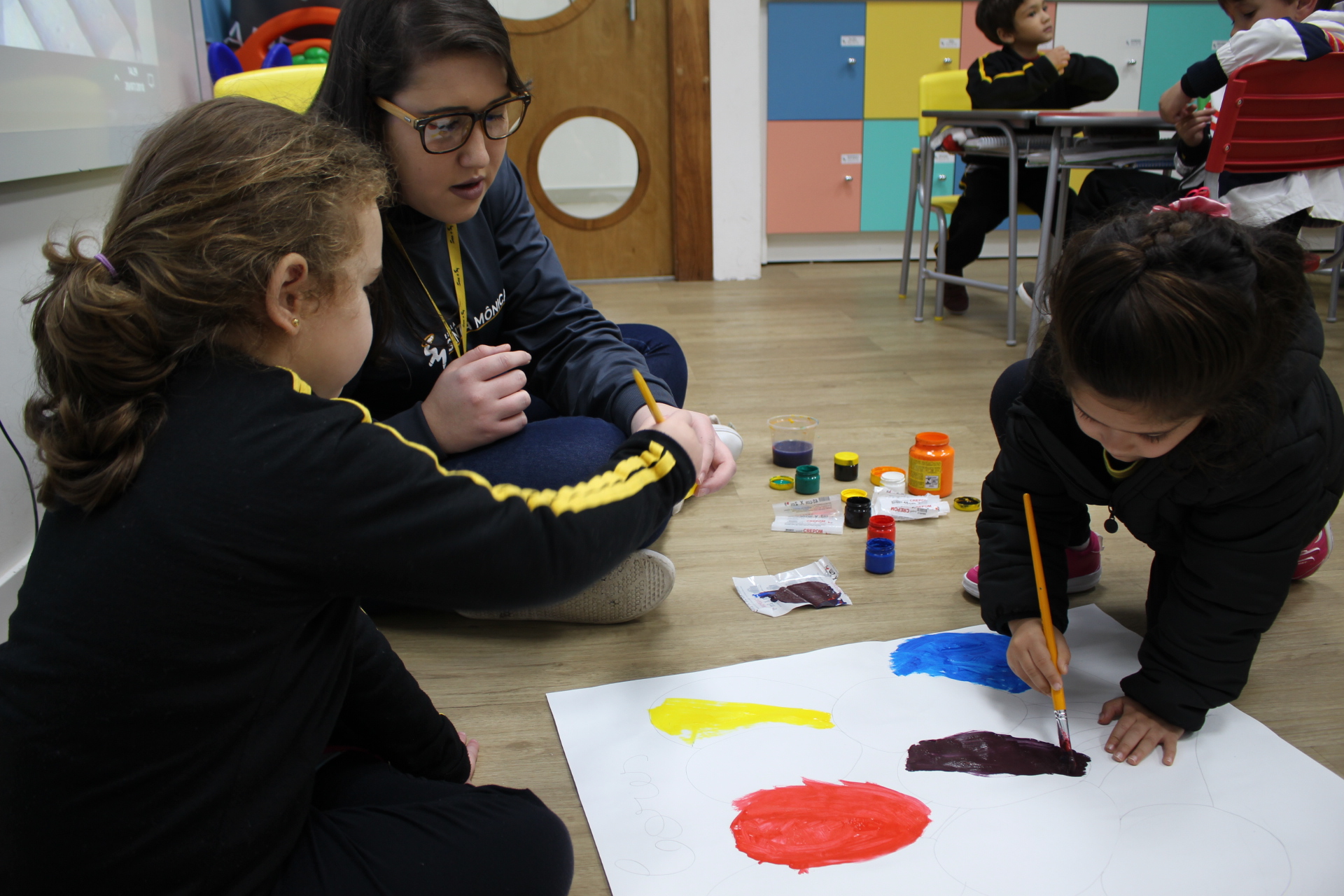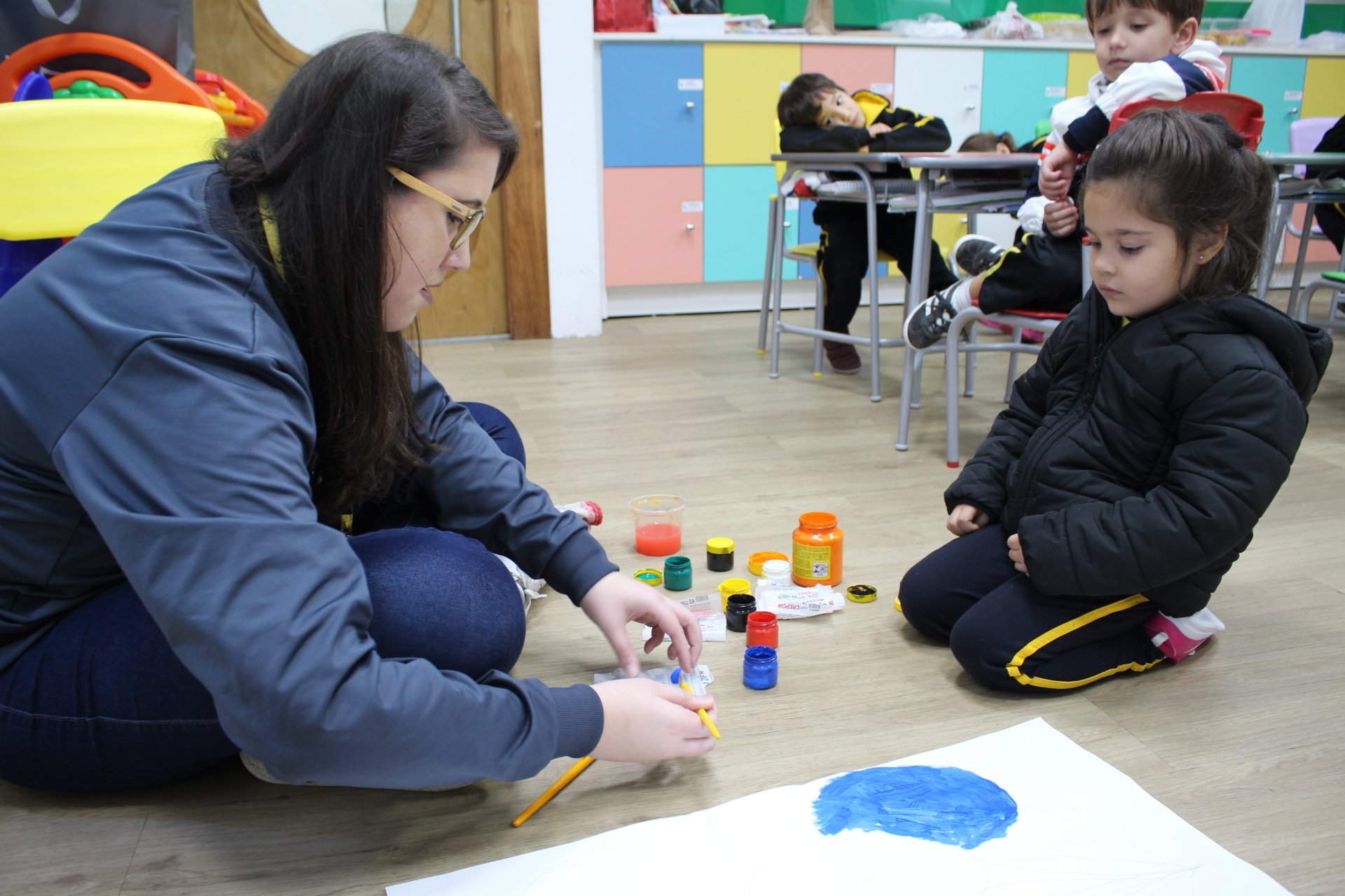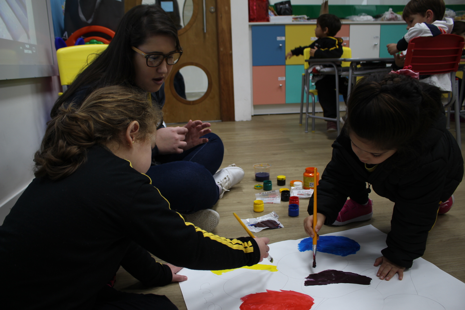 Trabalhando em grupo, os alunos do Jardim II fizeram um cartaz representando as cores primárias e secundárias e se divertiram colorindo balões.