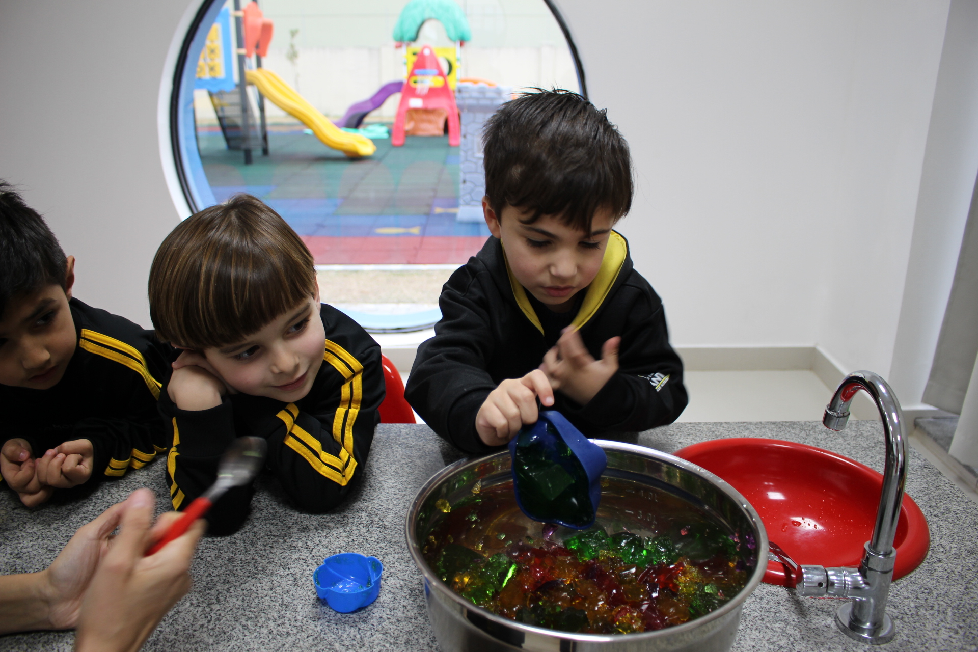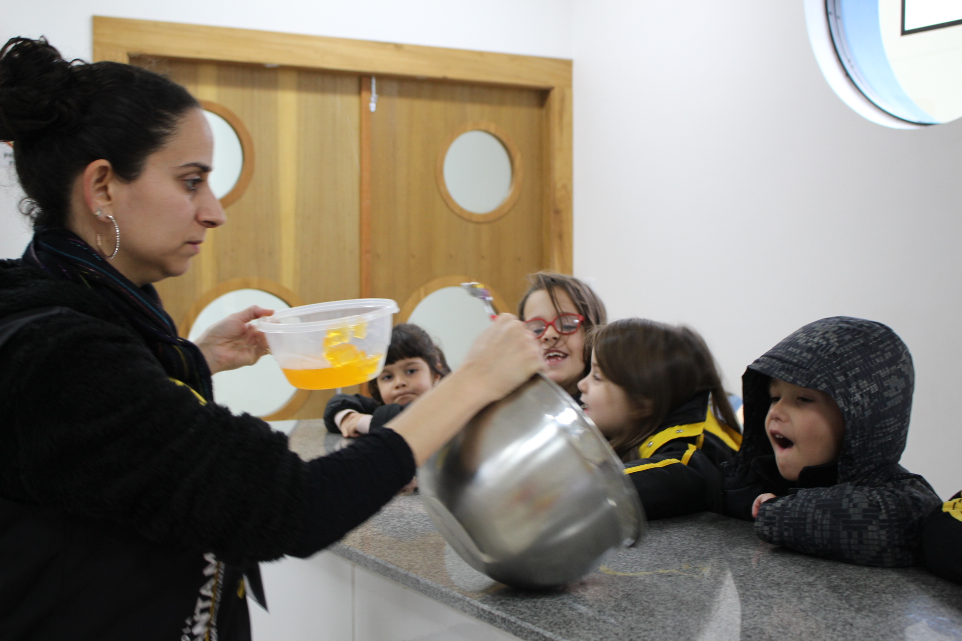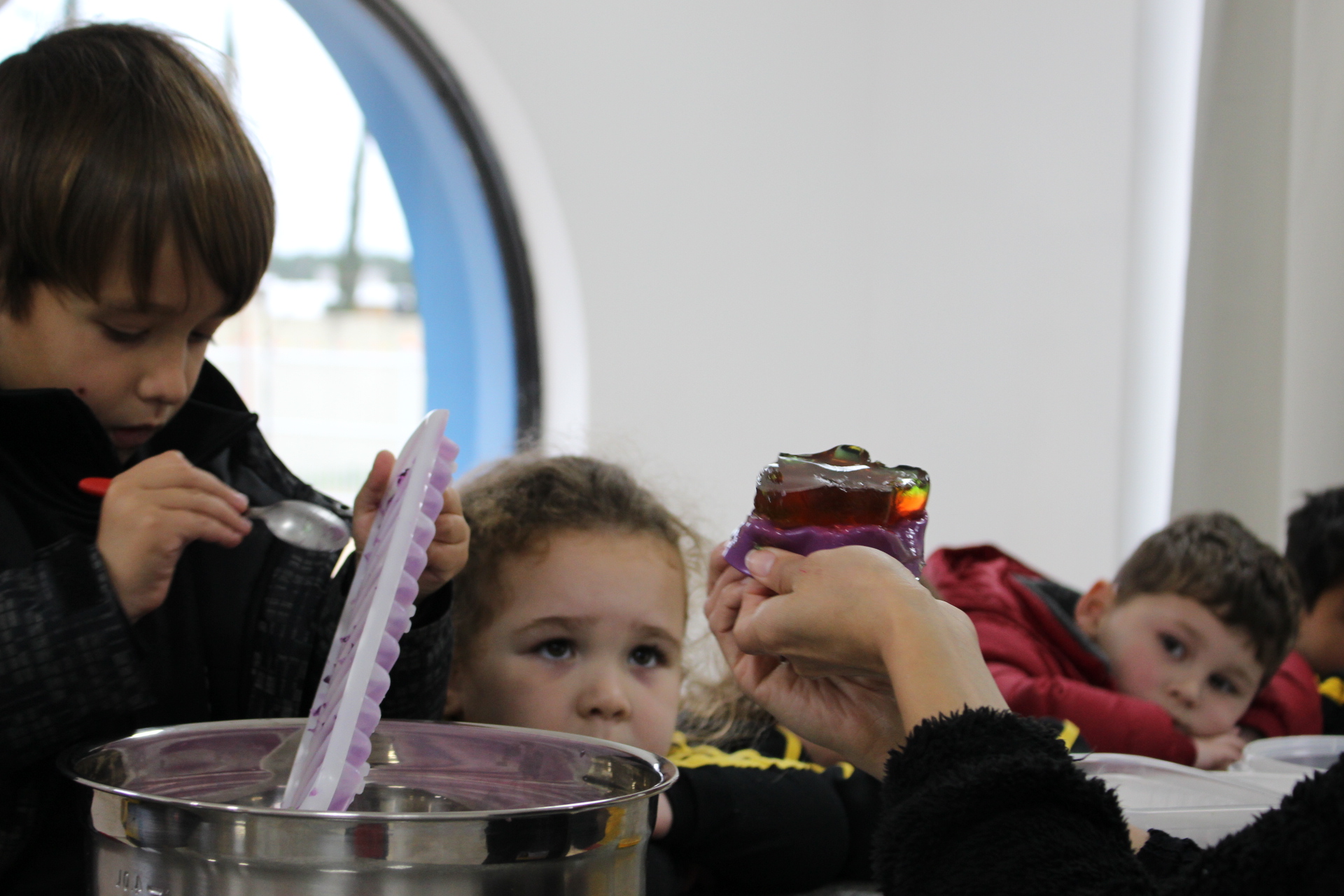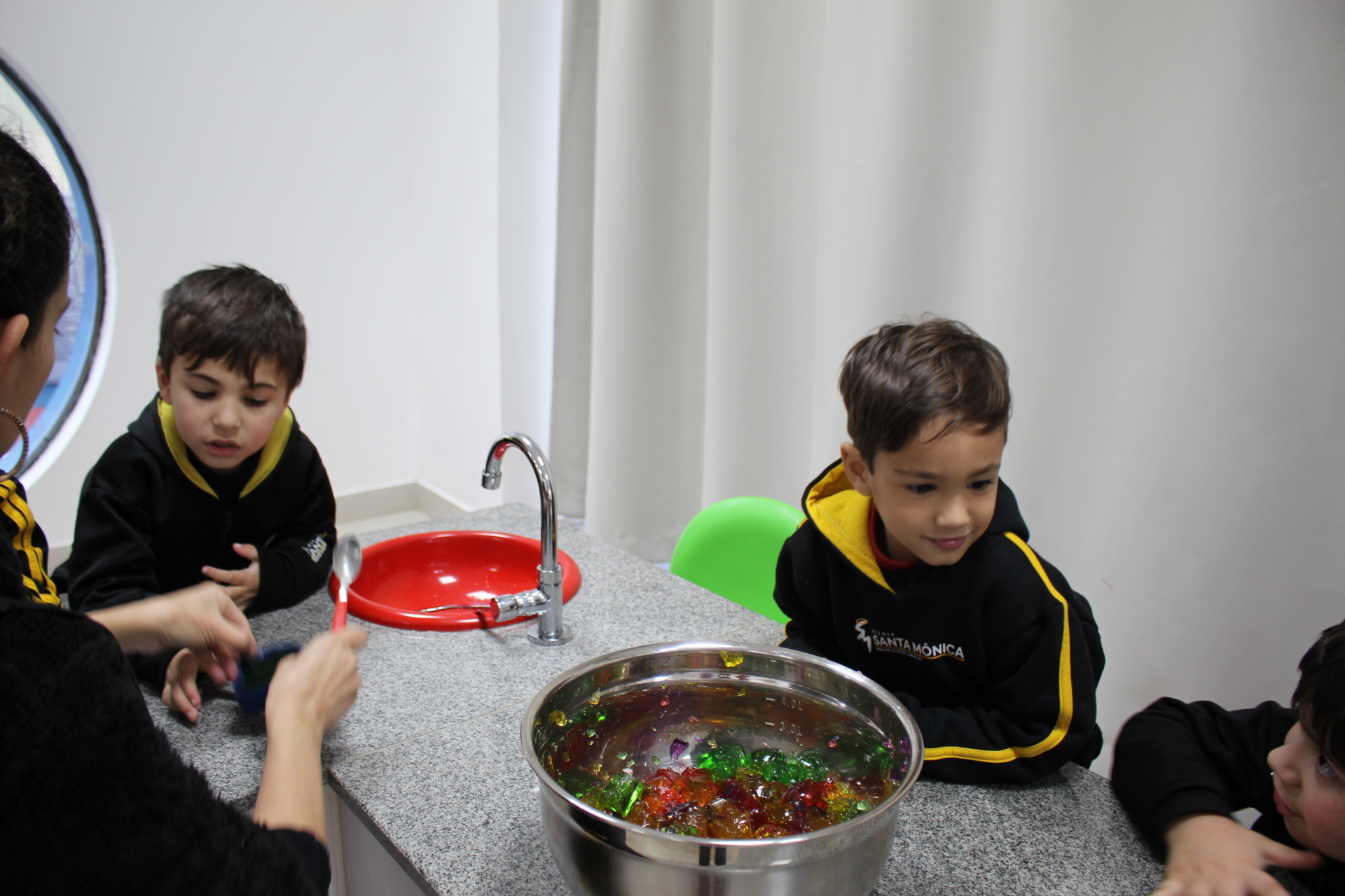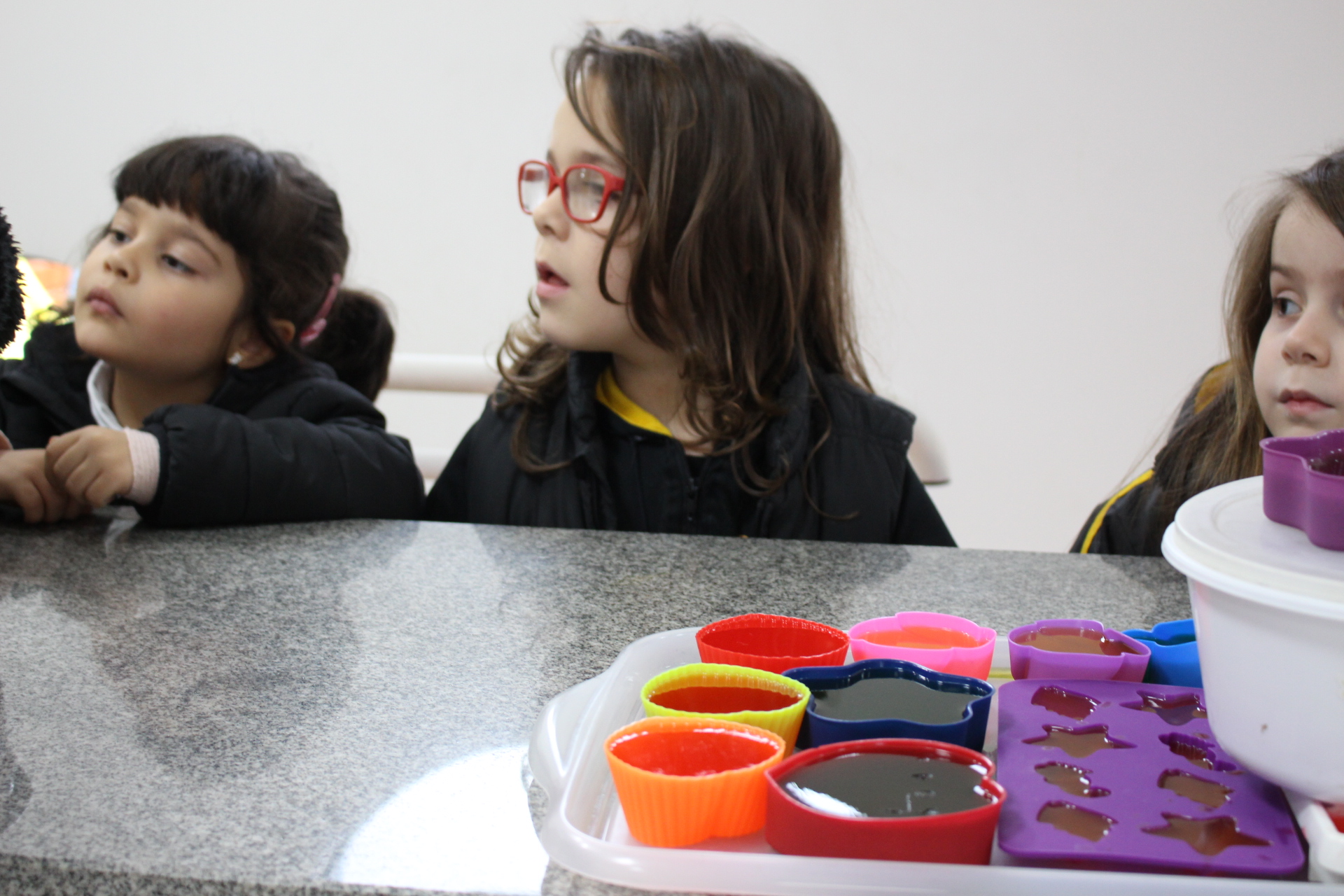 Os pequenos do Jardim II visitaram o espaço Gourmet Kids e prepararam uma deliciosa gelatina arco-íris para aprender mais sobre cores.