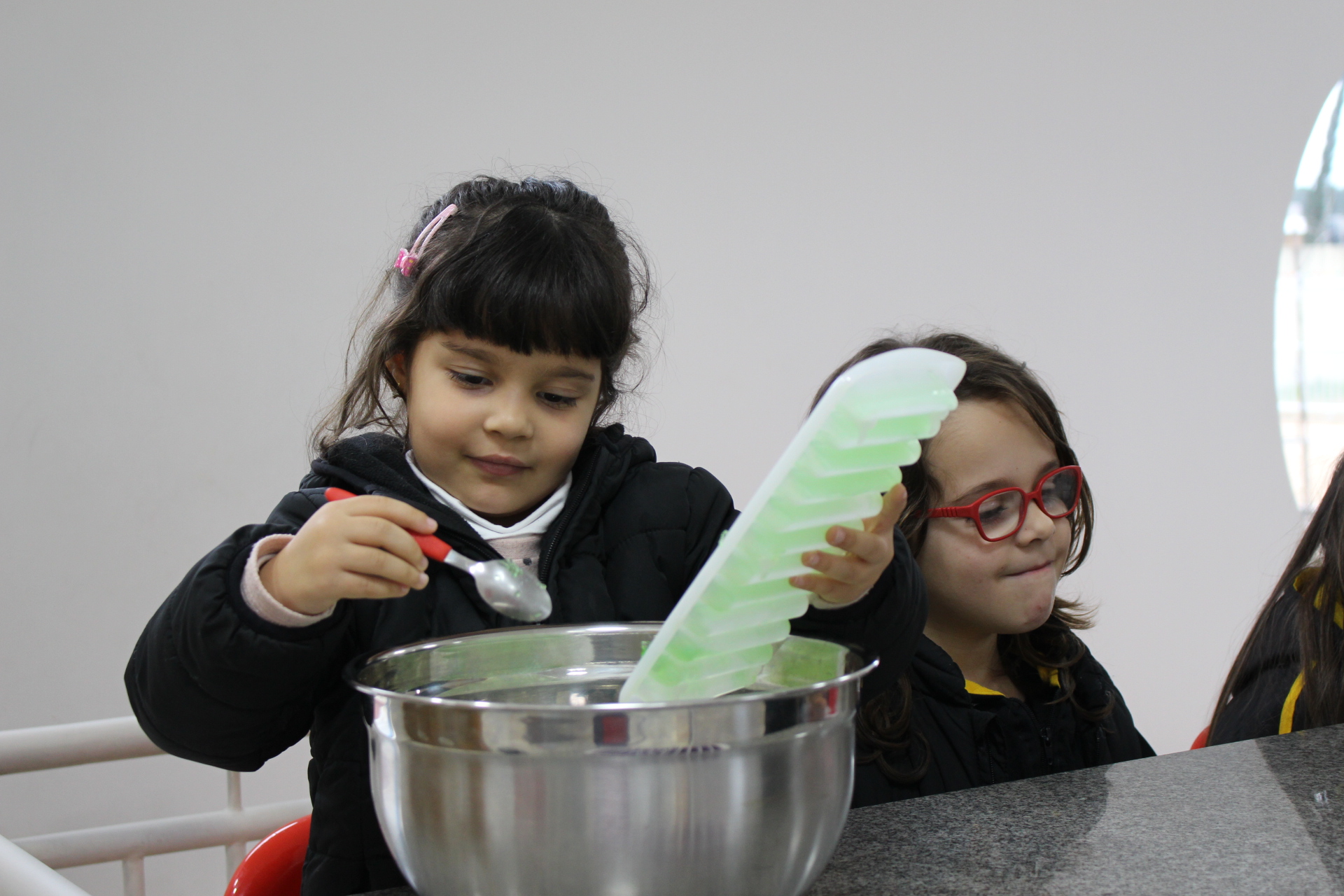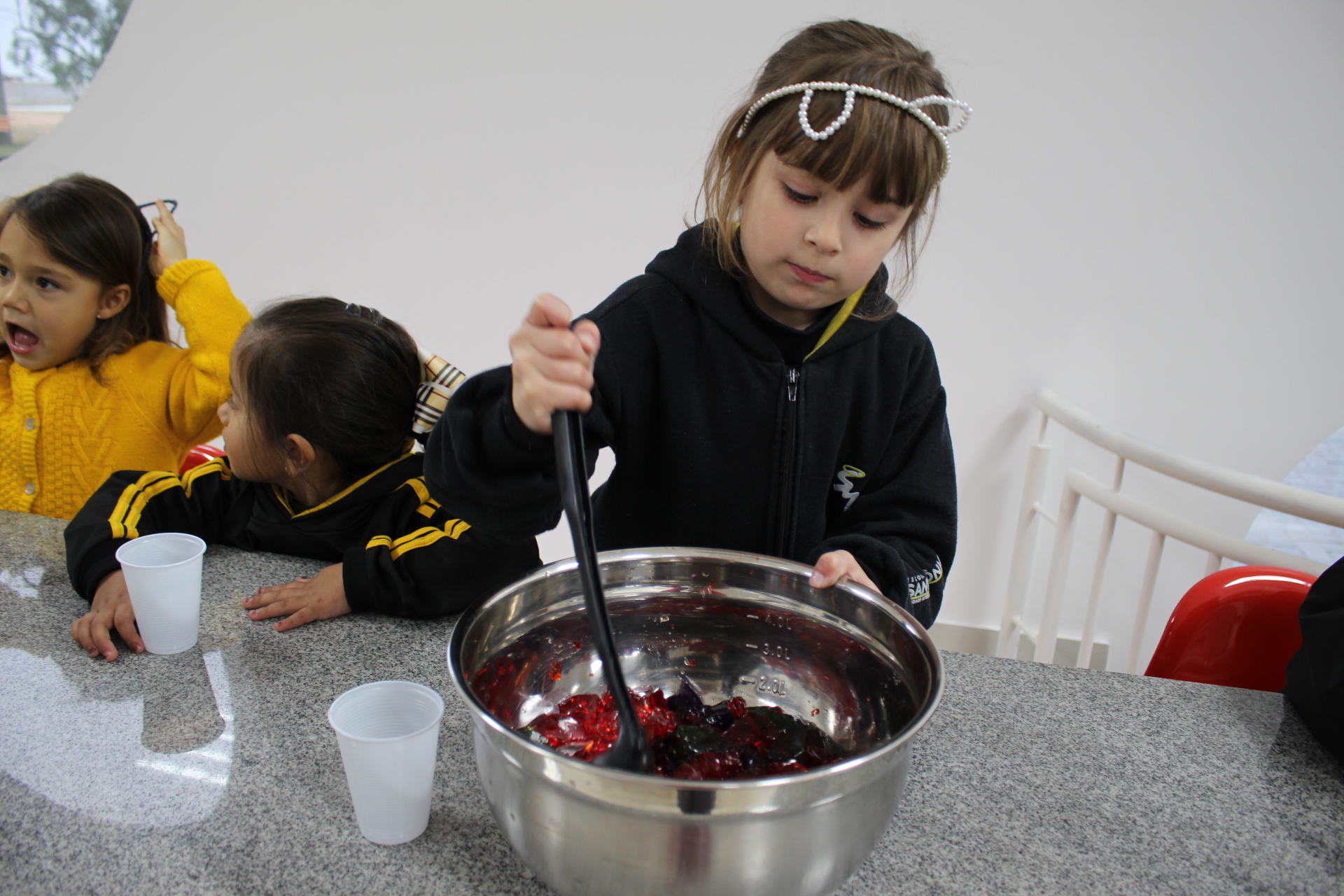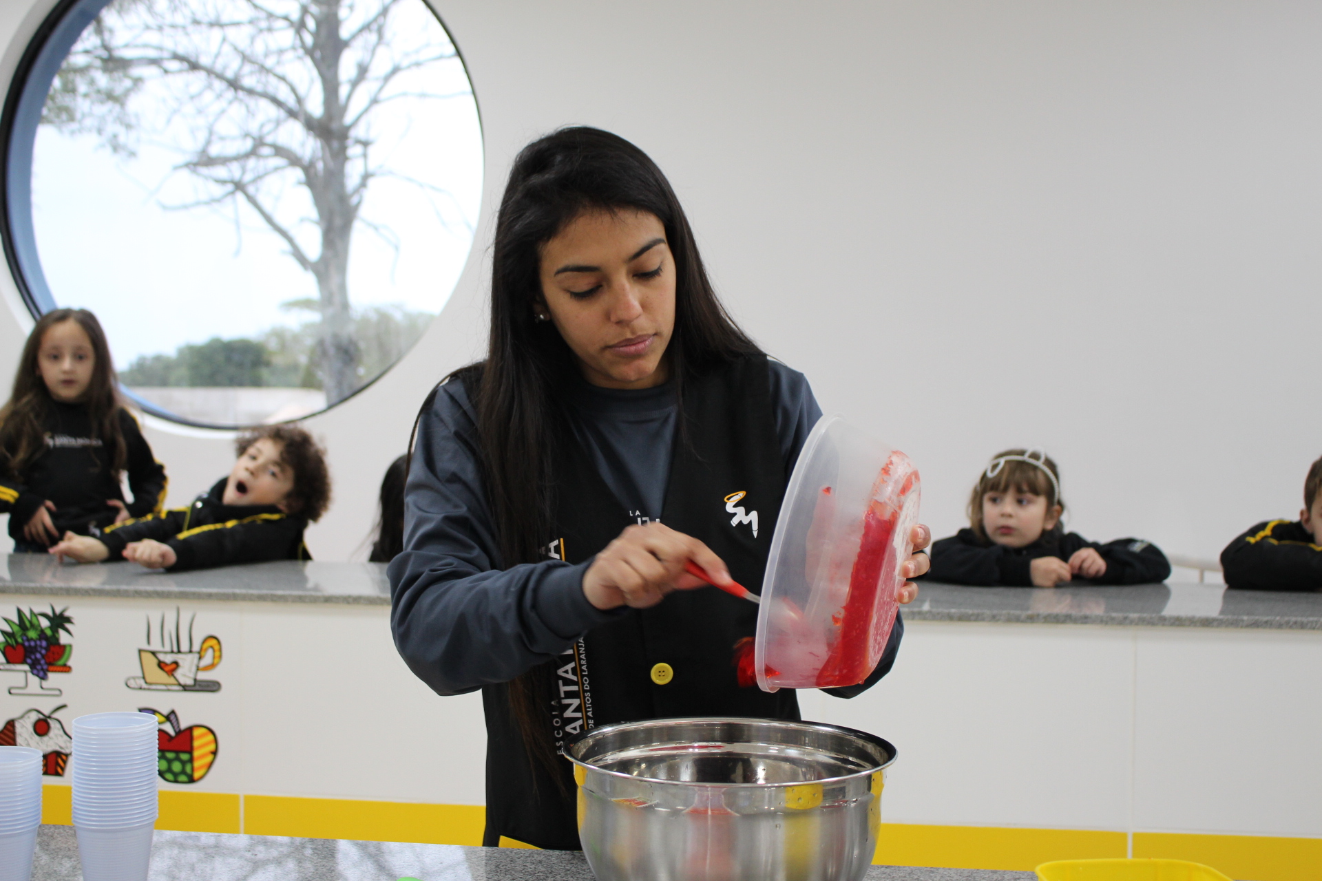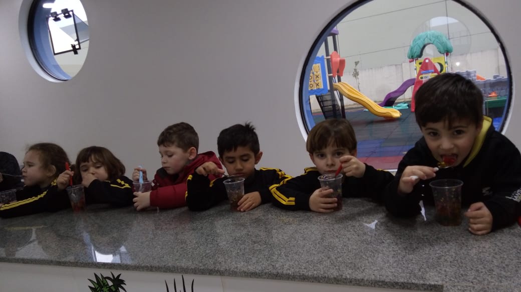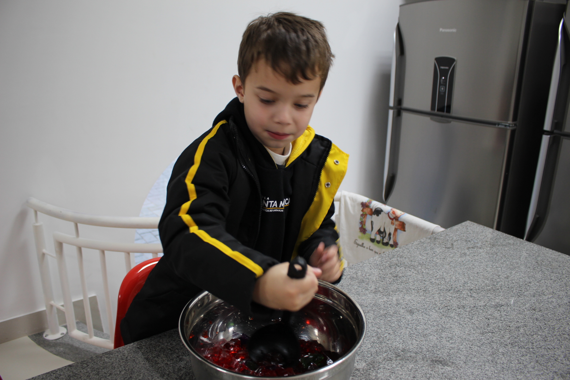 Os pequenos do Jardim II visitaram o espaço Gourmet Kids e prepararam uma deliciosa gelatina arco-íris para aprender mais sobre cores.