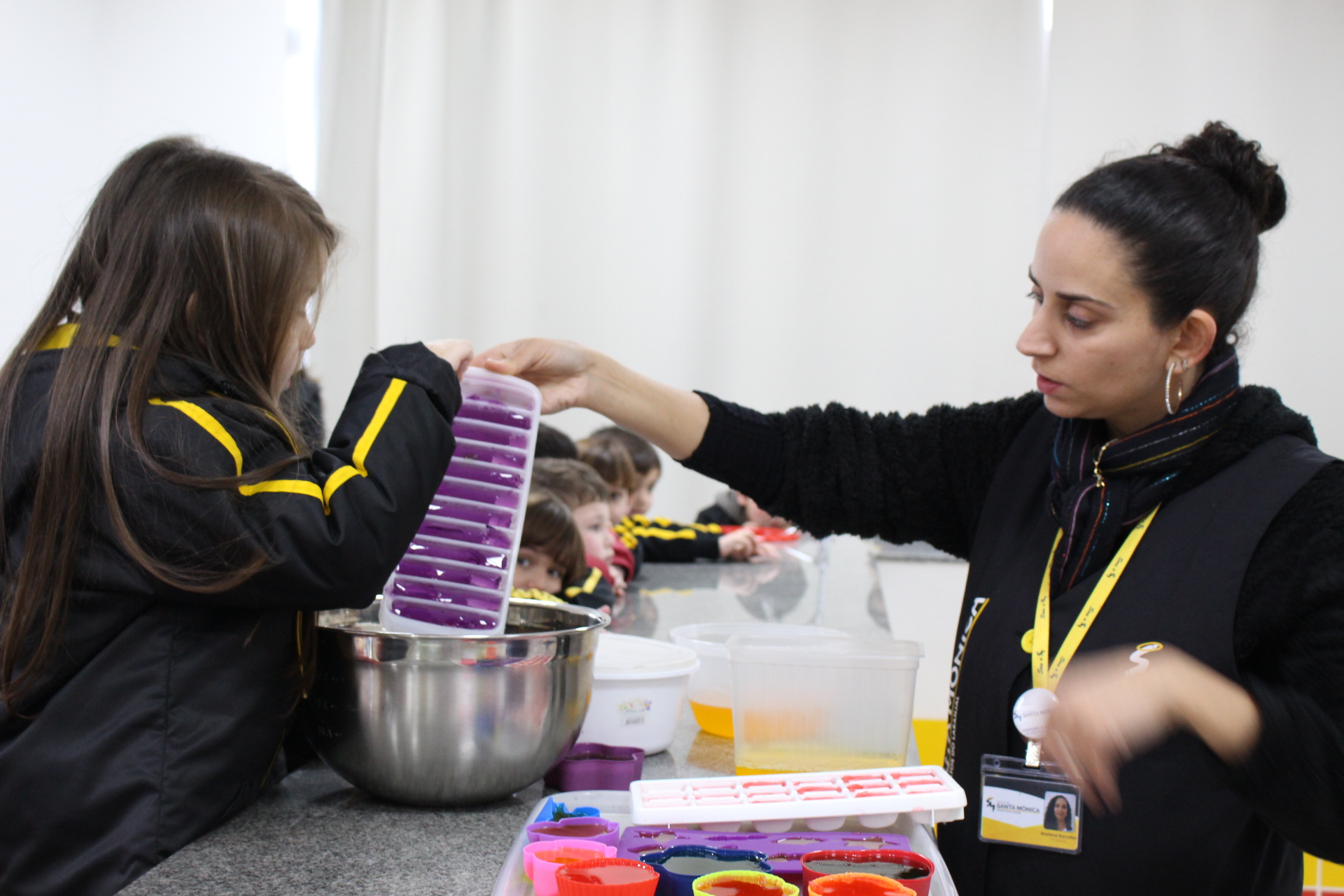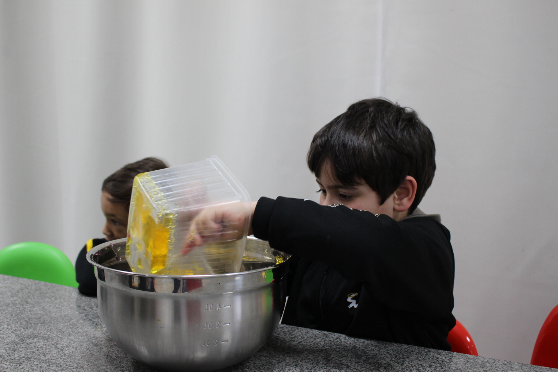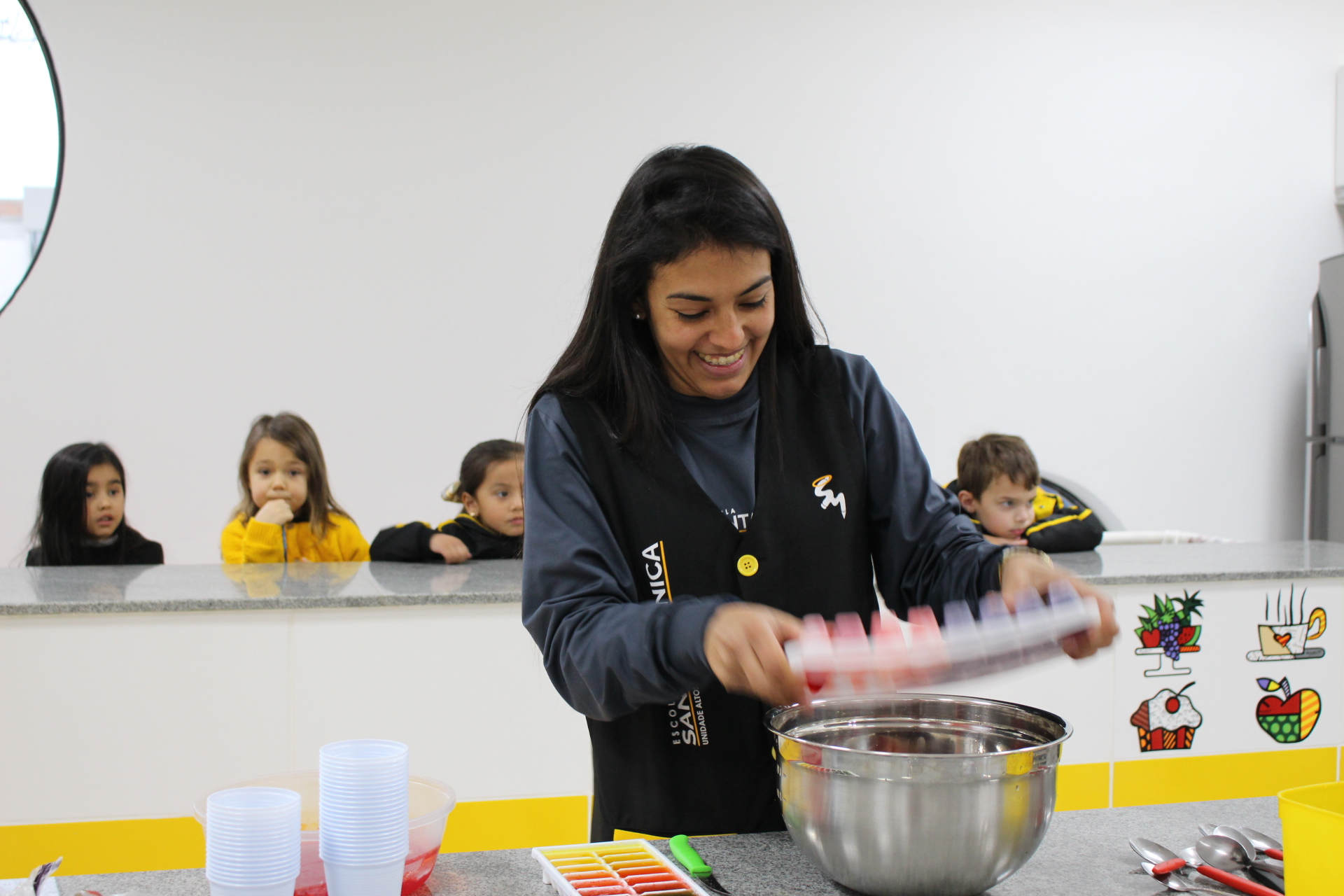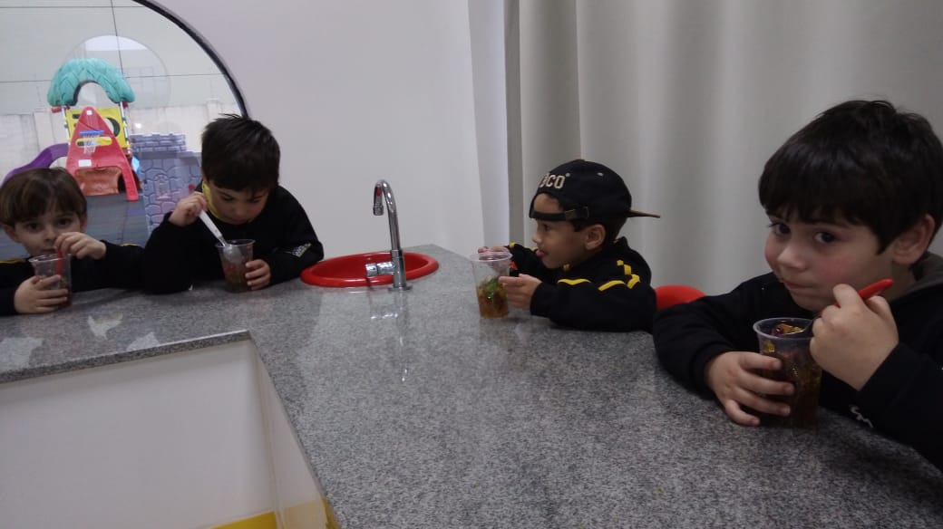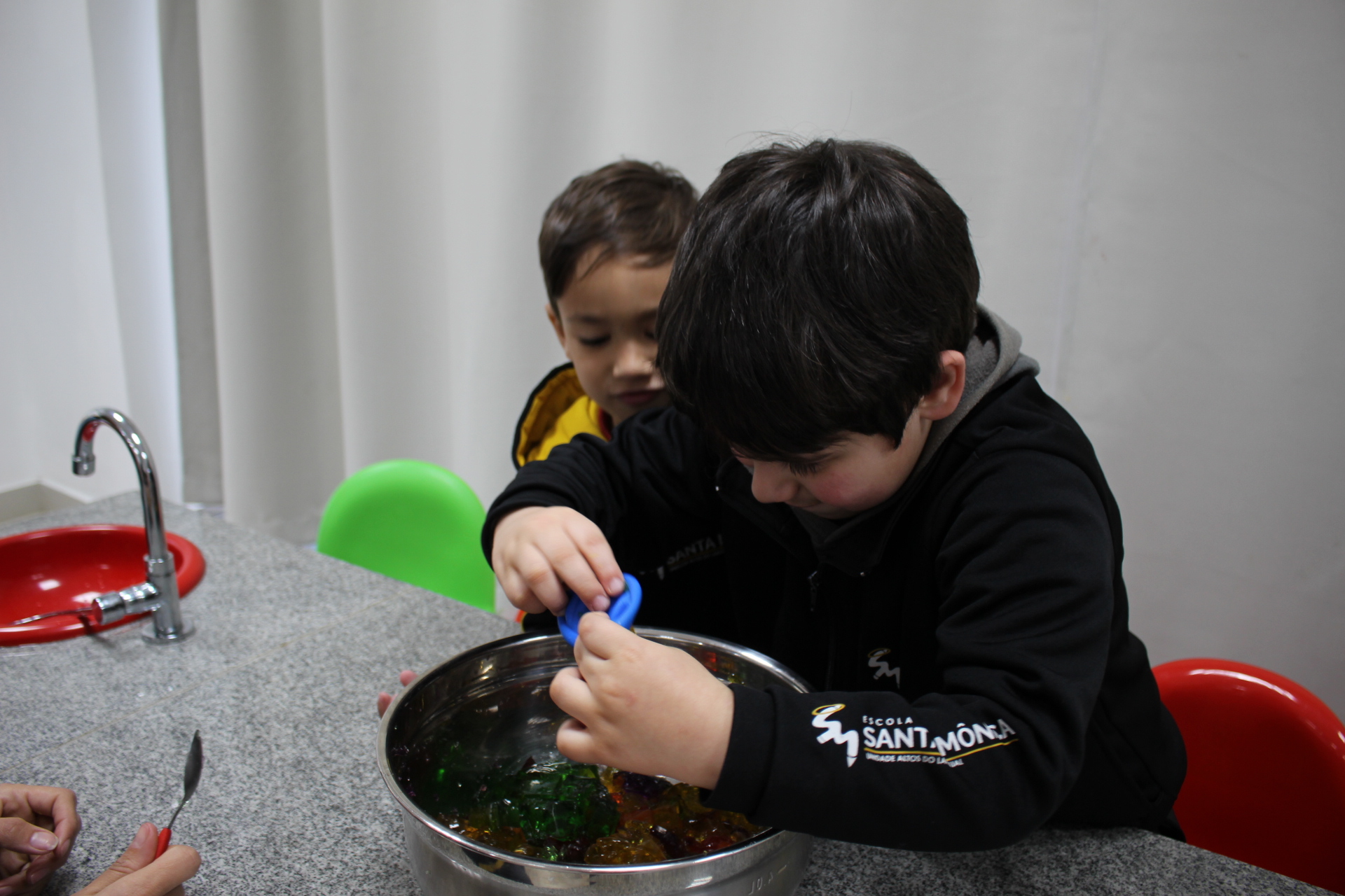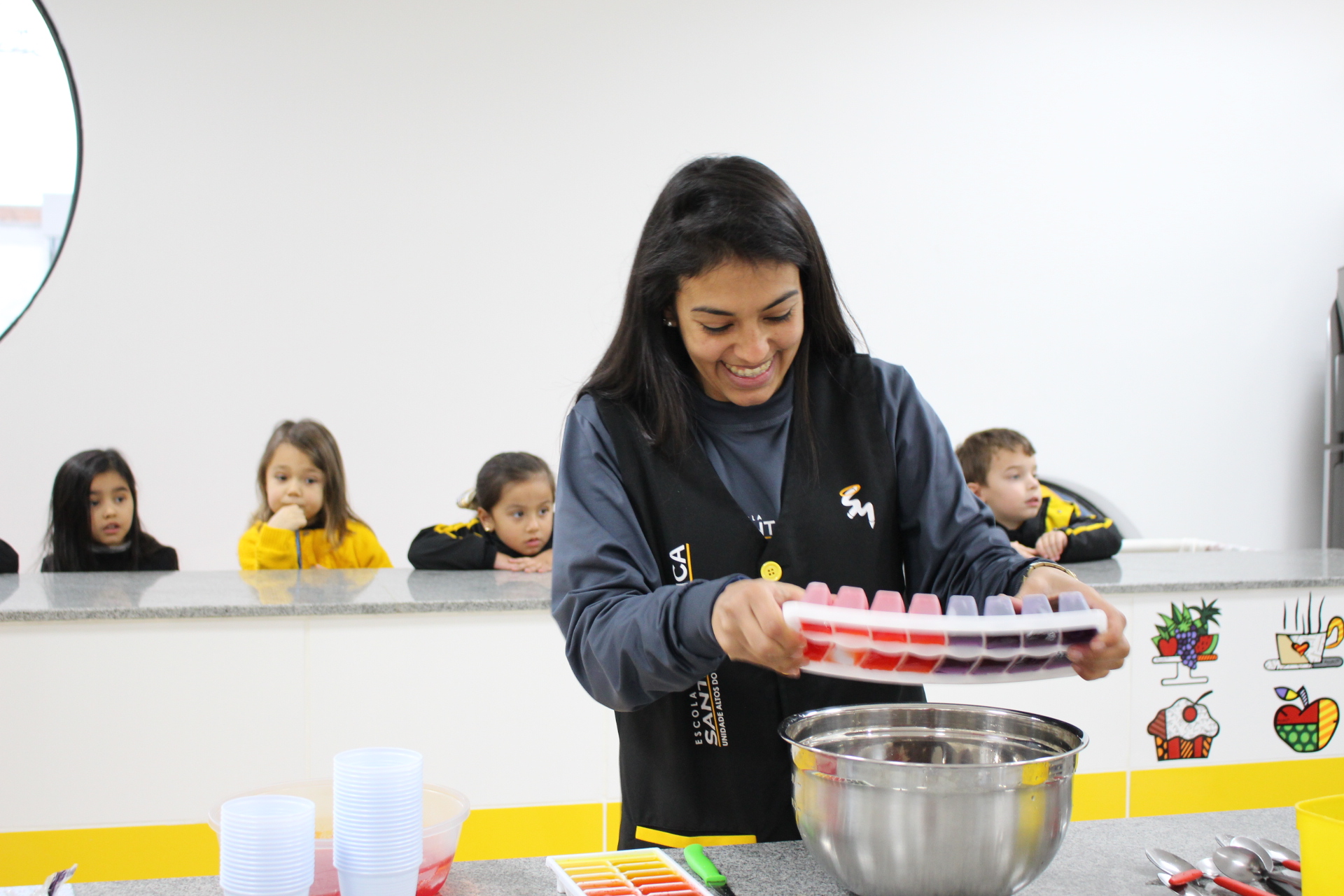 Os pequenos do Jardim II visitaram o espaço Gourmet Kids e prepararam uma deliciosa gelatina arco-íris para aprender mais sobre cores.