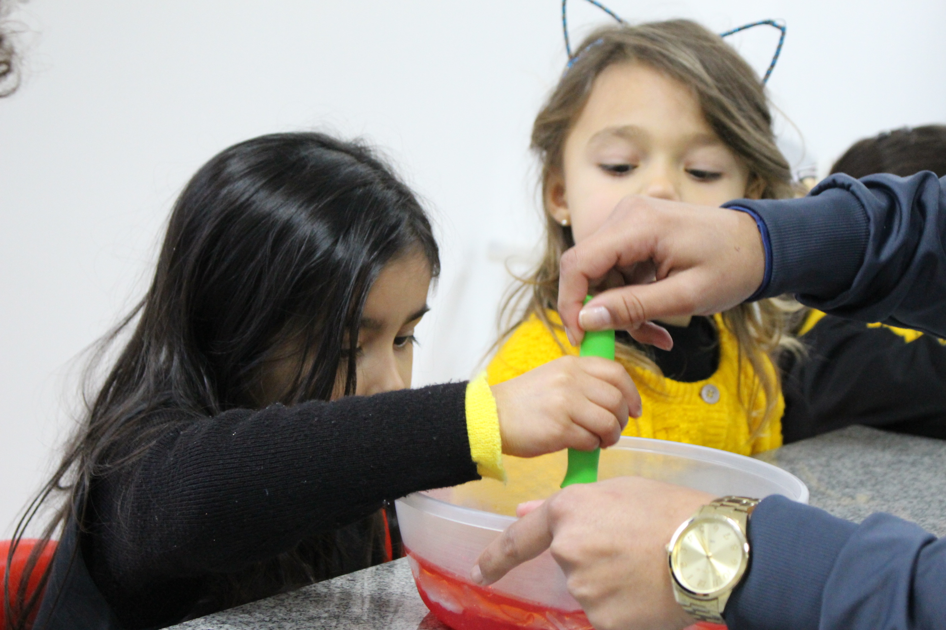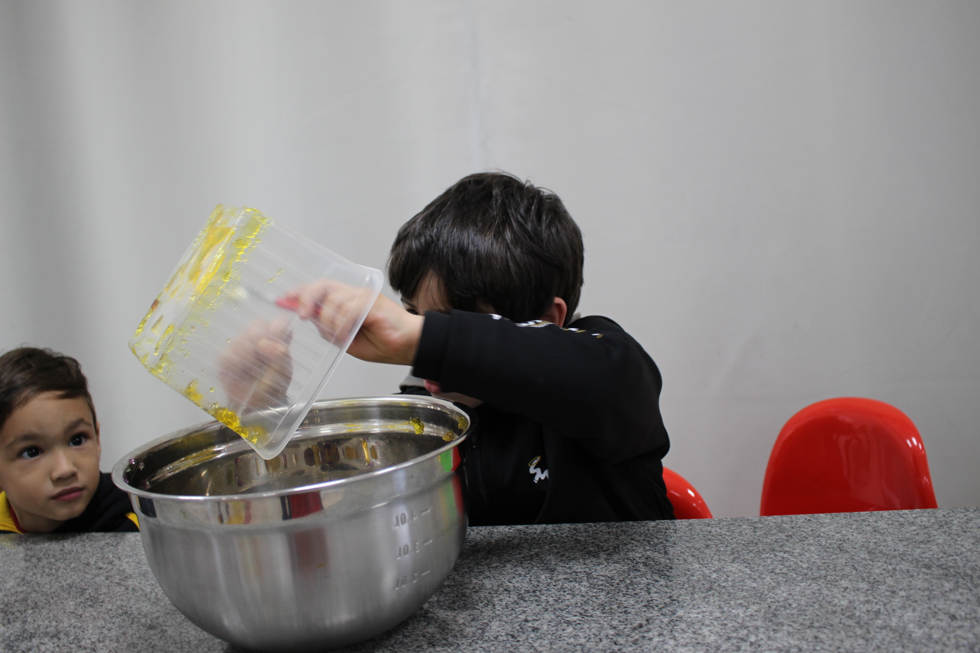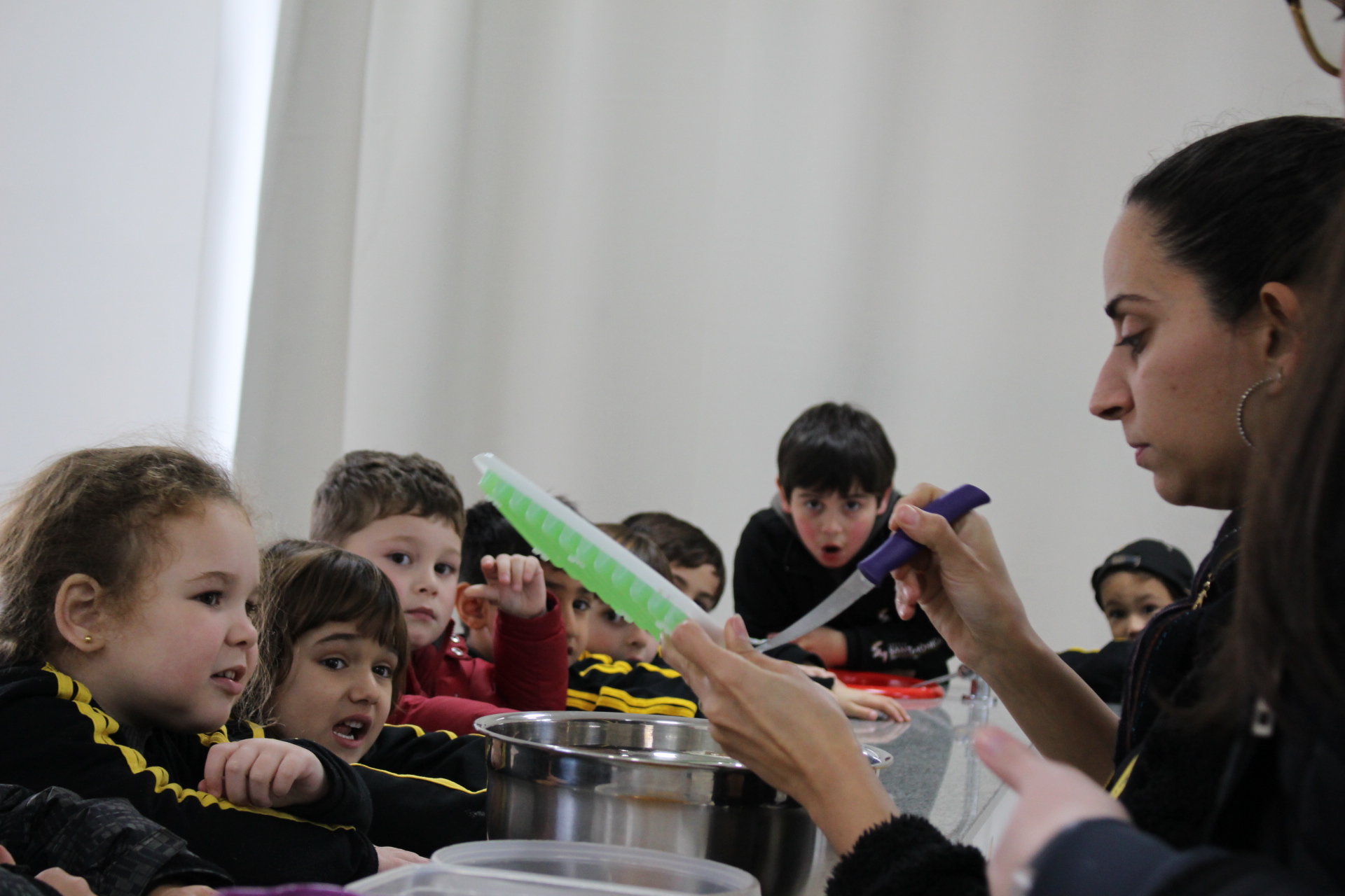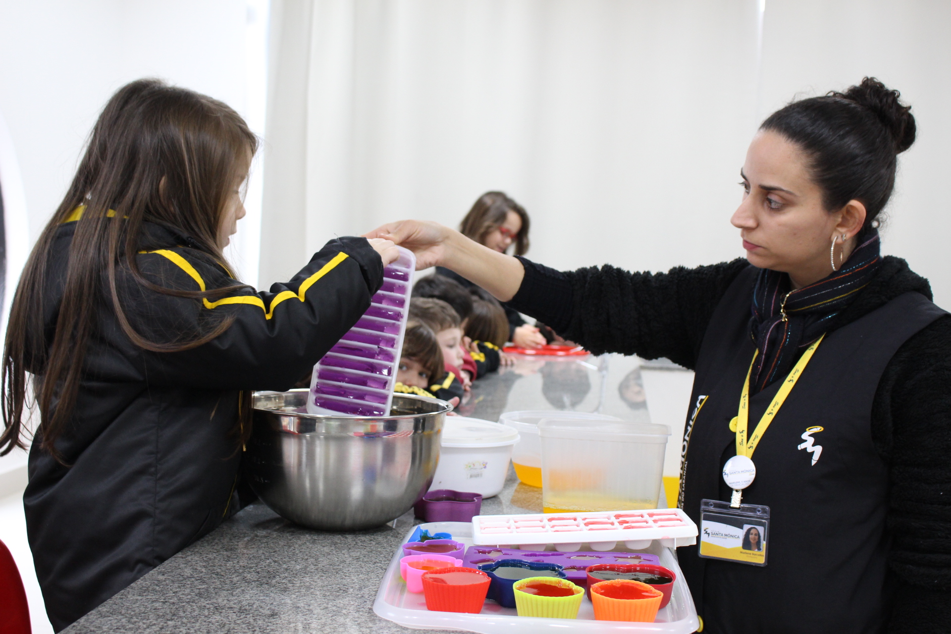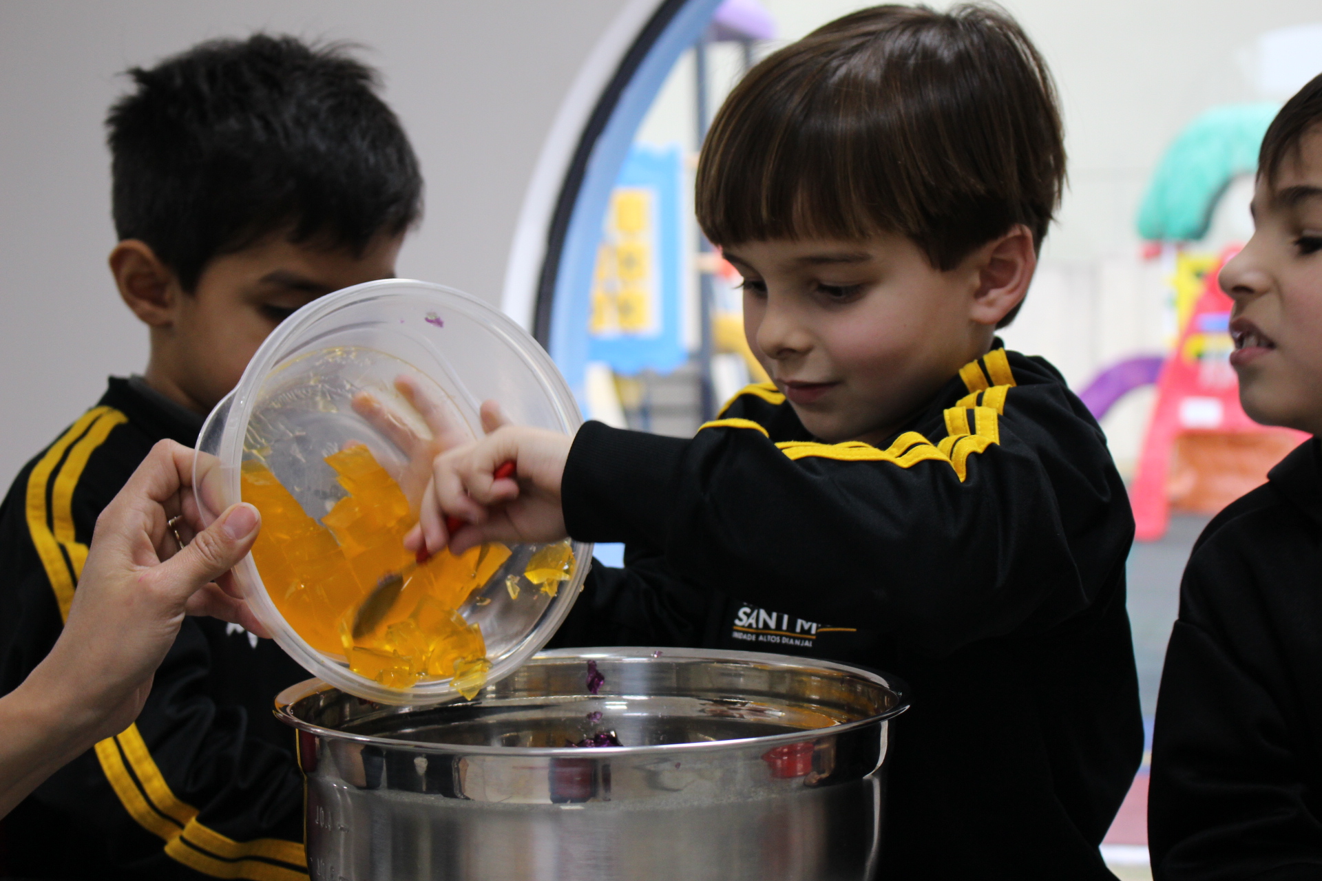 Os pequenos do Jardim II visitaram o espaço Gourmet Kids e prepararam uma deliciosa gelatina arco-íris para aprender mais sobre cores.