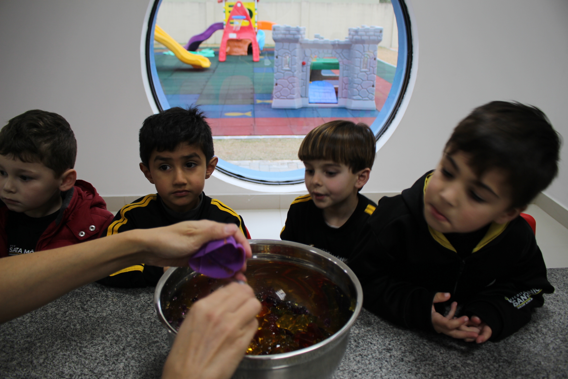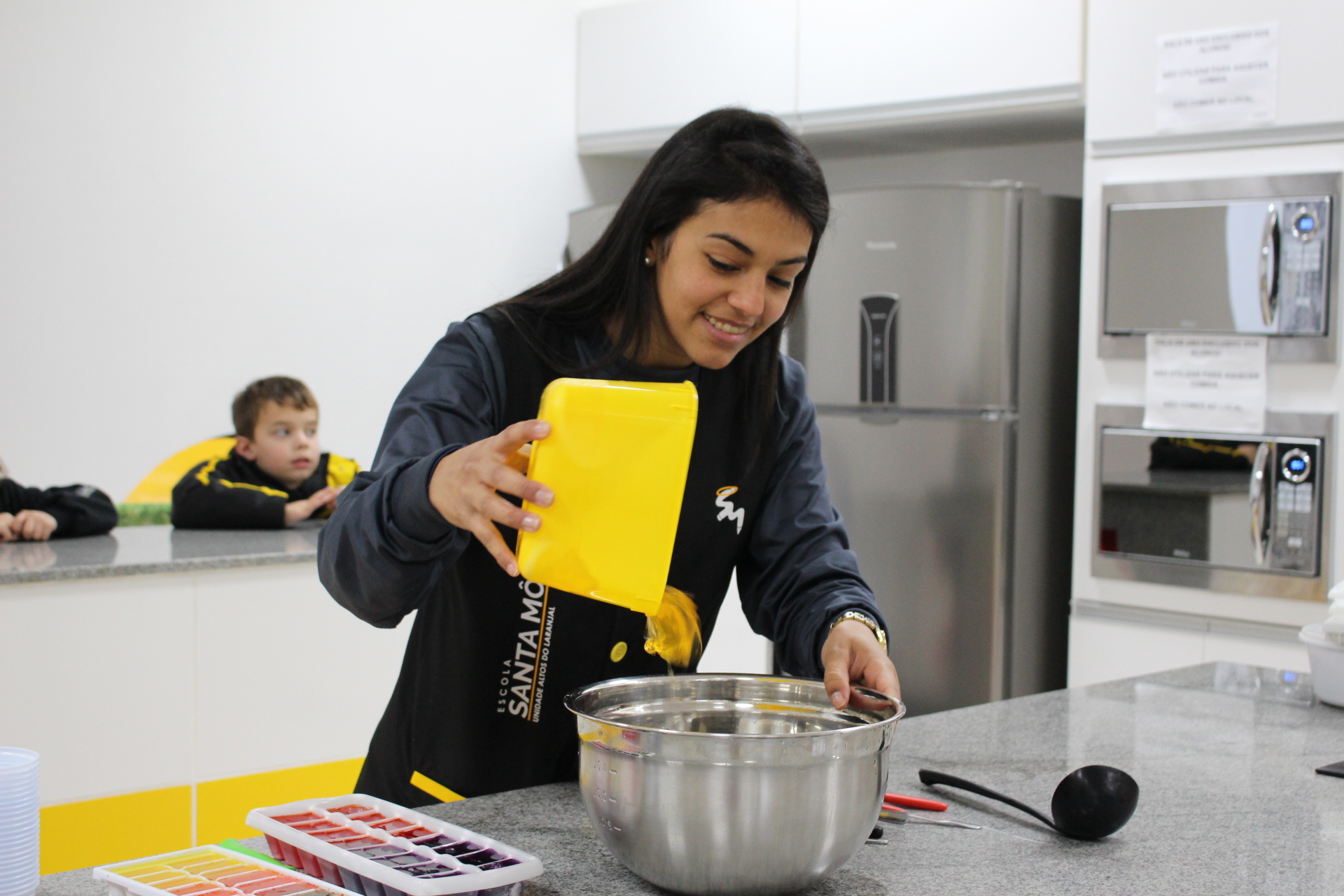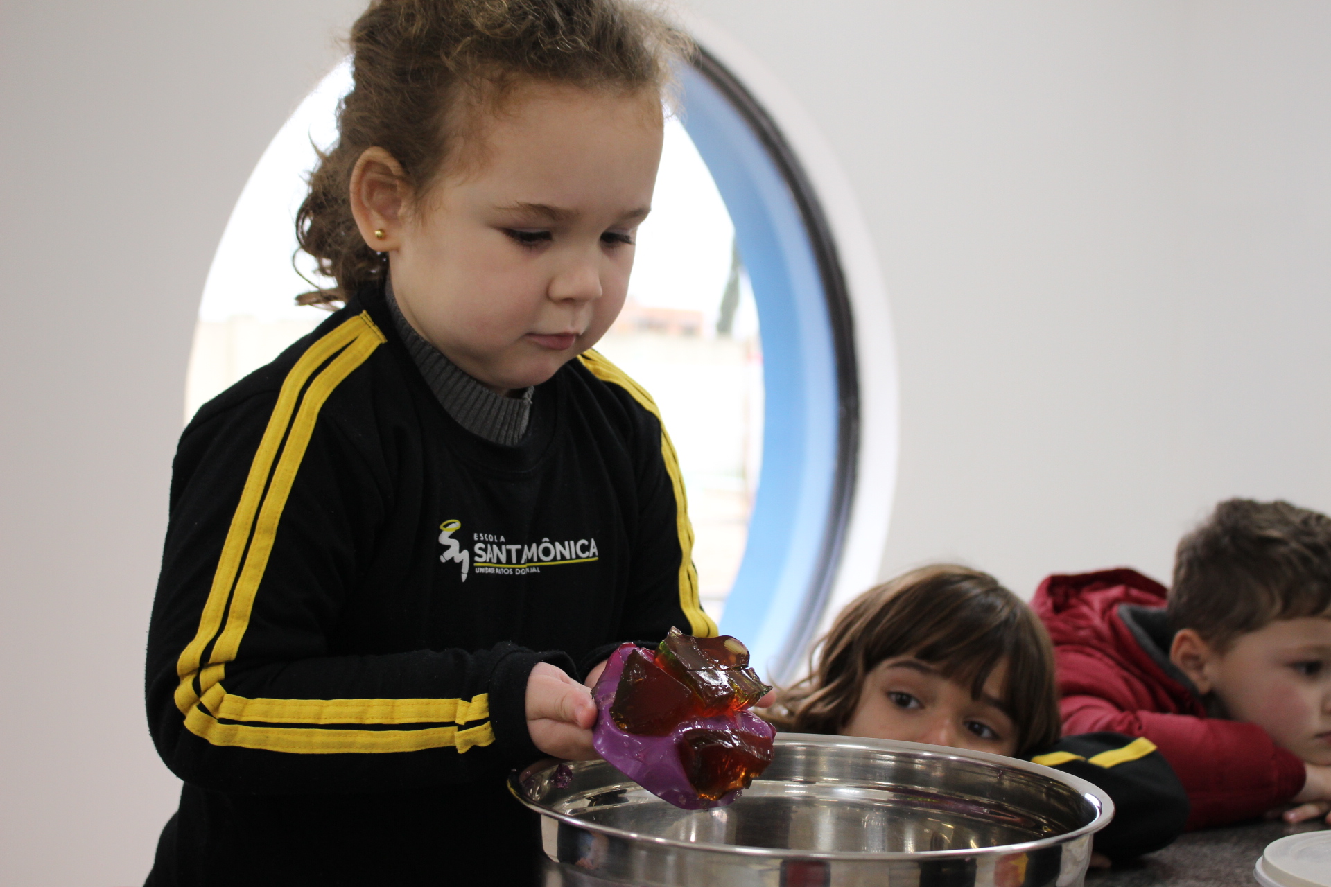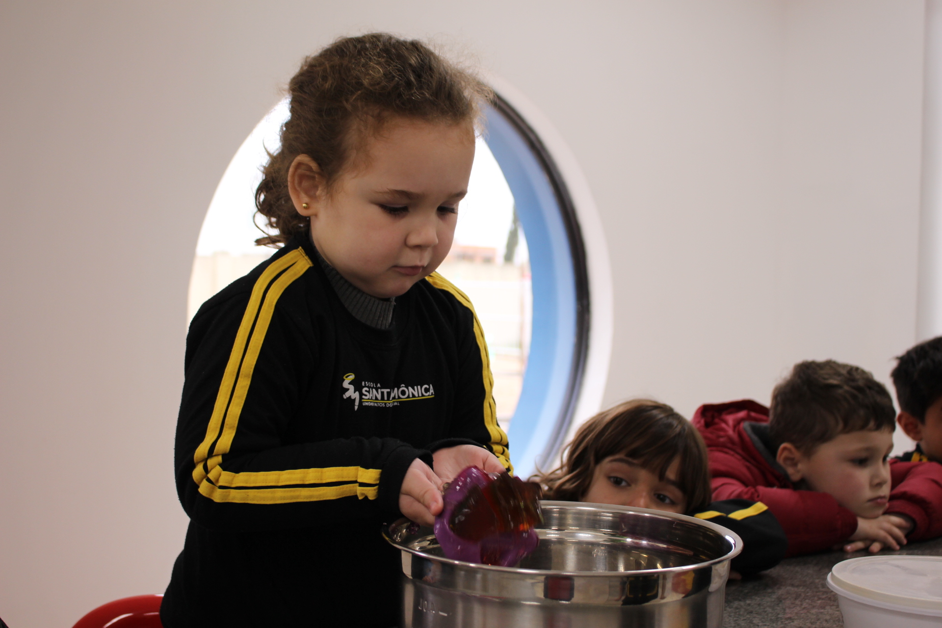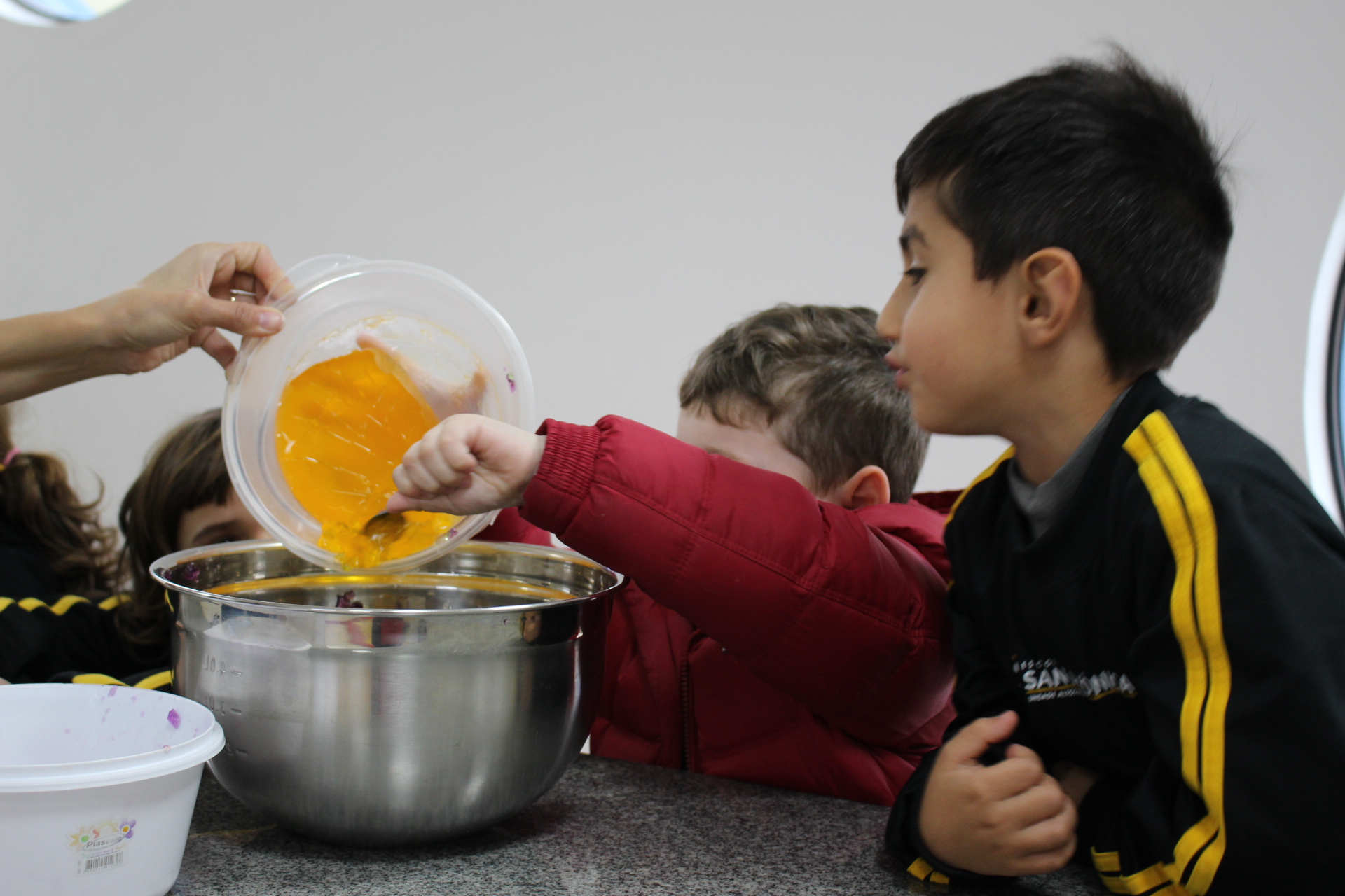 Os pequenos do Jardim II visitaram o espaço Gourmet Kids e prepararam uma deliciosa gelatina arco-íris para aprender mais sobre cores.