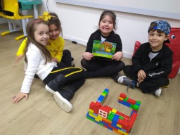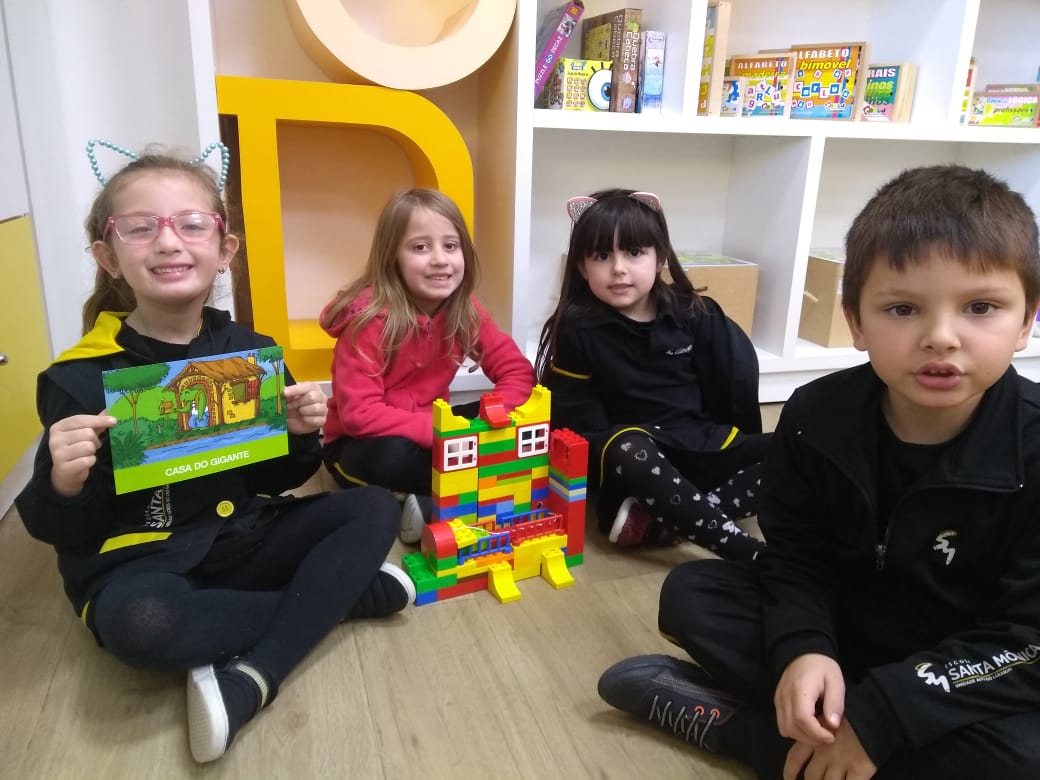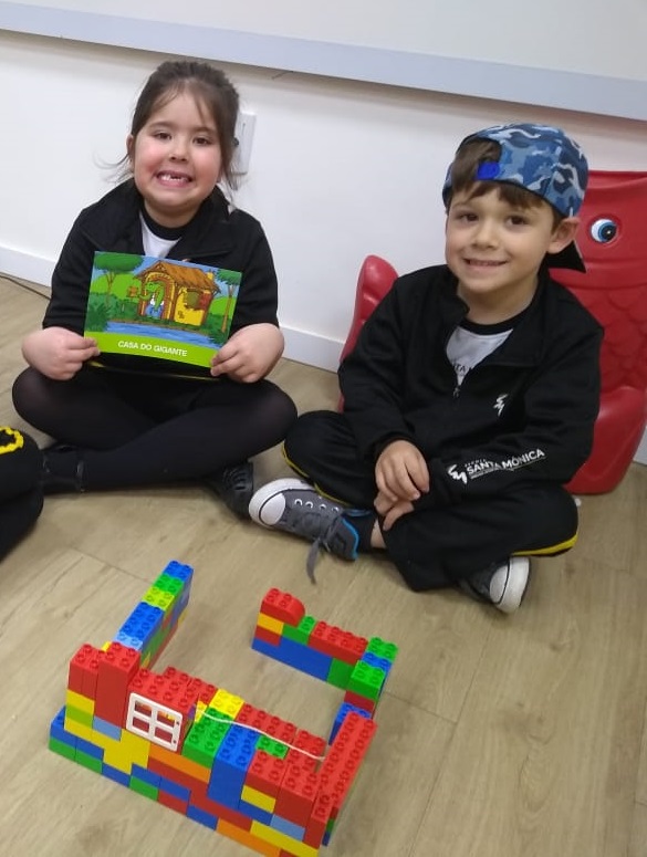 Os alunos do Jardim III utilizaram as peças Lego para produzir "A casa do gigante" e observaram as diferenças de tamanho entre elas exercitando as noções de grandeza.