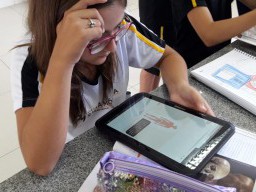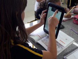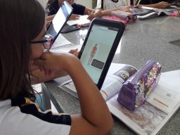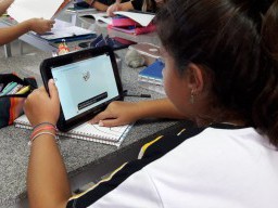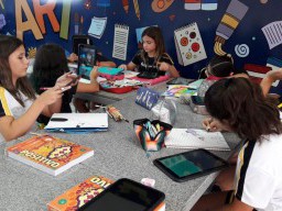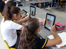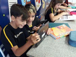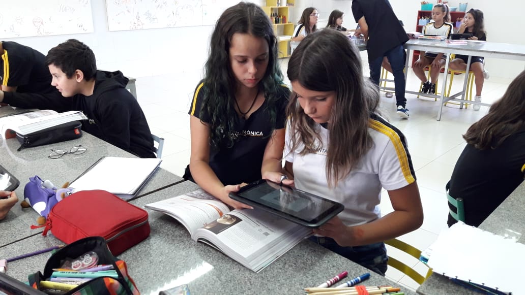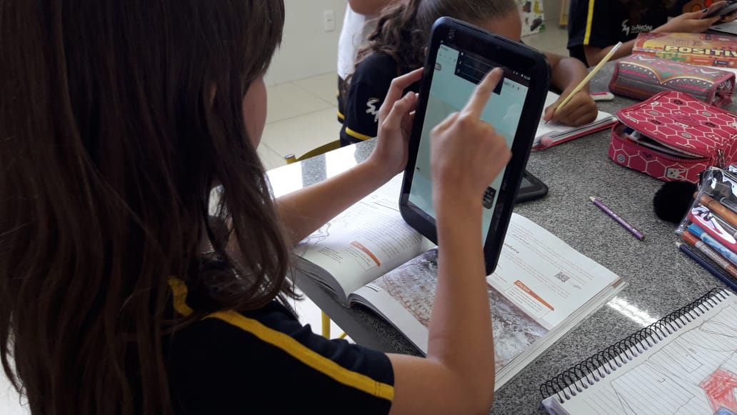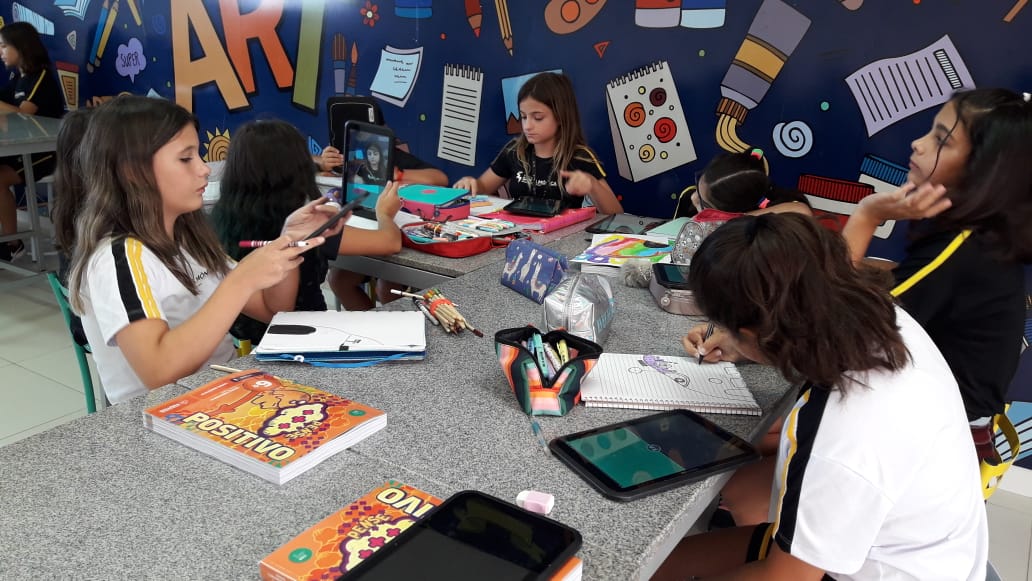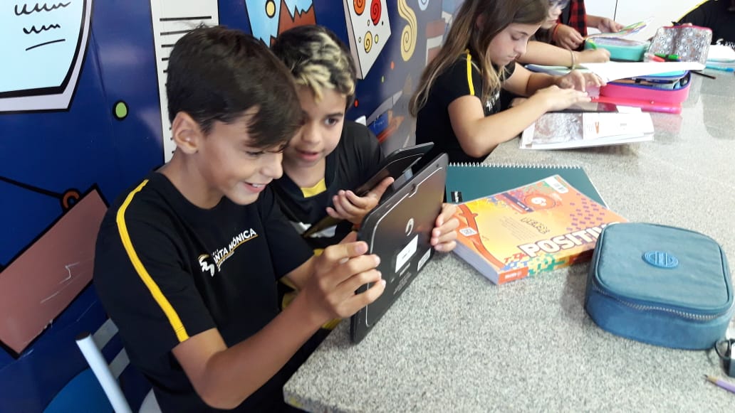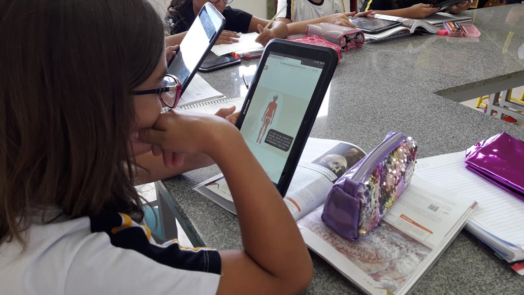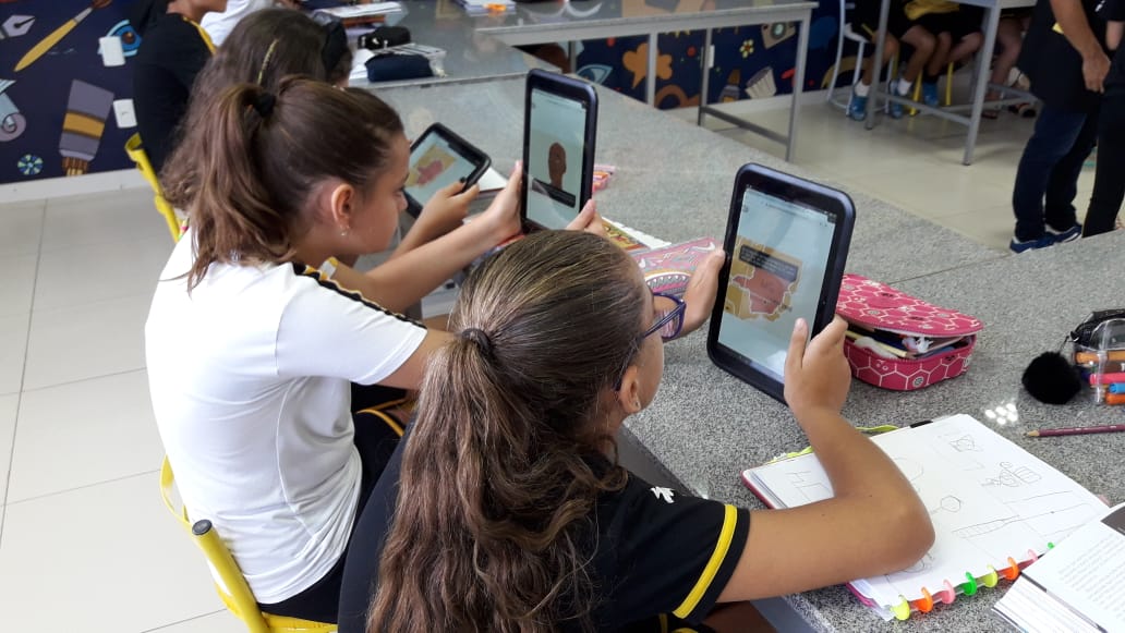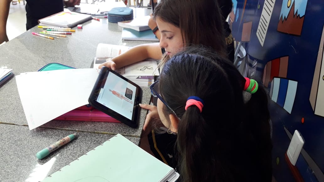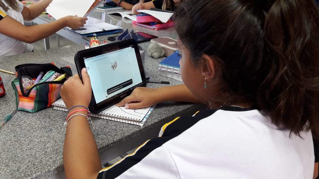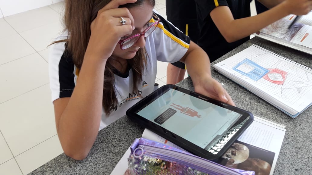Em nosso Espaço da Criatividade, os alunos de 6º ano utilizaram os tablets para visualizar o conteúdo de Arte através da Realidade Aumentada. Depois da introdução referente ao conteúdo sobre mitos, rituais e gravuras, visualizaram o fóssil pré-histórico de Luzia, o fóssil humano mais antigo encontrado na América do Sul.