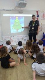 Durante a aula de Inglês, os alunos do Maternal trabalharam a coordenação motorna, enfeitando a árvore de natal...