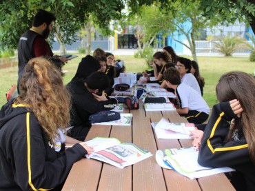 Os alunos de 7º ano visitaram a área verde com o professor Juan, de História, para conversar sobre o período...