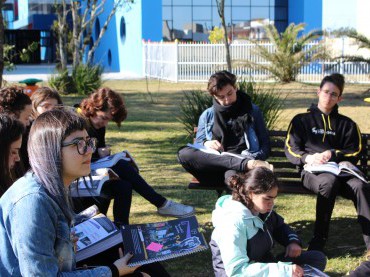 Durante a aula de Inglês, os alunos de 1º ano do Ensino Médio visitaram a área verde e aproveitaram o...
