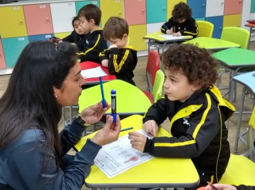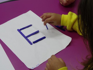 Os alunos de Jardim I estão conhecendo as letrinhas iniciais do nome de uma forma bem divertida. Os pequenos utilizaram palitos...