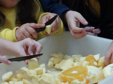 As turmas de Jardim 3 prepararam uma saborosa Salada de Frutas durante a apresentação da letra S....