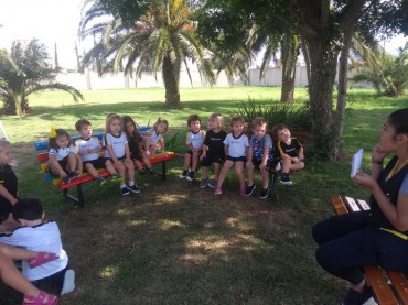 Nossos pequenos do Maternal aproveitaram a área verde para ouvir uma história inspiradora sobre saúde bucal. ...