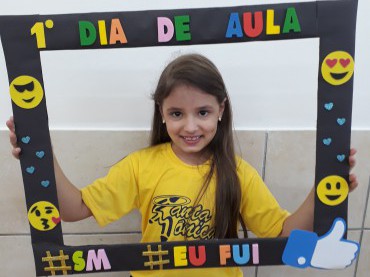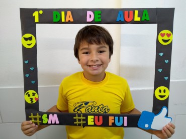 Os alunos da turma 34, professora Haidi, posaram para fotos com molduras super divertidas e coloridas para registrar a alegria do primeiro dia de aula! ...