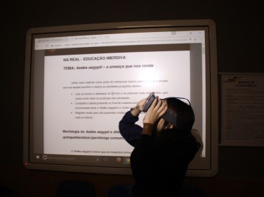 A turma do sexto ano teve aula de educação imersiva no laboratório de informática, utilizando o óculos...